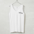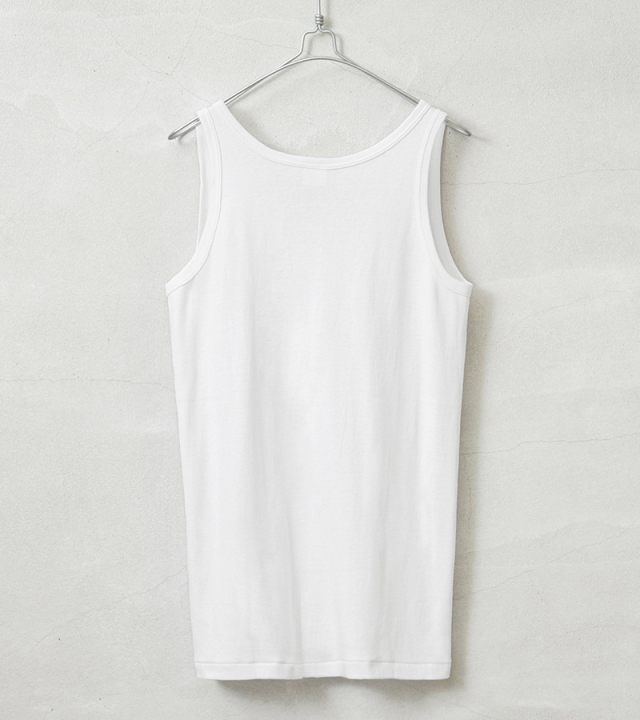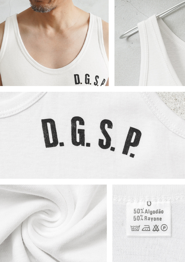 今は廃止されている警察の中心機関であった治安総局を意味する「D.G.S.P.」の文字が入ったシンプルなタンクトップ。 素材には吸水性や通気性の高いコットンと、柔らかくしっとりとした触り心地の良いレーヨンを合わせた生地を採用。首や肩周りは太めのバインダーを使っているので、着用・洗濯を繰り返した時の伸びやヨレを防ぎます。 シンプルなデザインに、程よく身体にフィットするスッキリとしたシルエットはデイリーユースとして使い勝手のよいアイテムです。 |