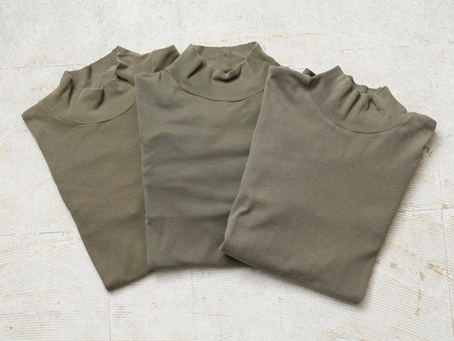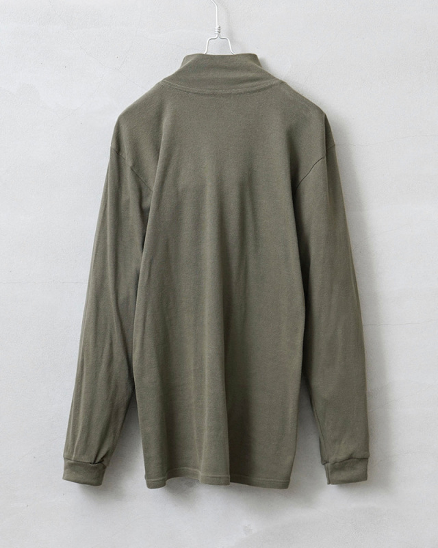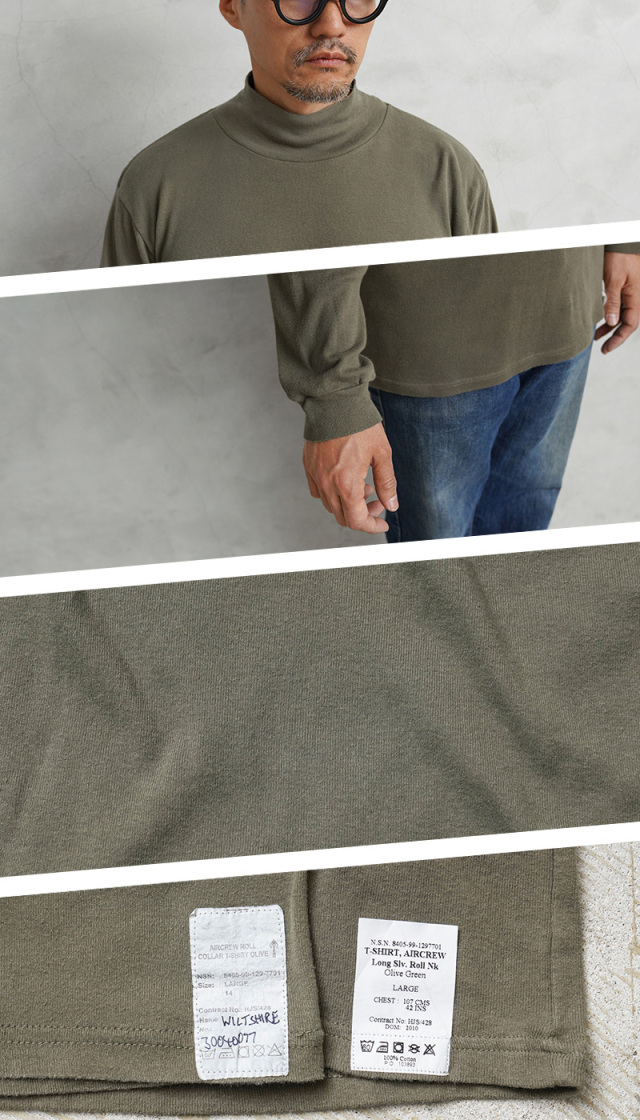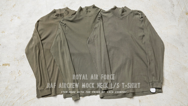 | 商品説明 | 実物 USED イギリス軍 RAF(ROYAL AIR FORCE)AIRCREW モックネック L/S Tシャツのご紹介です。 制式名称:T-SHIRT,AIRCREW Long Slv. Roll Nk イギリス空軍でAIRCREW(航空乗組員)が軍用機のコックピット内の厳しい環境でも快適に着用できるように開発された制式名称はROLL NECKやROLL COLLARという名称のL/S Tシャツです。 ロールネックの名の通り折り曲げて使用することもできますが、モックネックのようにそのまま着用いただくのが雰囲気良く着ていただけると思います。締め付け感のない首元でレイヤードにも適した汎用性の高さが魅力。 コットン100%の肌触りの良さに加え、横方向に伸縮性の高いフライス生地を使用していますので袖も身頃も快適な着心地でベースレイヤーにも適したアイテムです。 |