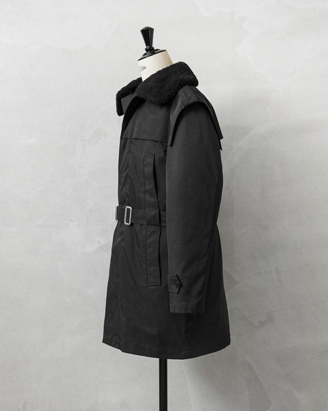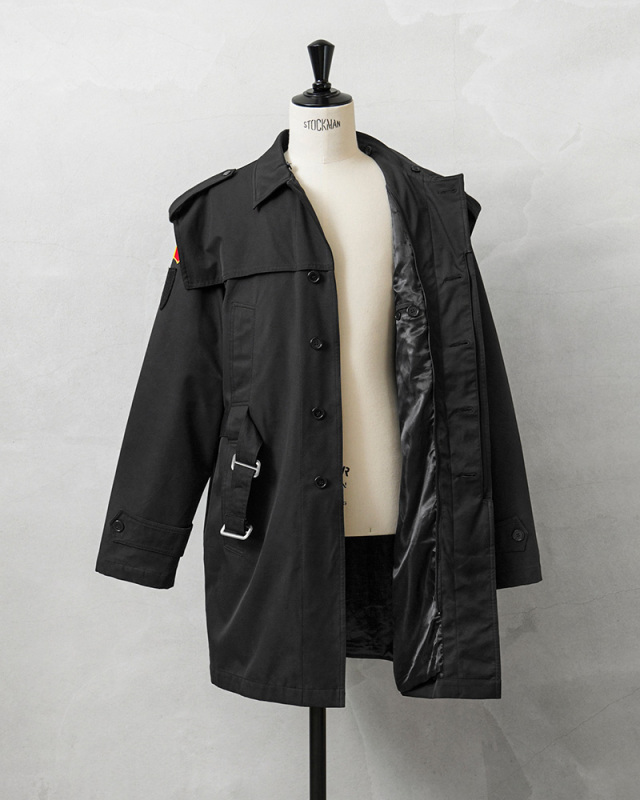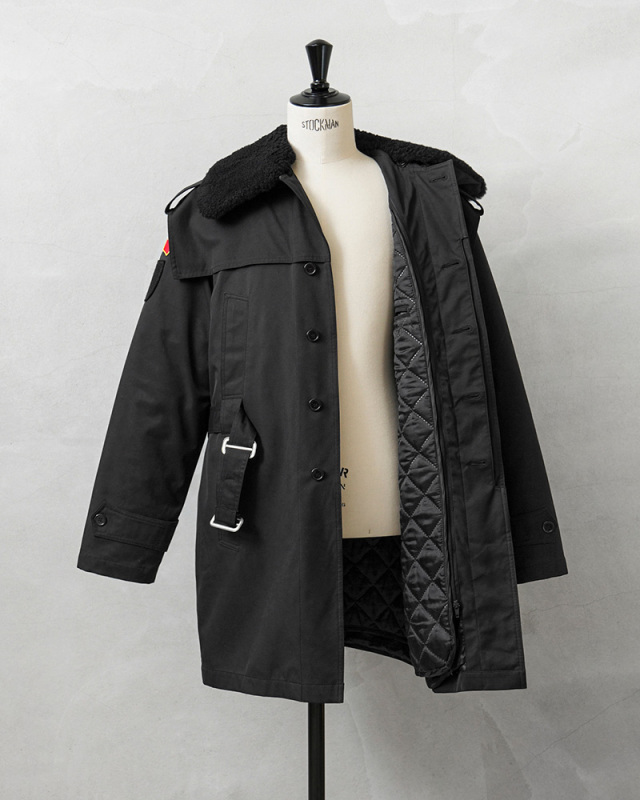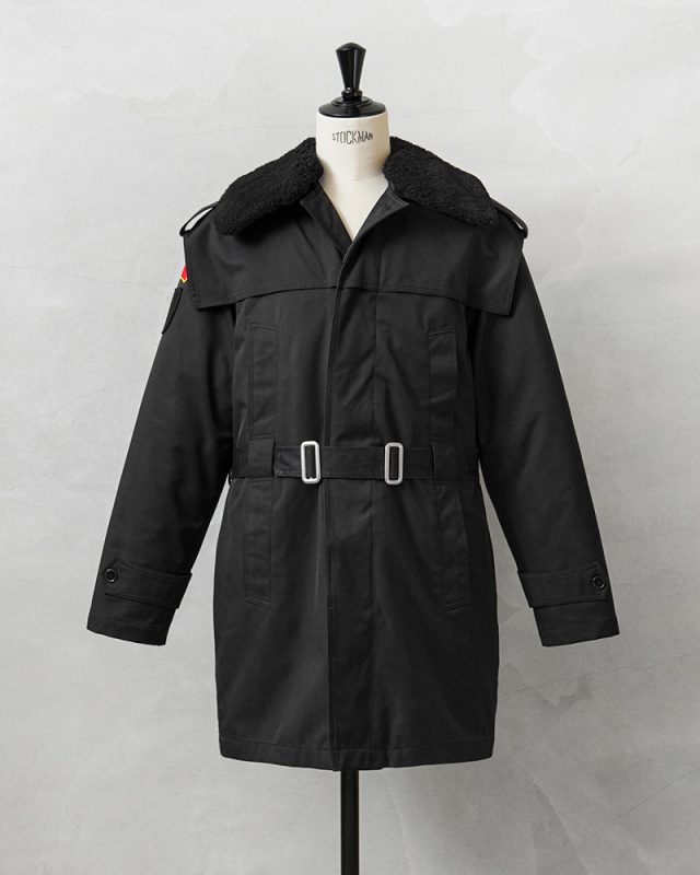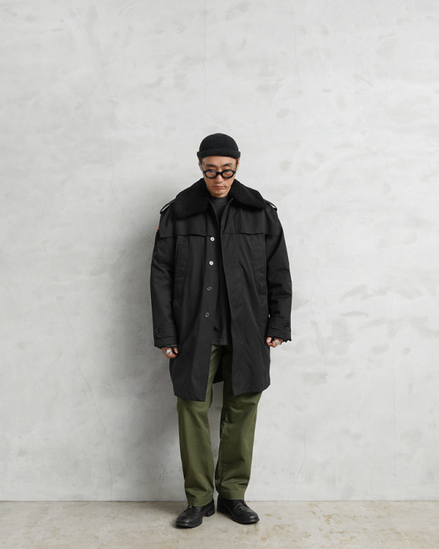 | 商品説明 | 実物 USED ルーマニア海軍 BOA COLLAR オフィサーコート ライナー付き ブラックのご紹介です。 ルーマニア海軍で式典などで現在も着用されているオフィサーコートが入荷しました。 将校、下士官や海軍士官学校でも着用されている伝統的な雰囲気を漂わせる1枚です。 シングルブレストにトレンチコートスタイルのベルテッド仕様で、メタルバックルが使用されており、取外し可能なウエストベルトの締め具合によって様々なスタイルが楽しめます。 フロントの胸とウエスト部分に縦に並んだ計4箇所のハンドウォーマーポケットが特徴的なディテールで、肩の前後にはアンブレラヨークが備わっていますので、雨が染み込みにくくなる役割を果たし、水が下に滴り落ちるようにデザインされています。 襟元にはムートンボアのような上質感のある取外し可能な襟ボアが付属しており保温性を高めます。さらにコートの内側にはキルティングライナーが付属しています。ライナーを外すと光沢のある滑らかなライニングが袖を通す際にもスムーズで快適な着心地。 必要に応じて着脱が可能な仕様になっていますので春先や秋口はコート単体をシンプルに羽織るスタイルで、冬場にはライナーと襟ボアのフルセットで着用すれば防寒性も抜群の優れたコートです。コットンのような見た目ですが、斜めへの伸縮性に優れた素材が使用されているのもポイントです。 放出自体が少ない希少アイテムでありながら、そのデザインも独創的でルーマニア軍らしさを感じさせます。人と被らないオーセンティックでトラッドな着こなしのできるコートをお探しの方にもおすすめです。気温変化の激しい季節の変わり目や真冬にも最適なオフィサーコートです! | |||||||||||||||||||||||||||||||||||||||||||||||||||||||||||||||||||||||||||||||||||||||||||||||||||||||||||||||||||