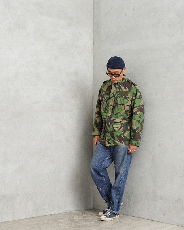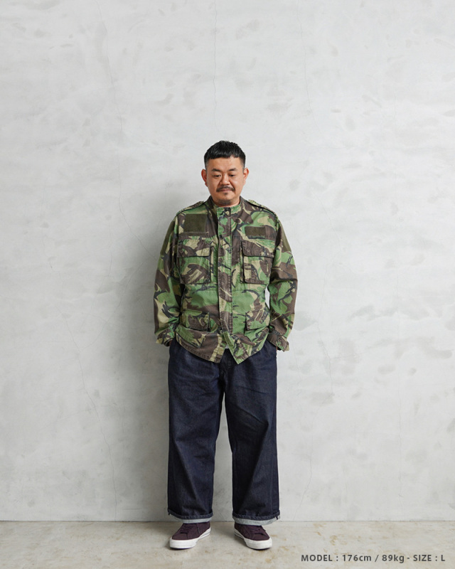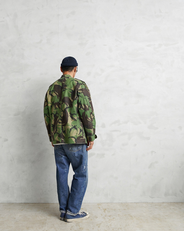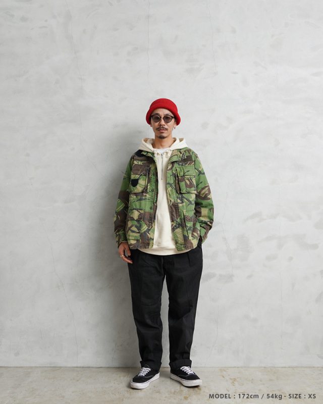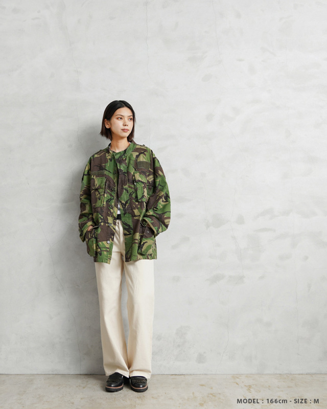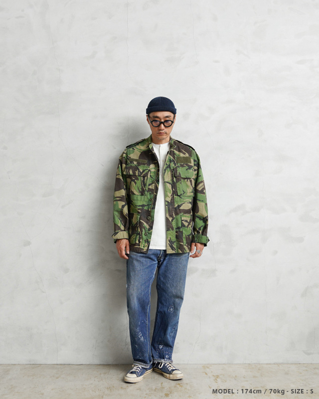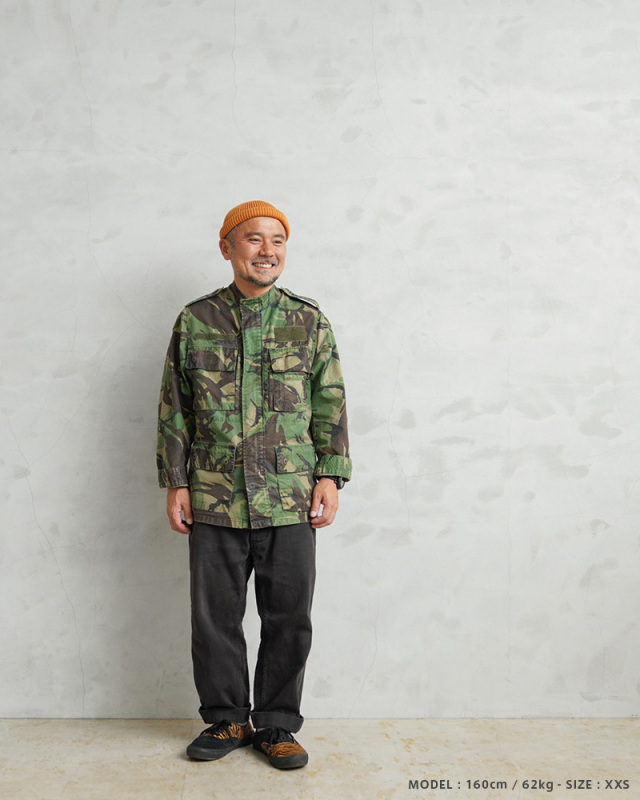 | 商品説明 | 実物 USED ポルトガル軍 リップストップ フィールドジャケット DPMカモのご紹介です。 80~90年代にポルトガル軍で採用されたDPMカモフラージュ(Disruptive Pattern Material)は、世界中の多くの軍隊でも採用されているウッドランドパターンを使用したカモフラージュ柄のデザインです。 スタンドカラータイプのデザインが新鮮で、表面に波状の凹凸があるシアサッカーのような素材感のリップストップ生地が使用されていますので、薄手で軽量、肌との接地面が少なく、清涼感や通気性に優れ、サラッとした肌触りで見た目も涼しげなことから、オールシーズン使えるジャケットです。 ジッパーとボタンで開閉する比翼仕立ての前立てに、4つの立体的なフラップポケット、胸部分には縦に開閉するジッパーポケットが2つ、左胸のポケットの外側には小型のポケットが備わっており、計7箇所のポケットが付属したデザインとなっています。 胸や袖には様々なカラーや形状のベルクロが付属しています。涼しげな襟元のデザインなので、暖かい季節でも軽くロールアップしてシャツ感覚で着ていただくとDPMカモがアクセントとして映えますし、洗濯などで縮むこともなく、シワにもなりにくいタフな素材なのでアウトドアなどでも活躍する万能なジャケットです! |