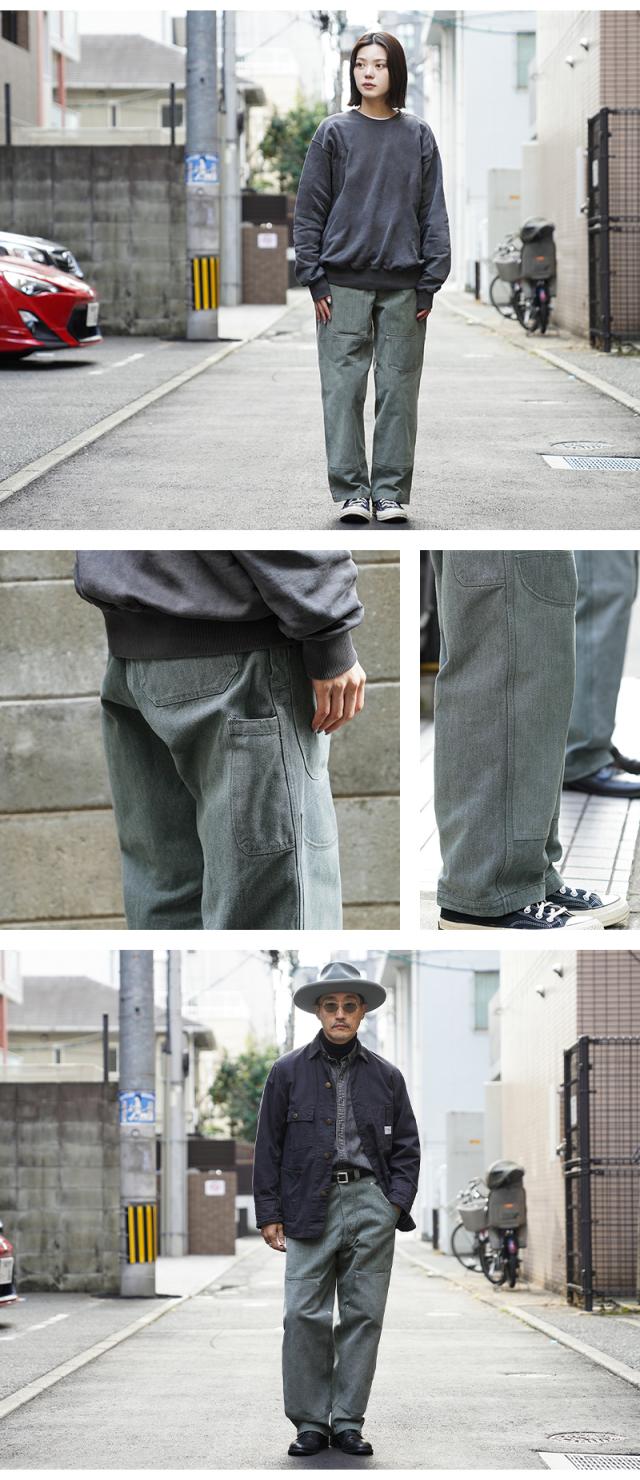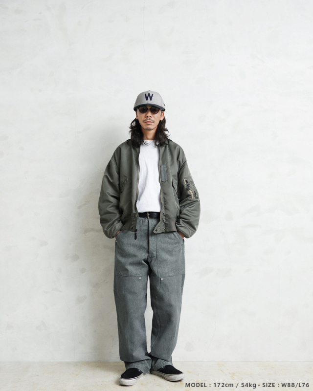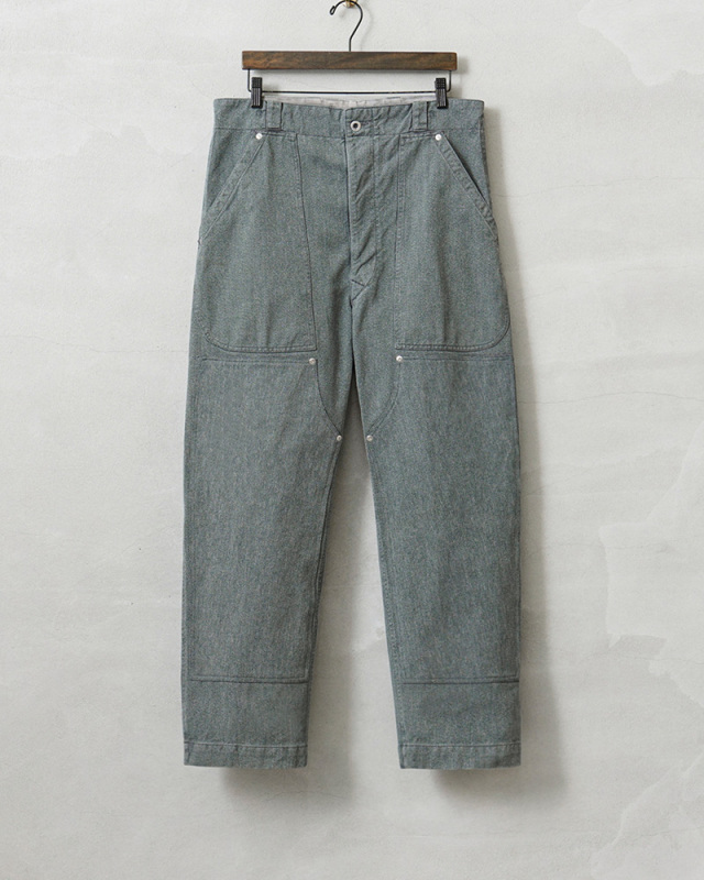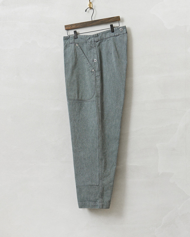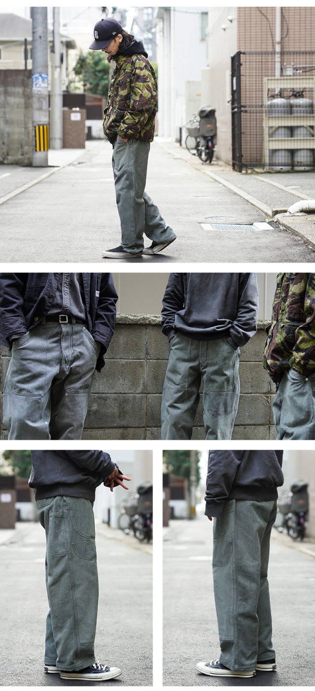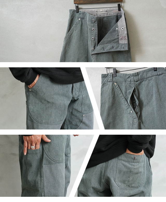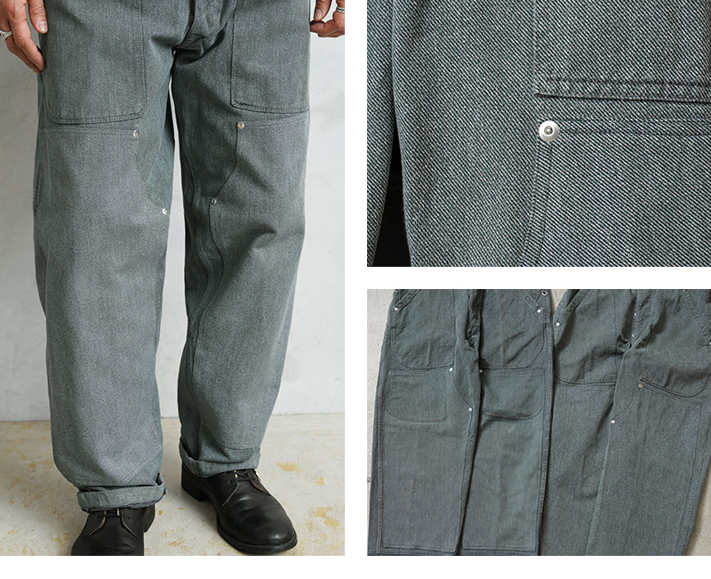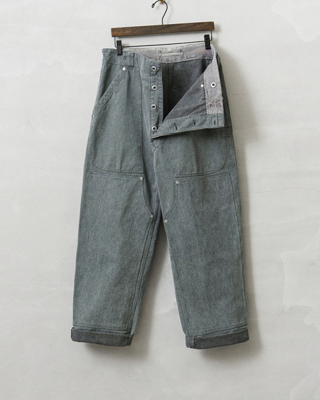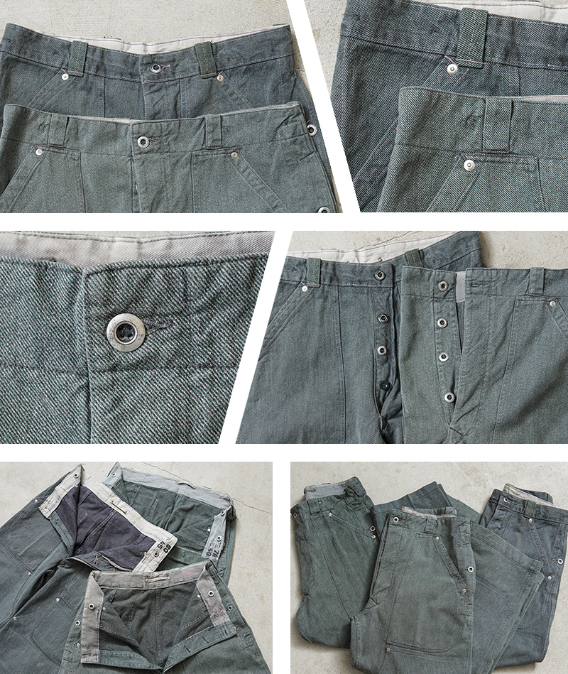 スイス軍のデニム素材のユニフォームは30年代ごろから存在が確認されており、こちらのタイプは主に1950年代以降から採用されていたものになります。この希少なデニム素材のワークパンツを使用し、WAIPER.incでリメイクを施しました!王道ワークブランドにも引けを取らない、膝部分が2枚仕立てになっている「ダブルニー」を追加!負荷のかかる部分はリベットで補強、フロントのパッチポケットにもリベットが追加されたペインターパンツ仕様のリメイクアイテムです!年代によってボタンに違いがあり、こちらはアルミニウム製のボタンが採用された通称前期型となります。ブルーやグリーンがかった絶妙な色合いのグレーのデニム素材を使用。一般的なインディゴジーンズとは一味違った雰囲気のあるカラーが特徴です。