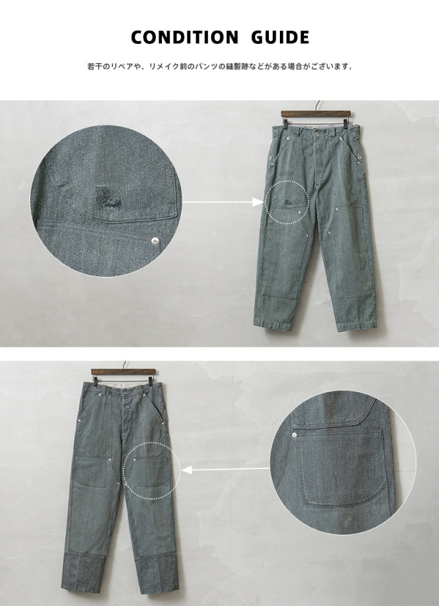 ※USED品を使用したリメイクの為、1点1点異なる絶妙な色落ち、アタリ感や若干の汚れやリペアなどがございます。数字などのマーキングは様々な箇所にされており多少の汚れや傷、リペア痕や継ぎ接ぎ、アルミボタンと樹脂ボタンの混在などもございます。また、仕様やタグが入荷時期による若干の違い、サスペンダーボタンや一部ボタンの欠損・付け替え、ウエスト部分にゴムが内蔵され伸縮するタイプもございます。使い込まれたような雰囲気も抜群で、それぞれから味のある1点物のような魅力を感じていただけるアイテムです。商品の状態についてご指定いただくことは出来ませんので予めご了承ください。