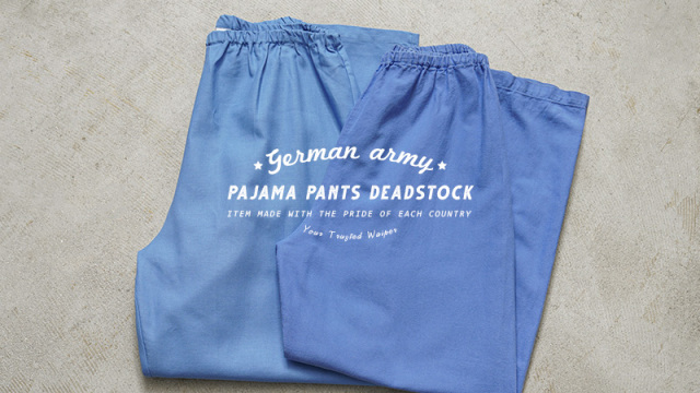 | 商品説明 | 実物 新品 デッドストック ドイツ軍 パジャマパンツ ライトブルーのご紹介です。 ドイツ軍において1970年代頃よりパジャマとして着用されているアイテムです。就寝時だけでなく、宿舎などで余暇を過ごす際にも着用されており、いわばルームウェアのような存在の一着。 本来はドイツ軍のパジャマですが、ゆったりとしたシルエットなのでイージーパンツとしても着用いただけます。締め付けのきつくないウエストゴムが入っていますのでストレスを感じずにリラックスして穿ける作りです。 軍モノらしさを感じさせない爽やかなカラーが特徴的。肌触りの良いコットン100%のツイル素材が使用されていますが、着ていくうちに生地の表面が微起毛していくことで風合い良く長くご使用いただけます。 男女問わず気軽に取り入れられる一押しのパジャマパンツです。 |