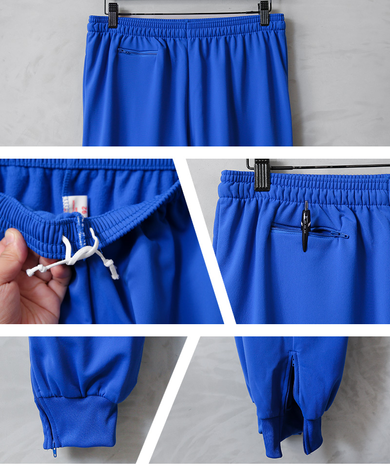 ウエストにはドローコードとゴム内蔵で伸縮しフィット感を高める仕様。フロント右側に、鍵やIDカードなど外出に必須で無くしやすい小物を入れておける小ぶりなジッパー付きポケットがあり、トレーニング中も中のものが飛び出さず安心です。裾にはファスナーが付属し、快適な着脱を行えてシルエットに変化を持たせます。