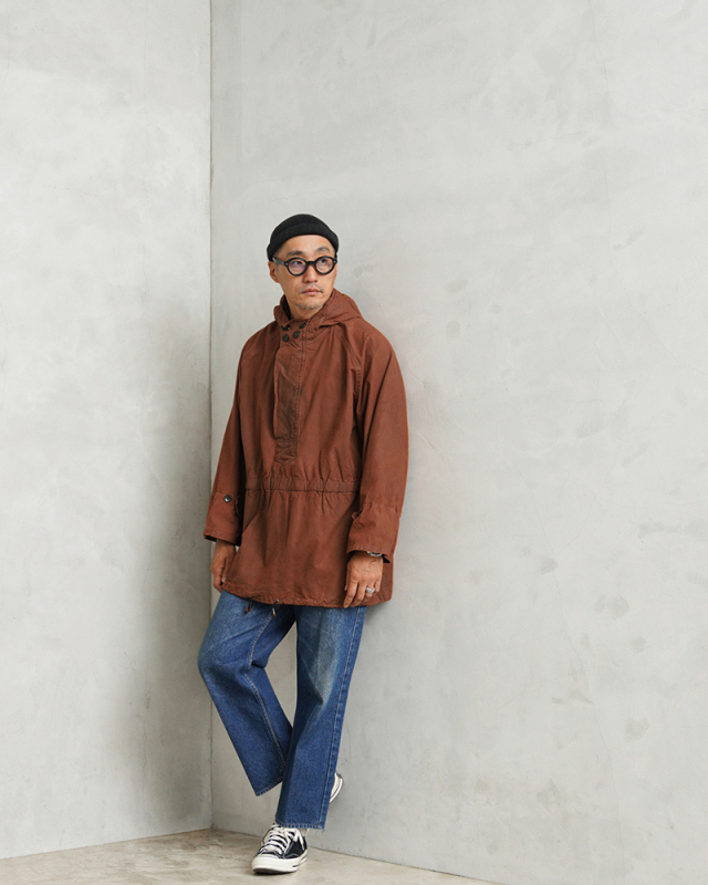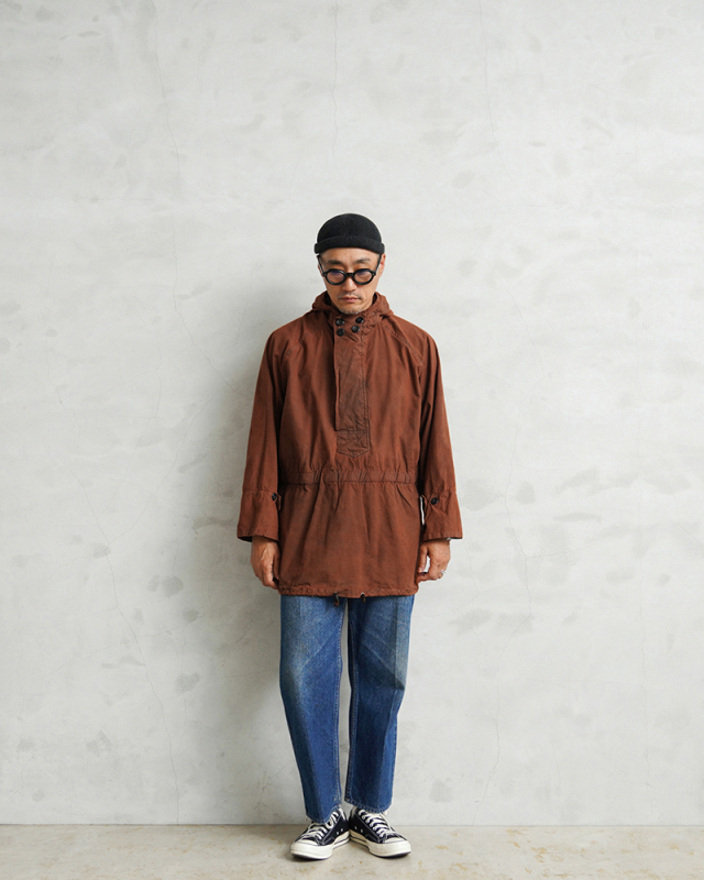 ハンガリー軍にて採用されていた、1970~80年代に製造のアノラック マウンテンスモックが入荷しました。 年代の古いコットンに見られる丈夫で耐久性のある質感の平織りのコットンが使用されています。 ブラウンカラーにオーバーダイ(後染め)がされていますが、放出された後にヨーロッパ本国で製品染めが施されたアイテムです。後染め特有の独特な雰囲気は、コーディネートによってはクラシカルな雰囲気に仕上がったり、ラギットな印象も与えてくれる万能な一枚です。 フード付きのプルオーバータイプのスモック。首元はボタン留めすることでボリュームを出すことができ、ボタンを外すと前立ての内側がレースアップ仕様となっています。そしてウィンドフラップが付属、ドローコードも備わった特徴的なディテールになっていますので首元を見せるように着ていただくと雰囲気の良いデザインです。 ウエスト部分はゴムシャーリングでフィット感を高めています。裾にもドローコード付きでシルエットに変化をもたせた着こなしができます。袖口部分はスノーパーカーなどでよく見かけられる3つボタン仕様、ゆとりのある袖口で内側はインナーカフス仕様でゴムで伸縮します。 シンプルになりがちなコーデのアクセントにぴったりなカラーに、ハンガリー軍というデザイン性に優れたアイテムの多い国からの放出自体が希少なスモックです。 |