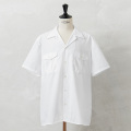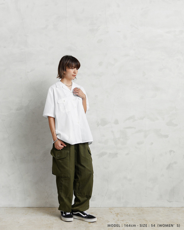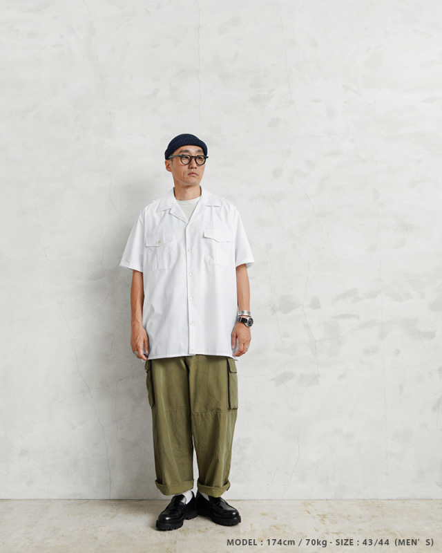 | 商品説明 | 実物 新品 デッドストック フランス軍 MARINE NATIONALE ショートスリーブ ホワイト シャツのご紹介です。 フランス海軍で使用されるオープンカラーのホワイトシャツです。素材やディテールが若干異なるものの、伝統的に着用されているシャツで、1990年代頃のアイテムが中心に入荷しています。 前合わせの異なるメンズ、レディース仕様があり、レディースの身幅広めで若干ショート丈なサイズがお好みの男性にはぜひ、レディース仕様をあえて着ていただくのもおすすめです。 ボタン留めできるボックスプリーツのフラップポケットが両胸に配置されたシンプルなデザイン。ボタンには生成り系の高級感のあるボタンが使用されています。 肩には肩章用のループが付いていますので、エポレットとはまた違う雰囲気で、アクセントになっています。耐久性が必要な背面のヨークは二重に補強が施されており、フラットな裾はタックインでもタックアウトでも着れるデザインになっています。 コットン、ポリエステルを使用した程よくハリのある風合いで、速乾性があり、シワになりにくいイージーケア素材を使用。ゆったりとしたシルエットで今っぽく着れるオーセンティックな作りのホワイトシャツです。 |