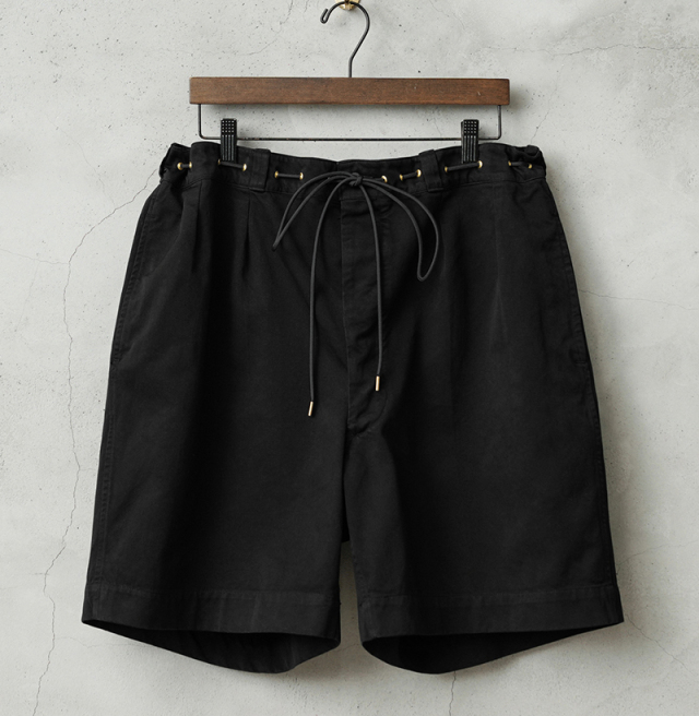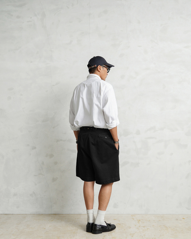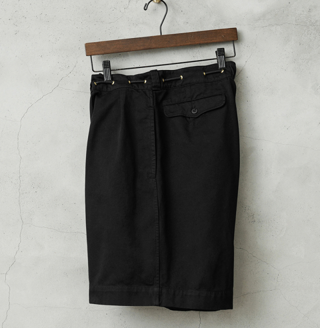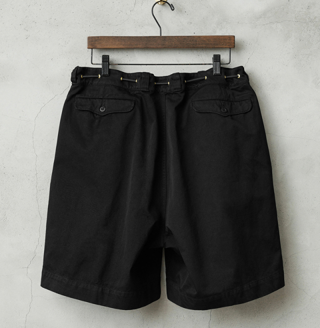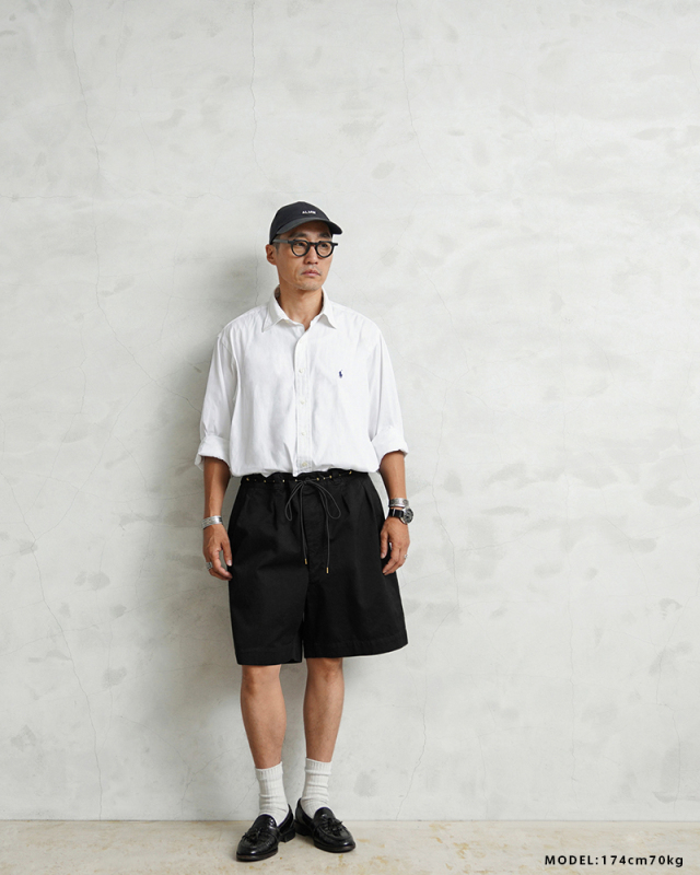 | 商品説明 | WAIPER.inc 実物 フランス軍 M-52 チノショートパンツ ツータック Remake by ”KOUHEI TERRAI” のご紹介です。 フランス軍にて1950~1960年代に採用されていた名作”M-52 チノトラウザー” こちらはレングスをカットしたものではなく、オリジナル丈のショートパンツモデルとなっており、ウエストのタック、バックポケットのフラップ、ボタンフライなどディテールはほぼ同じ仕様ですが、まったく異なるスタイリングを楽しんで頂けるアイテムです。 元々カーキだったものを染め職人に丁寧にBLACK染めしていただくことで、より多くのコーディネートが楽しめる仕上がりに。 さらにビッグサイズのパンツをベースに、ウエストをドローコード仕様にリメイクすることでサイズの調整が可能になり、ビッグサイズならではの大胆なワイドシルエットが気軽に楽しめるようになりました。 カジュアル感がプラスされ、ハトメを配置することによってタックインで着用した時のデザイン性も良く、トップスに合わせて穿きこなしの雰囲気を変えることができます。 深めの股上に、両サイドポケットとフラップ付きのバックポケットが配置されたオーソドックスなデザイン。シンプルで使い勝手が良くカジュアルシーンはもちろん、レザーシューズと合わせることで上品な印象に。 ゆったりとしたシルエットで着心地も良く、タックインスタイルもおすすめなミリタリーショーツです。 |