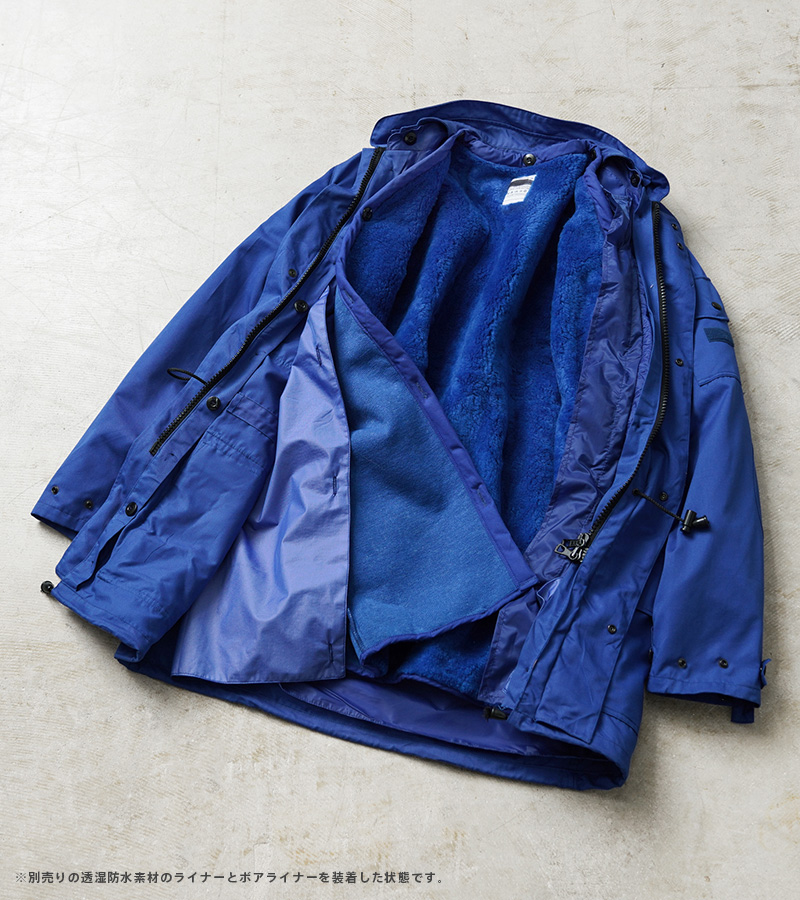 本来、このジャケットの下に「オランダ軍 CIVIL DEFENSE WATERPROOF ブリーザブル ライナーコート」と、「オランダ軍 CIVIL DEFENSE ボアライナー」を装着することでフルセットでの着用ができ、防寒性、防水性に優れたアウターへとアップデートさせることができるアイテムです。