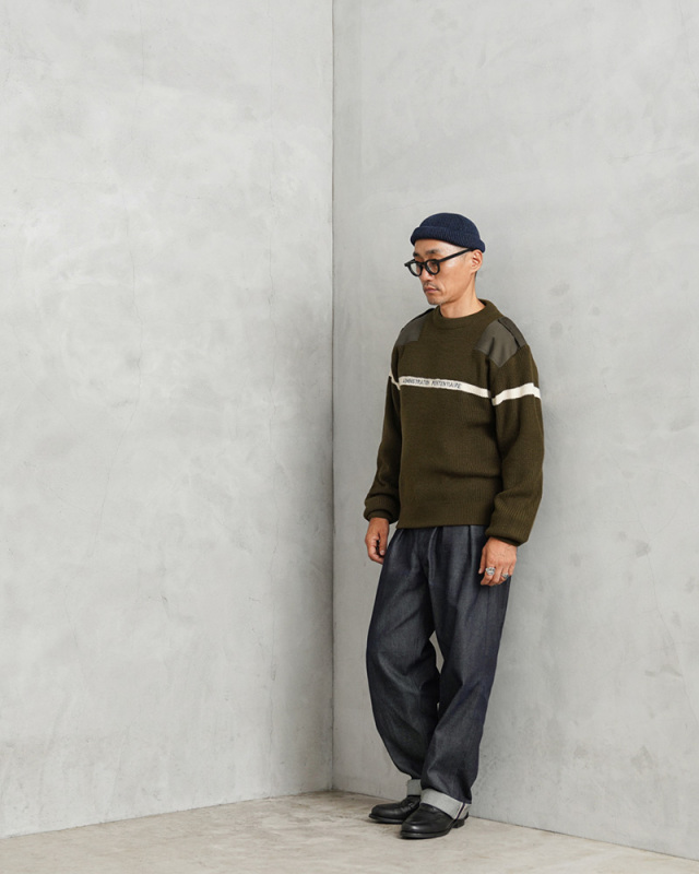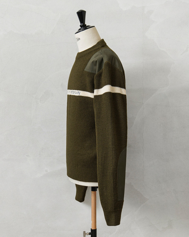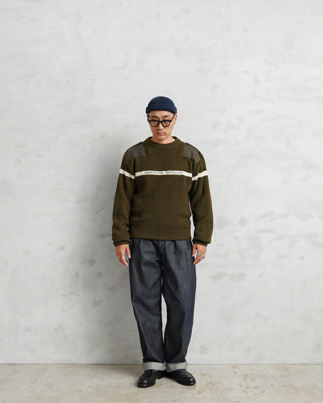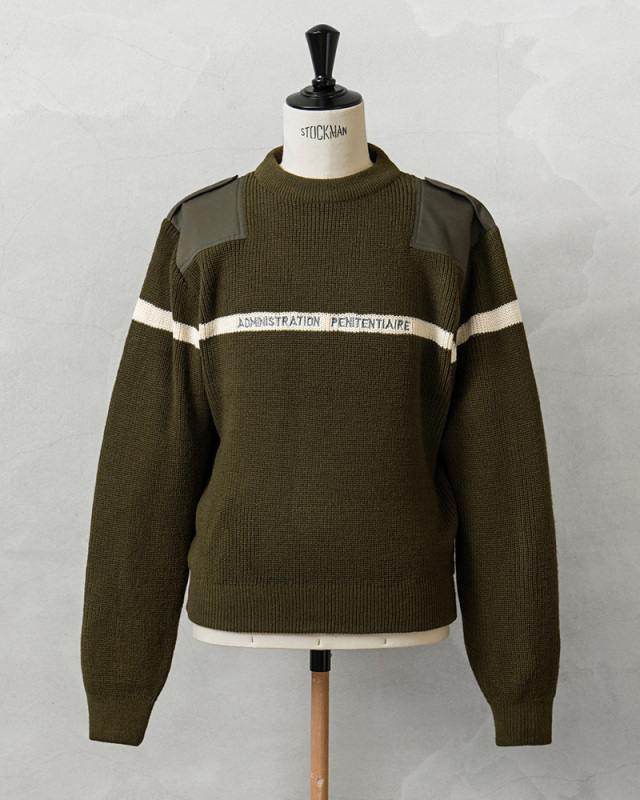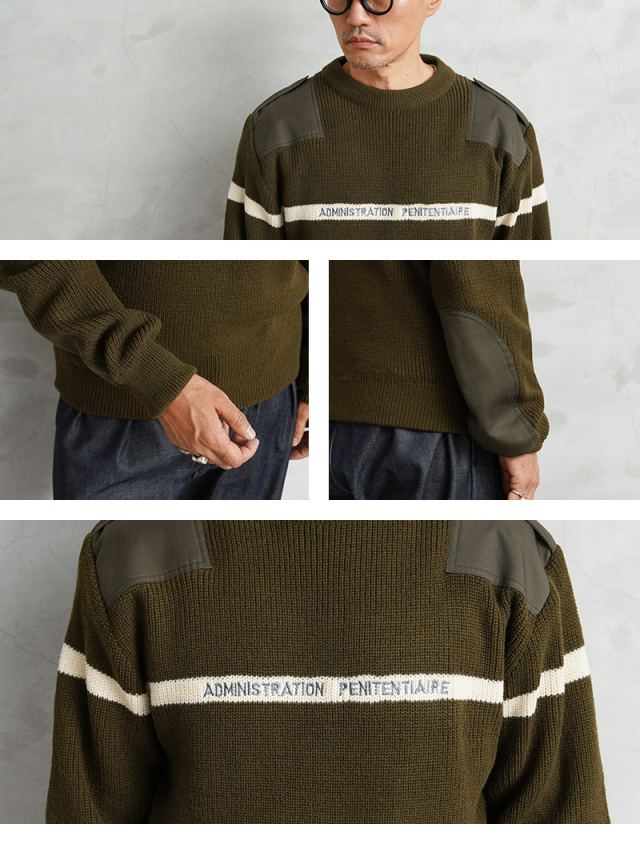 | 商品説明 | 実物 新品 デッドストック フランス軍 プリズン ホワイトライン セーターのご紹介です。 ホワイトのラインが前後にデザインされたローゲージのクルーネックセーターで、フロントには刑務所管理を意味する「ADMINISTRATION PENITENTIAIRE」という刺繍が施されています。 フランス刑務所の看守が着用するトップスやセーターはブルーやネイビー系の為に、こちらのオリーブカラーのアイテムはフランス軍関連施設などで使用される目的で製造されたことが推測されるアイテムです。 このアイテムはフランス軍のストックから放出されたということで、「フランス軍」にカテゴライズしています。肩のあて布、エルボーパッチやエポレットなどミリタリーでは定番のデザインであるコマンドセーターのディテールが肩や肘の毛玉やスレを防ぎ、機能的に長くご愛用いただける仕様です。 首元や袖口、裾のリブが品質の良さを実感できる部分で、乗せ付けのパイピング始末がされた首元は肉厚なリブが適度な伸縮性と理想的なフィット感を生み出しています。袖口や裾は長めのリブで製造し、折り返して縫製されることで厚手のリブになり保温性を高めます。 保温性が高く、丈夫で長持ちするアクリルニットが使用された、上質で希少なセーターです! |