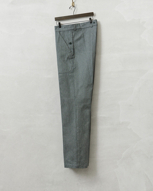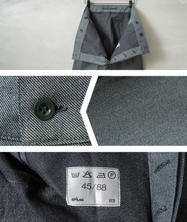 ほぼUSEDで放出されることしか無いスイス軍のデニムワークパンツですが、数千本の中から稀に少量見つかる後期型の未使用デッドストック!その希少なアイテムをお届けします!スイス軍のデニム素材のユニフォームは30年代ごろから存在が確認されており、こちらのタイプは主に1980年代以降から採用されていたものになります。年代によってボタンに違いがあり、こちらはプラスチック製の樹脂ボタンを採用した通称後期型となります。