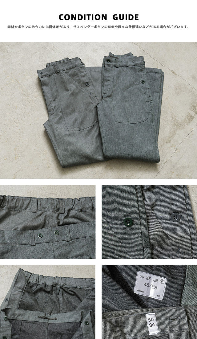 ※素材やボタンの色合いには個体差があり、サスペンダーボタンの有無や様々な仕様違いなどがある場合がございます。商品の状態についてご指定いただくことは出来ませんので予めご了承ください。