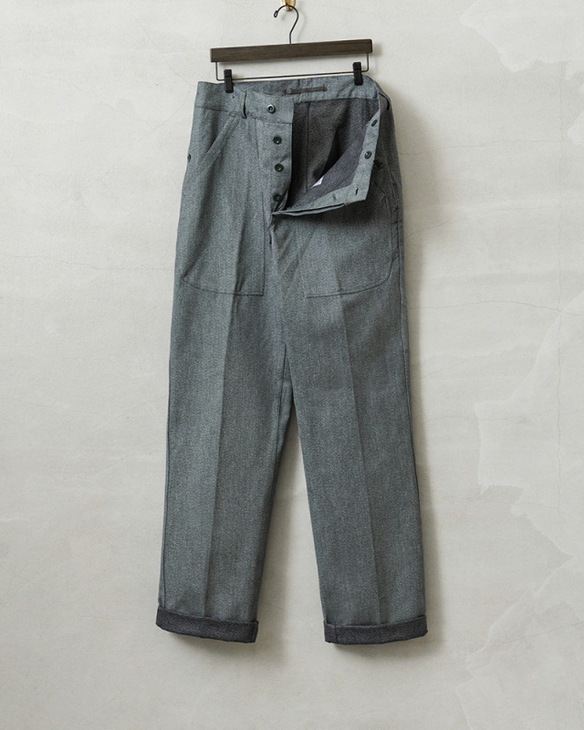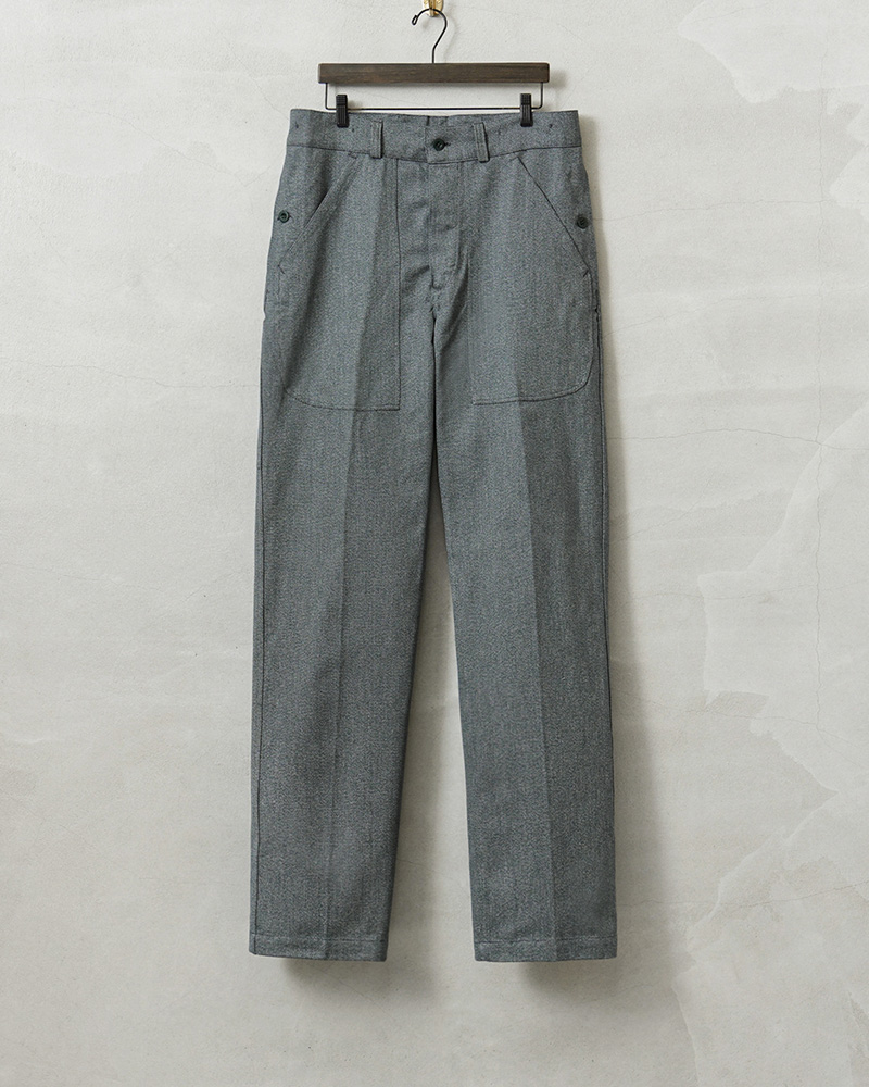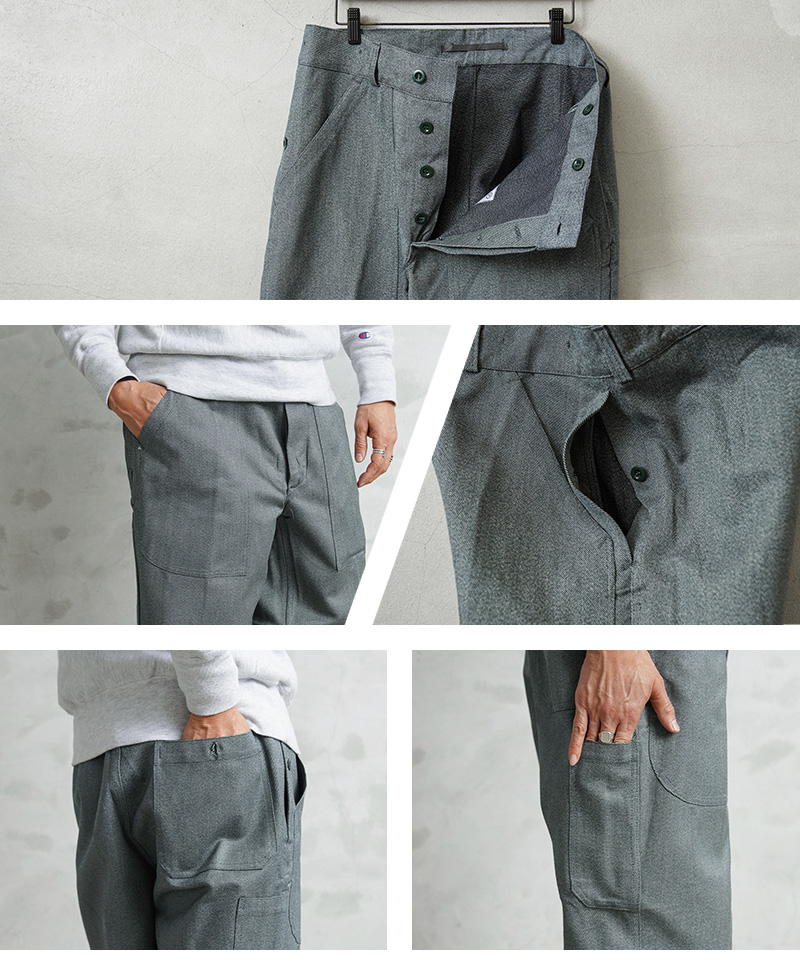 | 商品説明 | 実物 新品 デッドストック スイス軍 1980年代 後期型 ヴィンテージ デニムワークパンツのご紹介です。 ほぼUSEDで放出されることしか無いスイス軍のデニムワークパンツですが、数千本の中から稀に少量見つかる後期型の未使用デッドストック!その希少なアイテムをお届けします! スイス軍のデニム素材のユニフォームは30年代ごろから存在が確認されており、こちらのタイプは主に1980年代以降から採用されていたものになります。 年代によってボタンに違いがあり、通称前期型と呼ばれたアルミボタンタイプのものに対し、こちらはプラスチック製の樹脂ボタンを採用した通称後期型となります。前期型と素材やシルエットに大きな差はなく、ブルーやグリーンがかった絶妙な色合いのグレーのデニム素材を使用。一般的なインディゴジーンズとは一味違った雰囲気のあるカラーが特徴です。 セットアップでユニフォームとして着用されるアイテムですが、使い勝手がよく堅牢なヘビーオンスのデニムは、脇にスケールポケットが備わっていることもあり、作業服や囚人服としても着用されていたと言われています。 フロントの両サイドにはベイカーパンツの様な大きなポケット、さらに脇部分には貫通式のポケットを配置。一枚での着用はもちろん、オーバーパンツとしても着用可能です。 長い期間着用が続けられていたということで、タフな印象を裏付けるスイス軍を代表する一本。クラシカルなディテールに独特な色合い、ゆったりとした太もも周りから裾にかけてやや細くなるキレイなテーパードシルエットは、様々なコーデにマッチするアイテムです。 世界的に見ても入手困難なデッドストックです!お見逃しなく! |