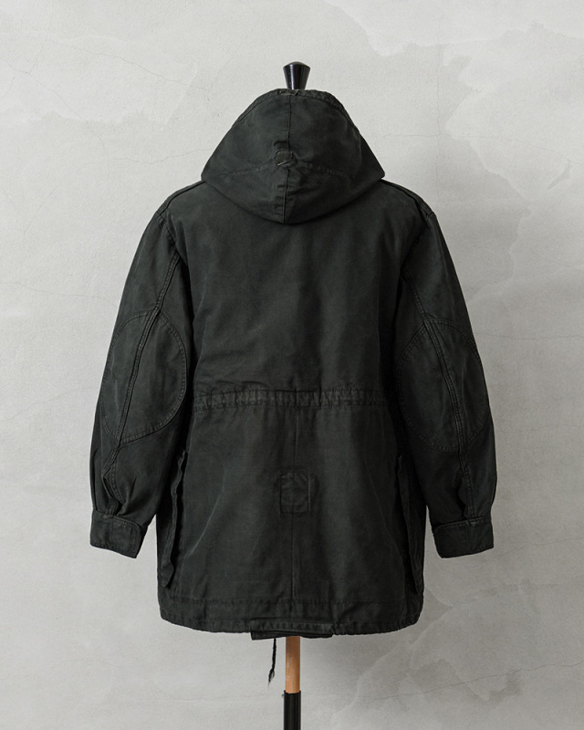 | 商品説明 | 実物 USED ベルギー軍 M-64 AIR FORCE フーデッド フィールドジャケット DARK GREEN染めのご紹介です。 1964年にベルギー空軍で採用されたフィールドパーカーです。 元々オリーブだった物を染め職人に丁寧にDARK GREEN染めを施していただきました。室内ではブラックに近いカラーに見えますが、屋外でしたらブラックとはまた違うダークグリーンの魅力的なカラーに仕上がっています。 フード一体型でミドル丈のジャケットなので、モッズコートの感覚で着ていただけます!ベルクロとボタンで開閉する比翼仕立てのフロントに、フードにはドローコードとチンストラップ付きで、フード先端と中段あたりにベルクロ付きで調節可能な仕様になっています。 ウエストや裾にはドローコードも付属していますので、シルエット調節も可能です。袖の肘部分はエルボーパッチで補強されており、脇下は蒸れにくいベンチレーションになっています。背面裾には股の間を通して前面で固定できる古い年代のアイテムならではのディテールであるストラップが収納されています。 この年代ならではの厚みのあるコットン、ポリエステル混紡生地で、USEDならではのアタリと染めの相性も良く、クールな雰囲気が感じられます。胸にはペンホルダー付きのスラントポケット、ウエストのサイドポケットと、バックサイドには背中の中心で分割されたゲームポットも付属していますので収納力も抜群です。 中々見つからなくなってきています!いずれ価格の高騰が起きてもおかしくないと思う良いアイテムです。 |