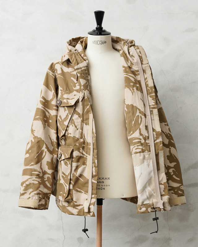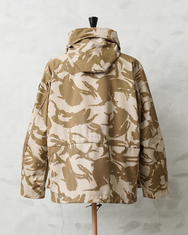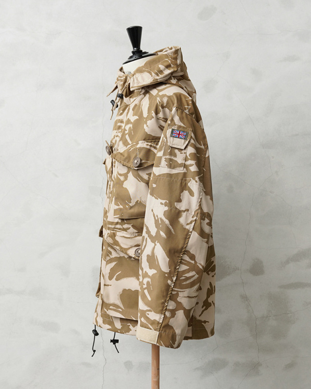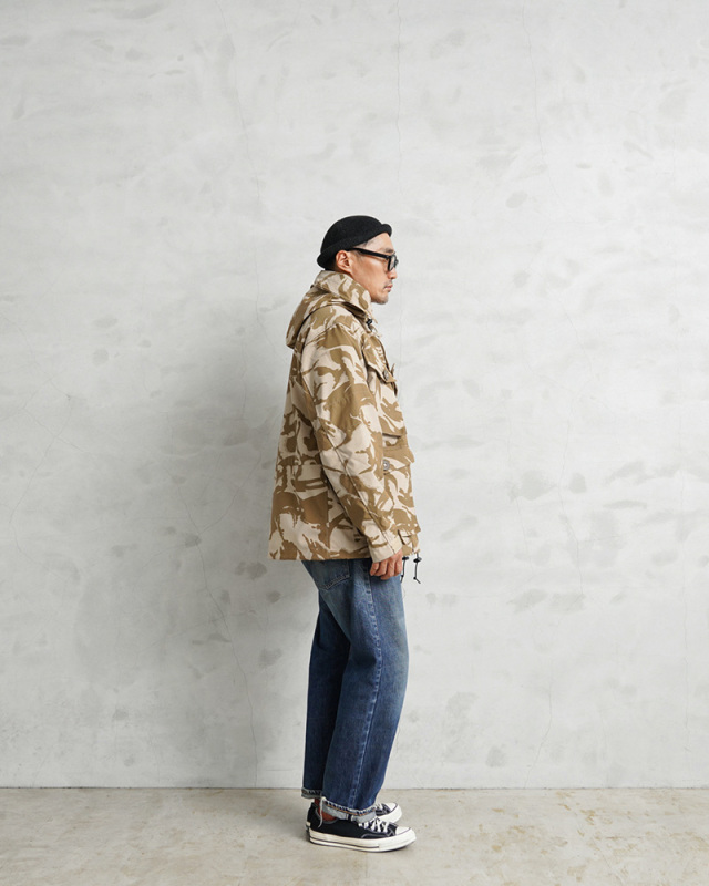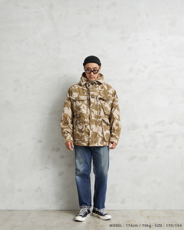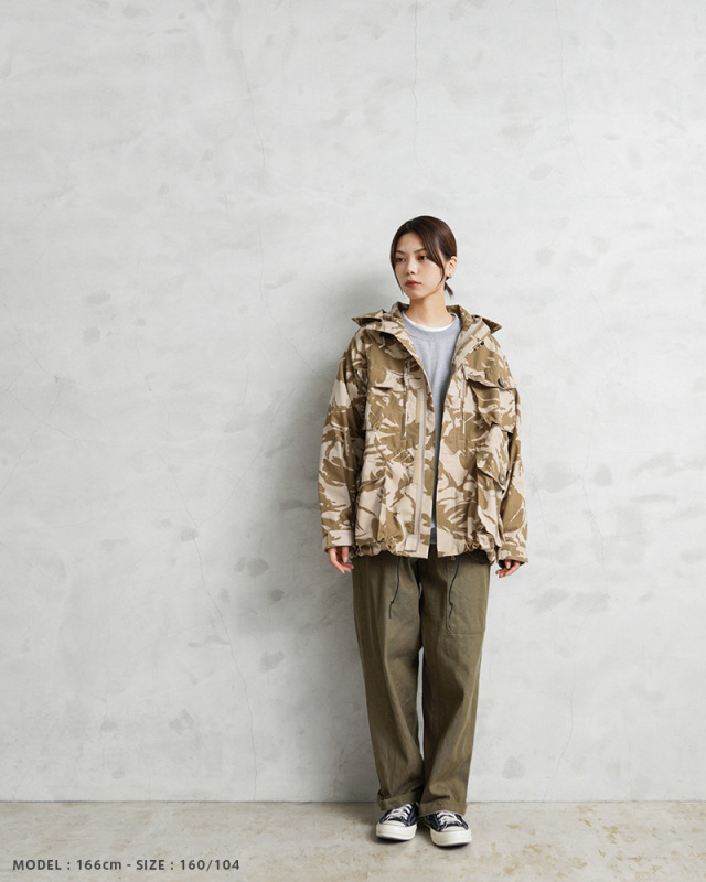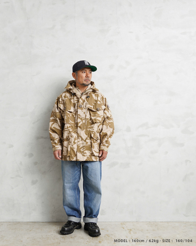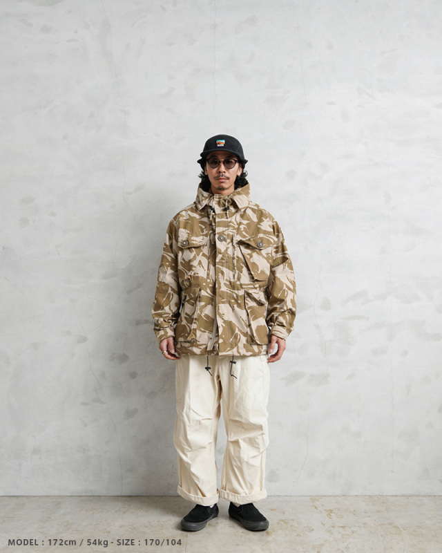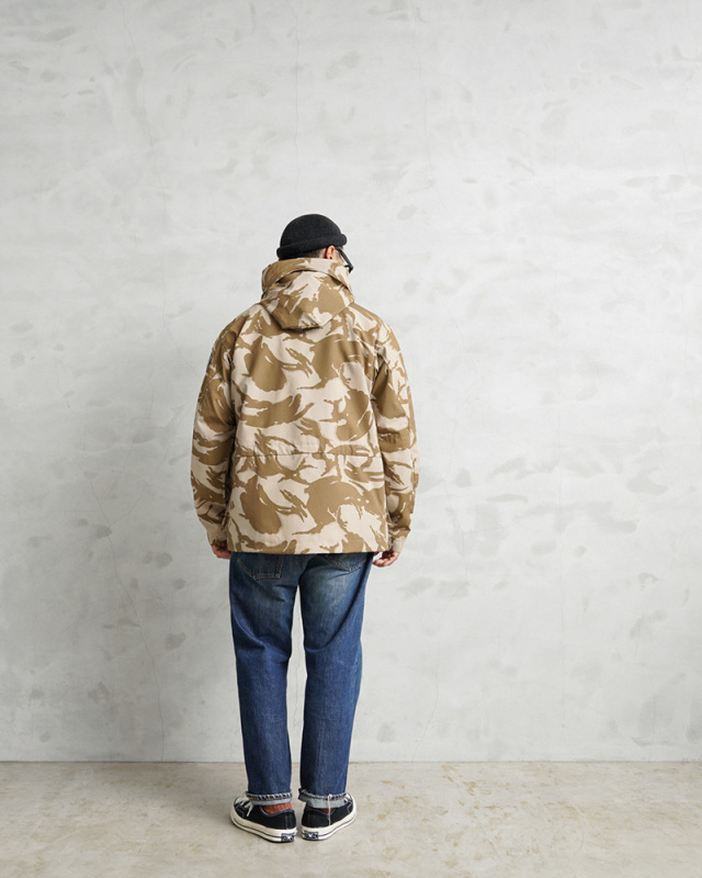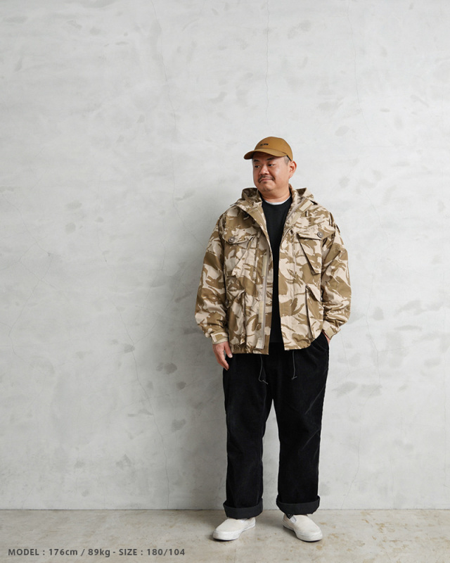 | 商品説明 | WAIPER.inc 実物 新品 デッドストック イギリス軍 WINDPROOF コンバット スモック リメイク ボックスシルエット デザートDPMカモのご紹介です。 イギリス軍より実物放出のウィンドプルーフ コンバットスモックをWAIPER.incでボックスシルエットへとリメイクを施しました! 本来であれば太もも辺りにくる裾部分をヒップにかかるくらいの丈に変更し、それに伴いウエスト部分のポケットも付け直し、ドローコードも再度取り付けています。英国海兵隊やSASなどを始め広く使用されている防風、防寒性に優れている機能的なジャケットの良い部分は損なわず、より気軽に着やすい丈感になっています。 デザートDPMカモは90年代に湾岸戦争の開戦とほぼ同時期に実戦投入された2トーンのベージュ系の迷彩柄です。ベルクロとダブルジッパーで開閉するデザインで、フロントにはマチ付きのボタン開閉のフラップポケットと、縦方向に取り付けられた胸のジッパーポケットの内側にはそれぞれペンホルダーが付属、さらに腰から上の前身頃が大型のポケットとして使用できる大容量ポケットになっています。左袖には小型のユーティリティポケットが備わっている、優れた収納力を持ち合わせたデザインです。 フード先端にはワイヤーが内蔵されていますのでお好きな形状に形を整えてキープすることもできます。フード、ウエストにはドローコード付きでフィット感を調節できる仕様で、袖口もベルクロで調節できます。ボタンにはパラシュートボタン(スロットボタン)が採用されています。 他国にはないイギリス軍の独創的なデザインのコンバットスモックは、タウンユースのみならずアウトドアシーンにも活躍する高機能なジャケットです! |