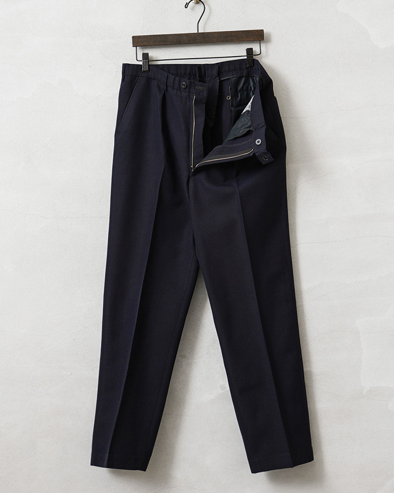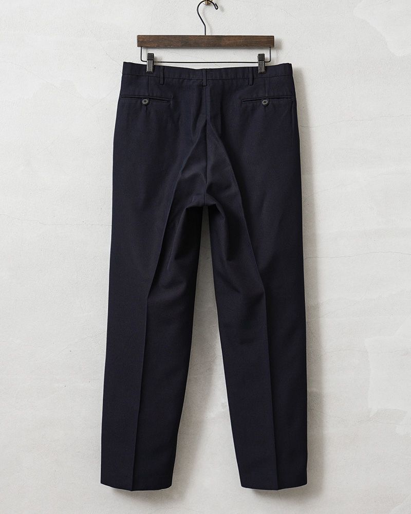 | 商品説明 | 実物 USED スウェーデン軍 ワンタック トラウザーズ DARK NAVY のご紹介です。 スウェーデン軍よりパレードや祭事等の準礼服として使用されている、希少な「M-87」とほぼ同型のウールトラウザーズが入荷しました。 ウールとポリエステルの混紡生地を使用しており、シワになりにくく、サラッとした質感で季節を問わず使える履き心地の良いトラウザーズ。フロントはワンタック仕様で腰回りに程よいゆとりを持たせて、裾にかけてのテーパードがかった綺麗なラインのシルエットになっています。 サイドにはスラッシュポケットと両玉縁のバックポケットが備わっており、センタークリースが入っているので上品な雰囲気も感じさせます。ロック機能が付いた上質なファスナーを使用し、細部に至るまで丁寧に縫製されている美しい仕上がりのトラウザーズです。 濃い目のネイビーにクラシカルでベーシックなスラックスデザイン。デイリーウェアとしてはもちろんですが、冠婚葬祭などの畏まった席でも対応可能で、年齢問わず一本は備えておきたいマストハブな一本です。 |