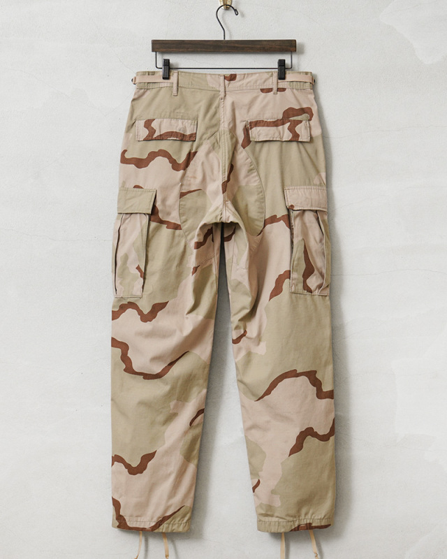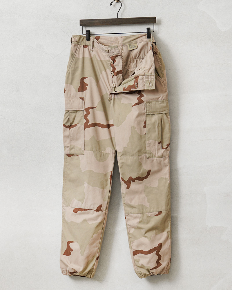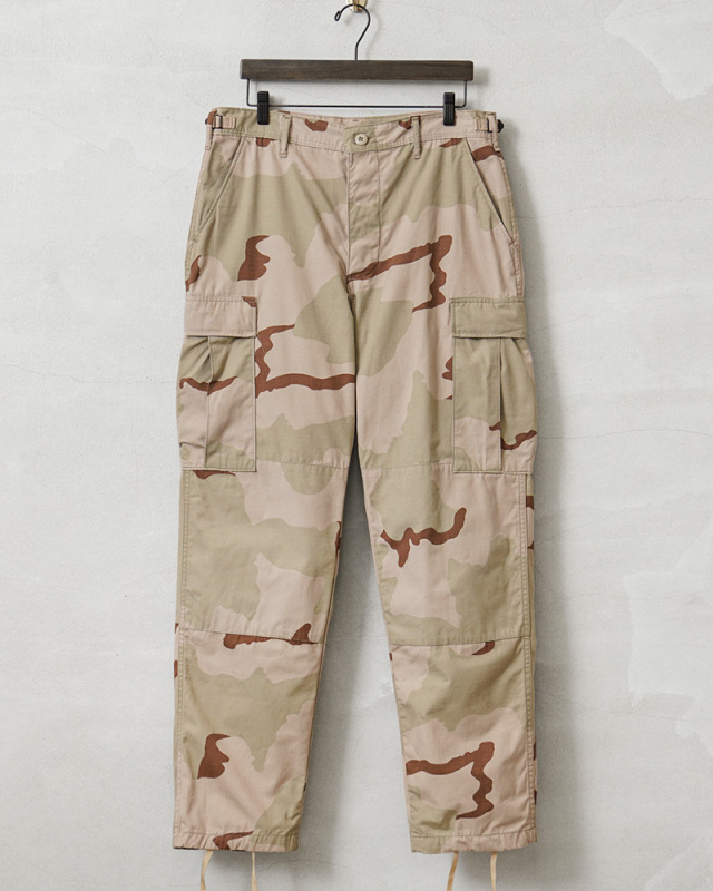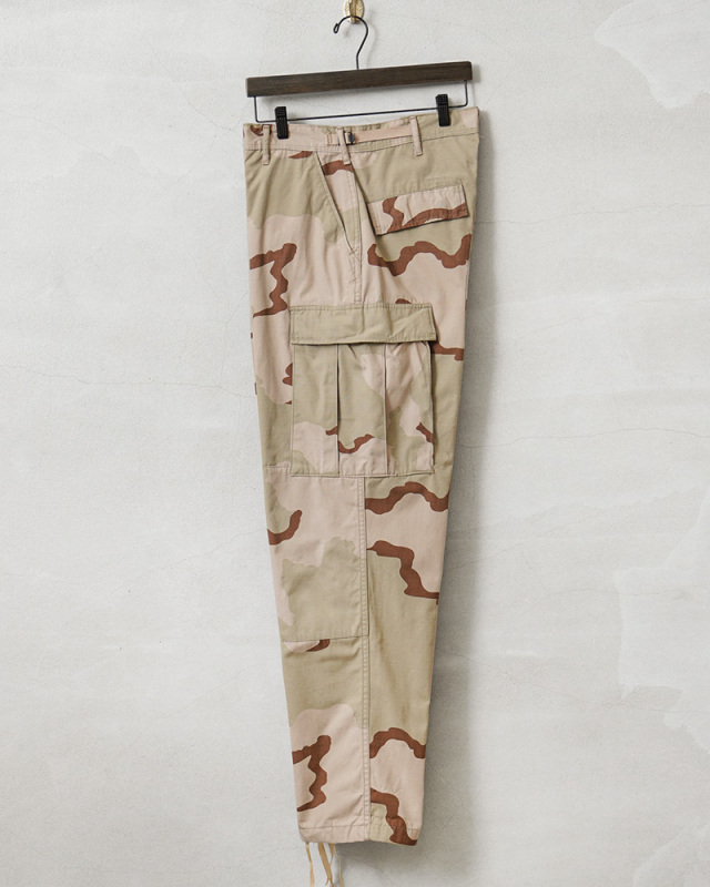 | 商品説明 | 実物 USED 米軍 DCU カーゴパンツ 3カラーデザート リップストップ のご紹介です。 制式名称:TROUSERS,DESERT CAMOUFLAGE PATTERN(3 COLOR);COMBAT 米軍で1990年代に採用された3カラーデザートを使用したカーゴパンツです。 砂漠地帯での作戦遂行にあたり開発、支給された3カラーデザートカモのカーゴパンツで、近年ではその放出数は激減し、入手が非常に困難になってきた1本。 6Cデザート(チョコチップ)カモBDUカーゴパンツの素材やディテールが引き継がれたデザインは、NYCO(ナイコ)と呼ばれるコットン、ナイロンの混紡素材が使用されており、さらに引き裂けに強いリップストップ生地を採用し丈夫に作られています。 フロントはボタンフライ仕様で、ウエスト両サイドのアジャスターで細かい調整が可能で、サイドポケット、バックポケット、カーゴポケットがそれぞれ2つずつ配置された6ポケットデザイン。膝にタックが取ってあるので、膝を曲げた時に突っ張らずに動きやすいのも特徴で、裾にはドローコード入りで調節可能な仕様です。また、摩擦の起きやすいヒップ部分は、補強のための当て布が施されています。 細部まで実用性を追求した本物でしか味わえない風合いと、存在感。穿き込むことにより様々な表情を見せてくれるカーゴパンツです。 |
