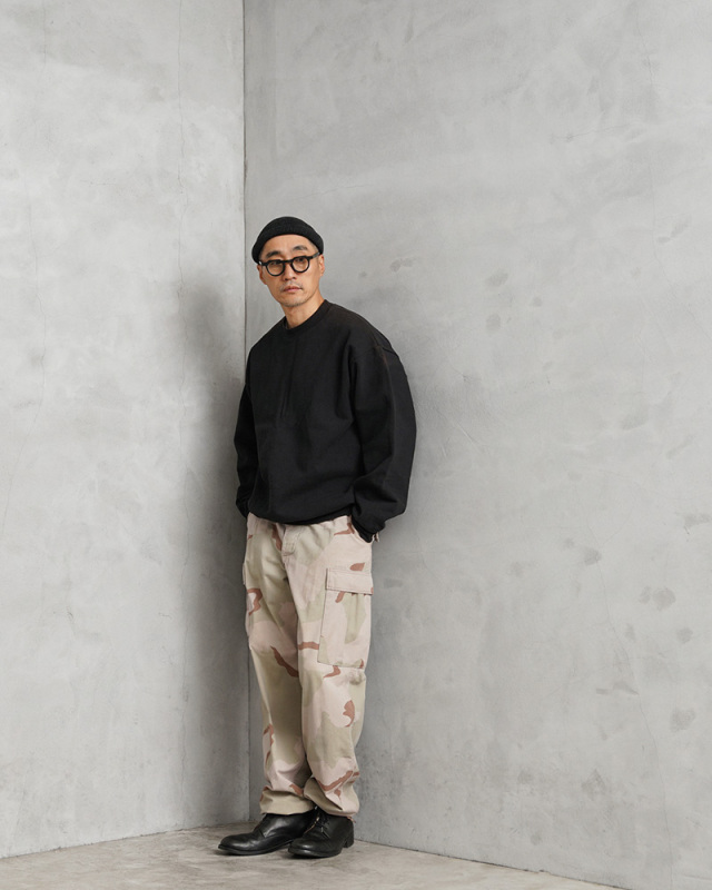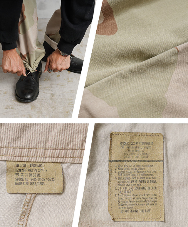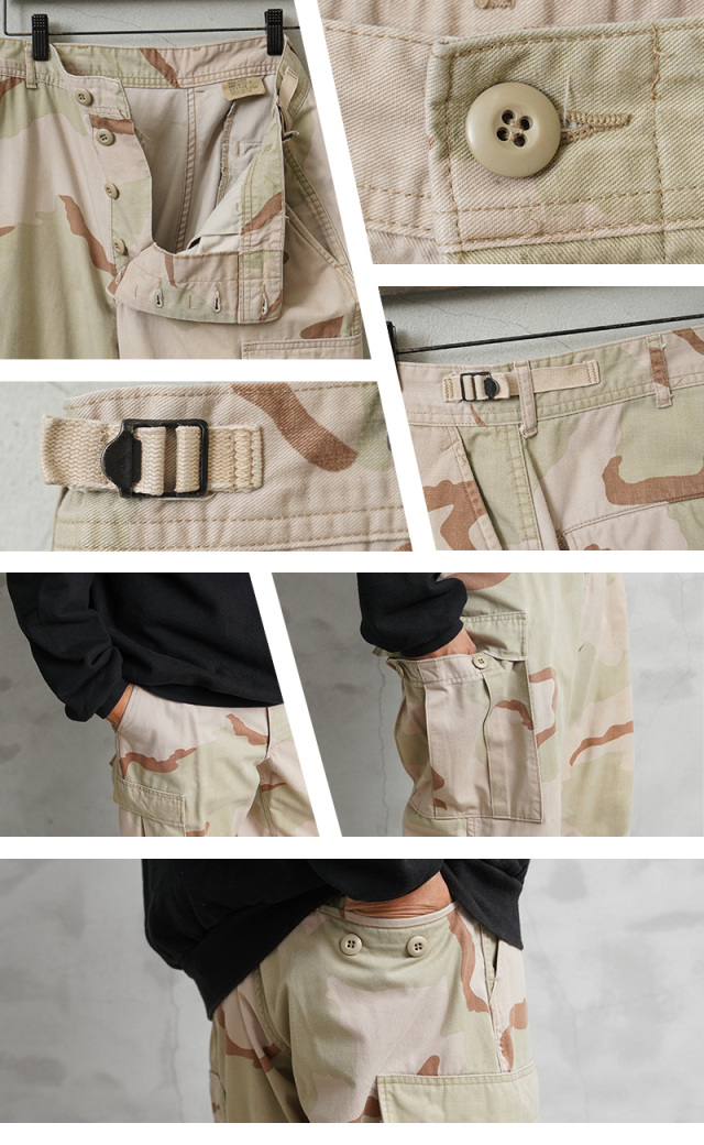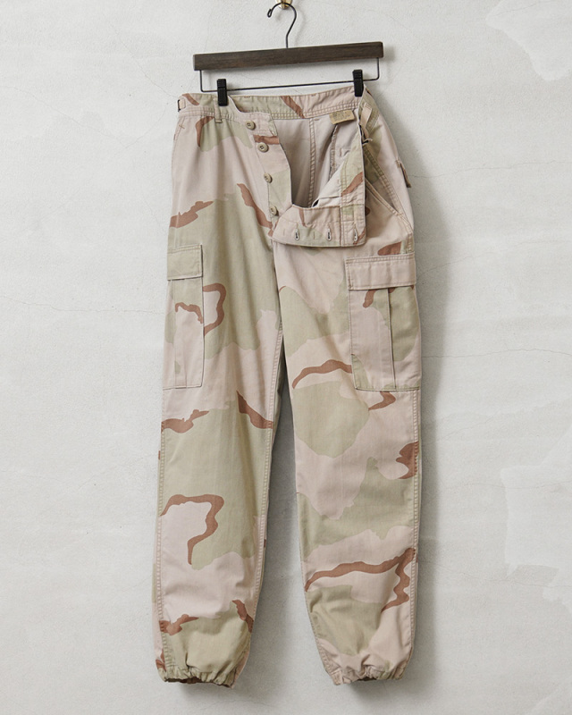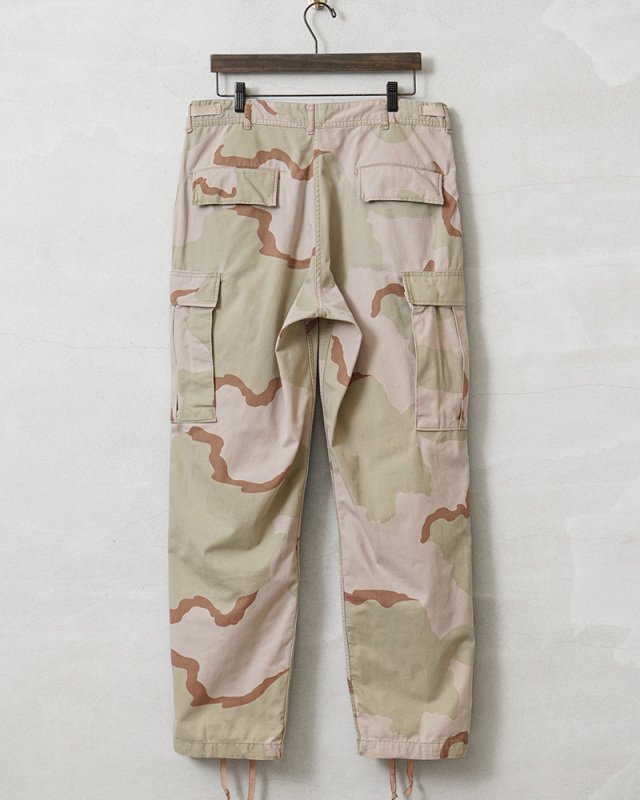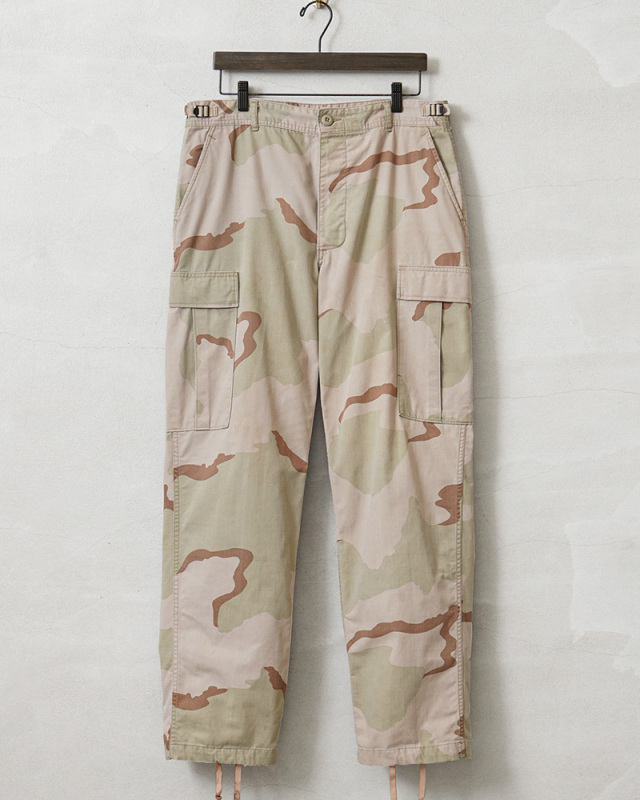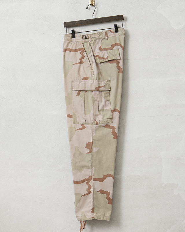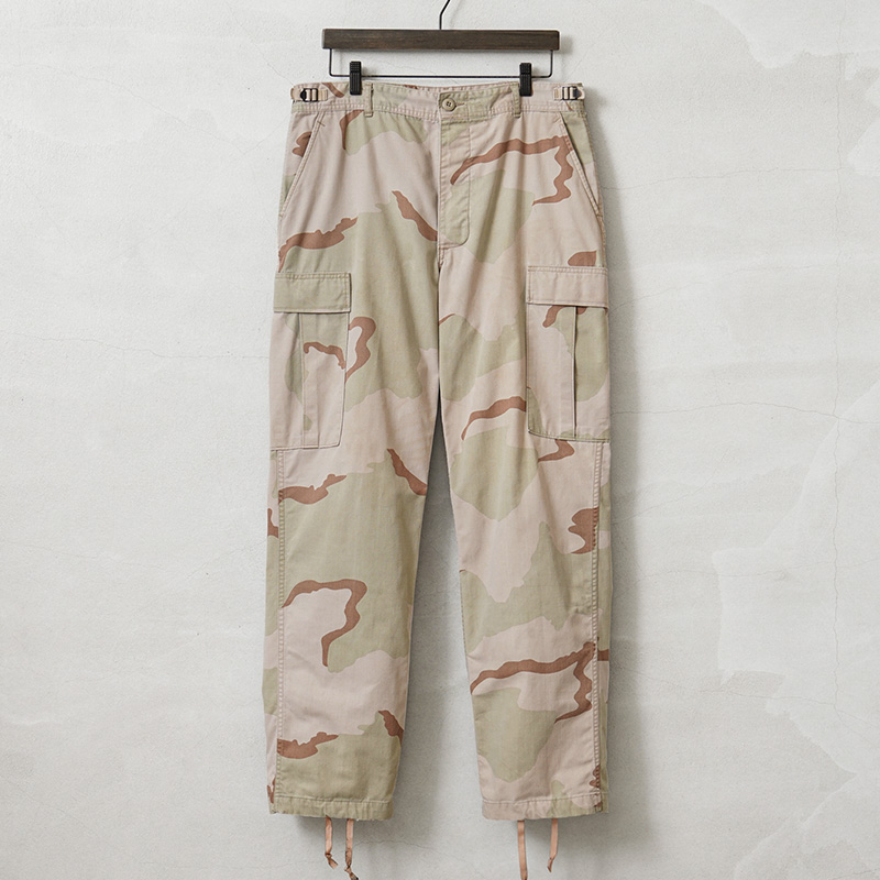 | 商品説明 | 実物 USED 米軍 DCU カーゴパンツ 3カラーデザート ノンリップ のご紹介です。 制式名称:TROUSERS,DESERT CAMOUFLAGE PATTERN(3 COLOR);COMBAT 米軍で1990年代に採用された3カラーデザートを使用したカーゴパンツです。 砂漠地帯での作戦遂行にあたり開発、支給された3カラーデザートカモのカーゴパンツで、近年ではその放出数は激減し、入手が非常に困難になってきた1本。 6Cデザート(チョコチップ)カモBDUカーゴパンツの素材やディテールが引き継がれたデザインは、NYCO(ナイコ)と呼ばれるコットン、ナイロンの混紡素材が使用されており、リップストップに比べ、こちらのノンリップのツイルタイプは放出される機会が少ない印象です。 フロントはボタンフライ仕様で、ウエスト両サイドのアジャスターで細かい調整が可能で、サイドポケット、バックポケット、カーゴポケットがそれぞれ2つずつ配置された6ポケットデザイン。膝にタックが取ってあるので、膝を曲げた時に突っ張らずに動きやすいのも特徴で、裾にはドローコード入りで調節可能な仕様です。 細部まで実用性を追求した本物でしか味わえない風合いと、存在感。穿き込むことにより様々な表情を見せてくれるカーゴパンツです。 |