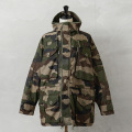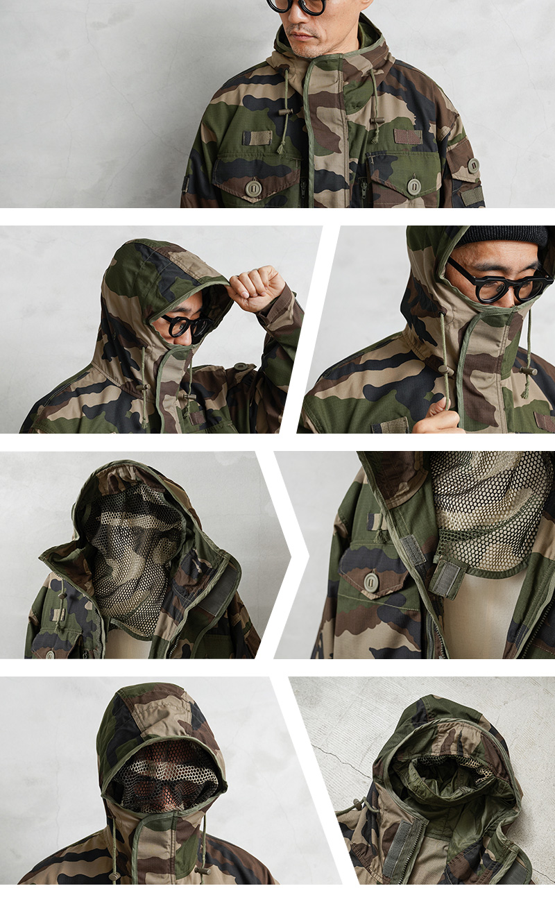 | 商品説明 | 実物 新品 フランス軍 GUERILLA SMOCK コンバットジャケット CCEカモ ネット付きのご紹介です。 フランス軍よりゲリラ戦などの場面での使用を目的に製造されたコンバットジャケットが入荷しました。フランス軍の代表的なCCEカモ(CAMOUFLAGE CENTRAL EUROPE)が採用されています。リップストップが使用されたコットンポリの混紡素材で、様々な季節で使えるジャケットです。 ダブルジップ仕様のフロントにベルクロで開閉するデザイン、首元のベルクロを閉めれば口元まで覆うディテールで、一体型のフード付きでドローコードも付属しています。フード先端にはワイヤー入りで形状を変えることが可能です。フード上部には顔を覆うネットが付属しており、アウトドアでは虫よけとしても活躍する迷彩効果の高いデザインです。 フロントとサイドにかけて6つの立体的なフラップポケットと縦に開閉するポケットが胸の部分にも2つ付属しています。縦のファスナーの1つは内側にアクセスできる貫通ポケットです。左袖にはユーティリティポケット付き、背面裾には大型のバックポケットが付属しており、ジャケットの内側には左右にファスナー開閉のインナーポケット付き、内側の裾部分にも大型ポケットが2つ付属というマルチポケット仕様になっています。 ウエストと裾の内側にはドローコードが付属しており、脇下にはダブルジップ開閉で体温調節にも優れています。肘にはリップストップではない強度の高いナイロン素材で補強されています。袖口もベルクロで調節可能、FELIN T3のような機能的なデザインが取り入れられています。 ファッションとしてだけではなく、アウトドアや登山などでも機能性の高いジャケットして活躍してくれる、放出されることも少ない希少なアイテムです。 |