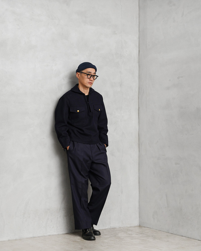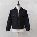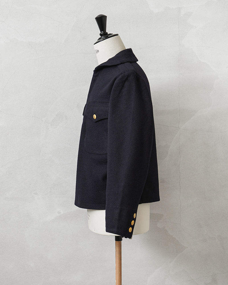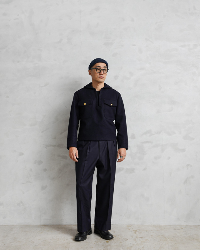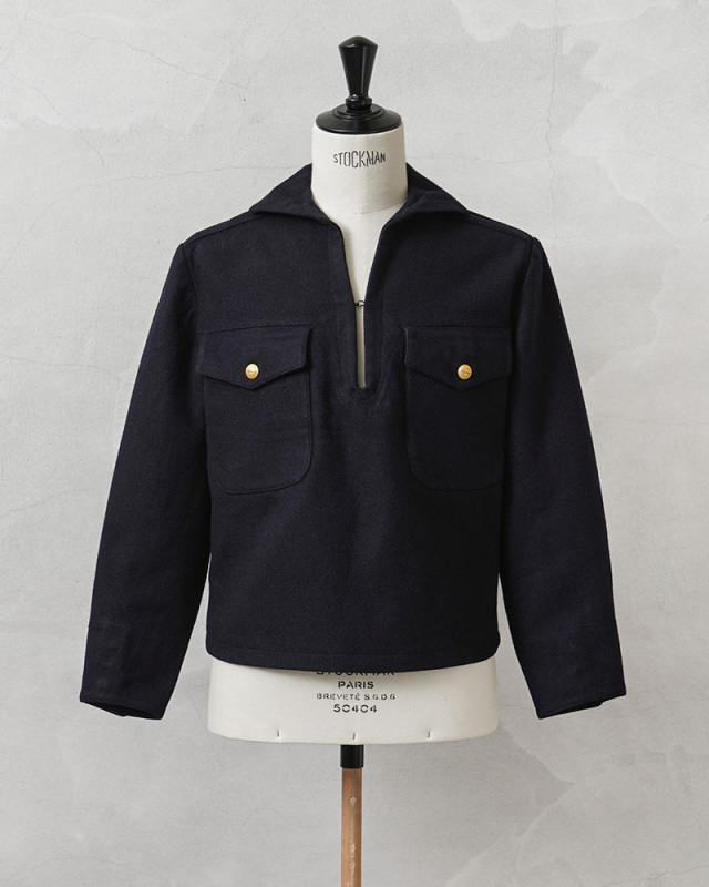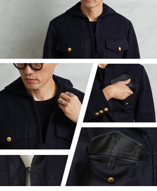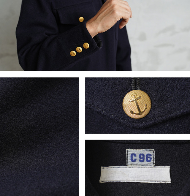 | 商品説明 | 実物 USED スウェーデン海軍 ウール セーラー ジャケット フラップポケット 後襟なしのご紹介です。 60~70年代頃のスウェーデン海軍で着用された、軽量で保温性や撥水性に優れたウール メルトン生地のセーラージャケットが入荷しました。 公式行事などフォーマルな席用に仕立てられたもので、品がありエレガントな雰囲気があります。 セーラー服特有のプルオーバータイプでスモック風の造り。濃紺に、ポケットや袖口にあしらわれたゴールドのボタンが重厚感のあるアクセントになっています。また、セーラーにスーツジャケットのような3つボタンという珍しいカフスデザインです。 フロント首元部分には、着脱も楽に行えるフック付き。胸元のフラップポケットは、二層になっており手の込んだ造りになっています。 海軍の証でもあるアンカー(錨)が描かれたゴールドボタン、温かみやキチンと感も演出される素材感。 一般的なセーラーカラーと異なり襟が小さく、後ろの垂れがない独特なスタイルが特別な存在感を放ちます。 ミリタリーらしい精密さと、気分やシーンに合わせてカジュアルにもドレッシーにも着こなせるデザインは、男女共におススメのサープラスアイテムです。 |