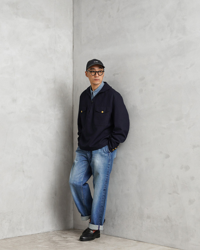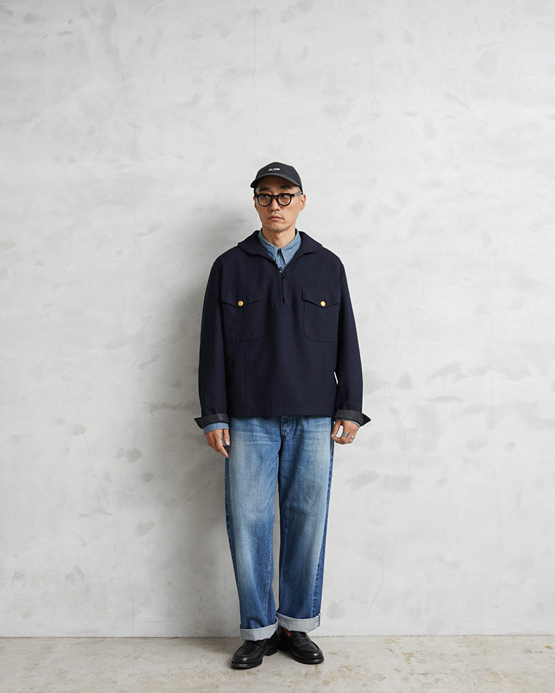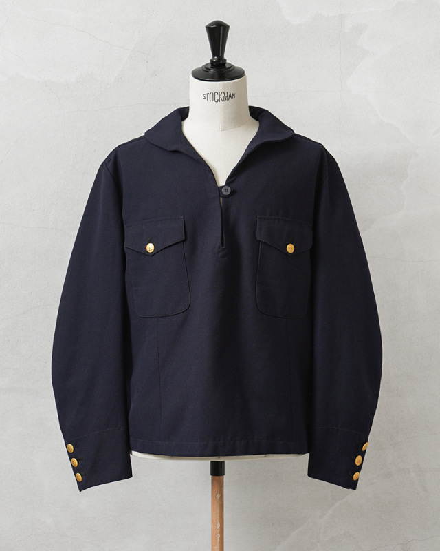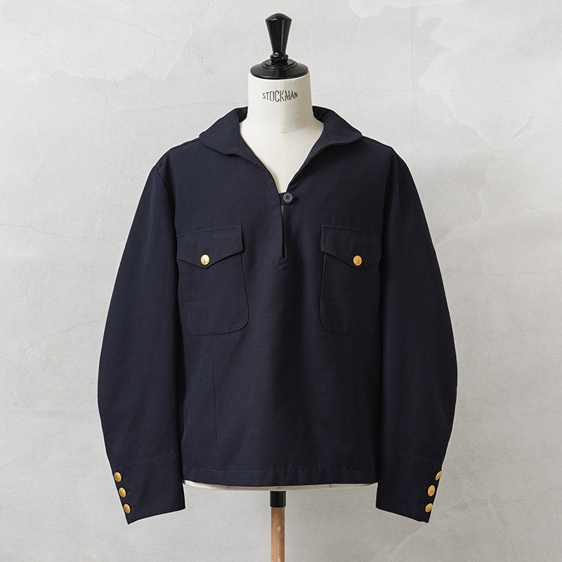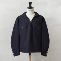 古着屋のミリタリーコ-ナ-で、生地感の良い服を手に取るとセ-ラ-シャツの場合が多くなり、襟の後ろ垂れをみては戻していました。今回このような理想的な形で出会えるとは思いませんでした。品の良いスモックの着こなしを楽しめそうです。