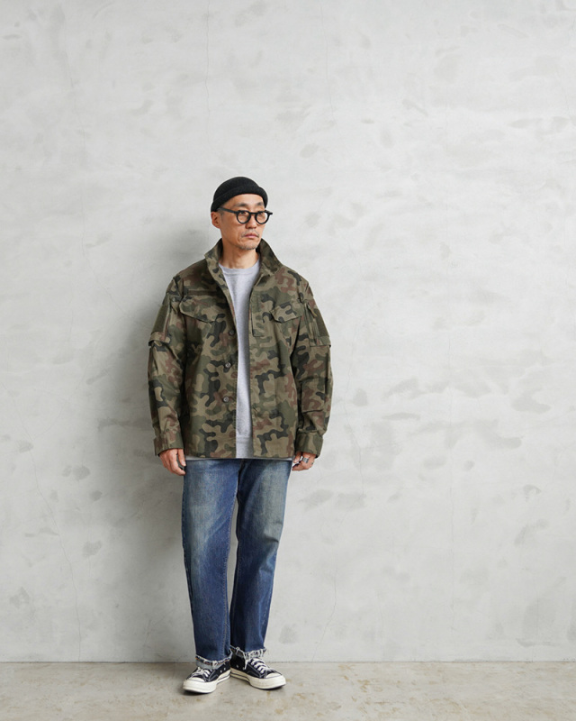| 商品説明 | 実物 USED ポーランド軍 M-2010 Wz93 Pantera Camo リップストップ コンバット ジャケット スタンドカラーのご紹介です。 ポーランド軍からWz93 Pantera(パンテラ)カモが使用されたコンバットジャケットが入荷しました。 1980年代から1993年頃まで採用されたPUMAカモの後継として誕生したヒョウ属を意味するWz93 Pantera(パンテラ)カモは、1993年にポーランド軍のほぼ全ての部隊、および国境警備隊の標準的なカモフラージュに採用された、ポーランド軍のウッドランドカモと言えるカモパターンです。 こちらは2010年頃に採用されたアイテムで、ハリのある上質なコットンポリのリップストップが使用されたスタンドカラージャケットで、引き裂きに強く、耐久性の高い素材が使用されています。 ベルクロ留めのスタンドカラーで、比翼仕立てのフロントはベルクロとボタンで開閉、胸には斜めに配置されたベルクロ開閉のポケットが2つ、袖の左右にもジッパー付きユーティリティポケット、その横にもペンホルダーが付属しています。さらに左袖の袖口付近にもペンホルダーなどで使えるポケットがデザインされています。 両袖の肘部分にはエルボーパッドを収納できるポケット付きで、肩から背面にかけた立体的なアクションプリーツが腕まわりの可動域を広めて動きをスムーズにする機能的なディテールが盛り込まれています。 立体的な作りのポケットに、ベルクロパネルが様々な箇所に付属しており、サイドのパネル切り替えが入れられることで立体的で動きやすいデザインが施されています。袖口はベルクロで調節可能で、広めの袖口がロールアップもしやすく計算されています。脇下にはベンチレーションとして機能するホールが付属しています。 丸みのある特徴的なカモ柄が非常に珍しく、放出量も少ないコンバットジャケットです。 |