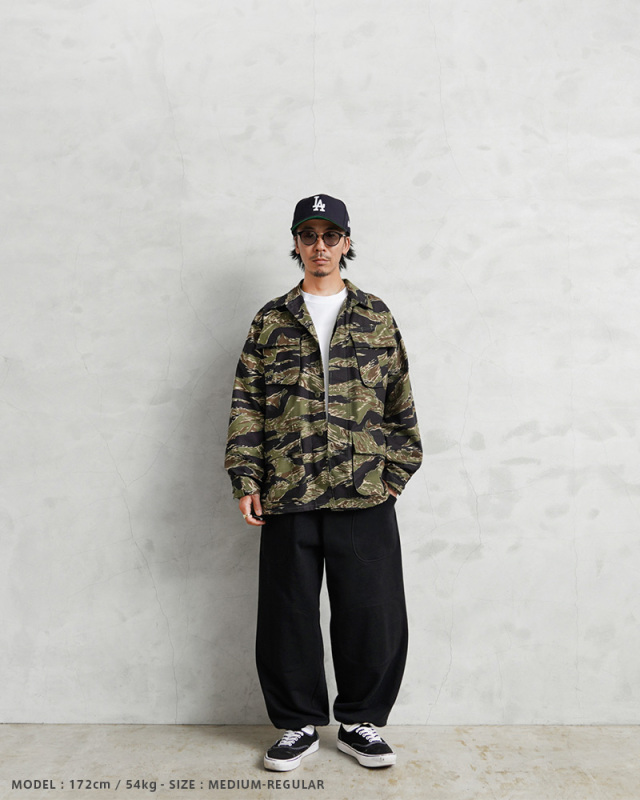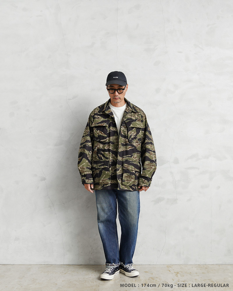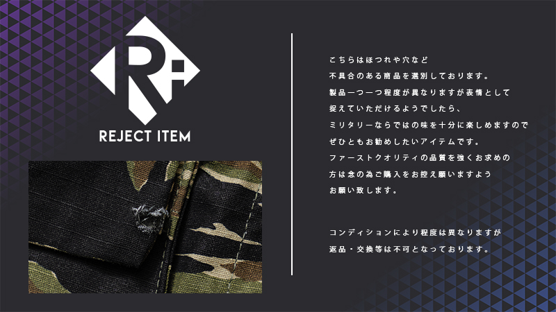 | 商品説明 | リジェクト 訳あり品 MADE IN USA 新品 デッドストック 米軍 MCGUIRE ARMY NAVY社製 ジャングル ファティーグ ジャケット タイガーストライプ PATTERN【A】のご紹介です。 米軍の有名なジャングルファティーグジャケットのアメリカ製デッドストックが入荷しました! MCGUIRE ARMY NAVY社がCIVILIAN MODEL(民間モデル)として2000年代頃に製造したアイテムで、タイガーストライプで知名度の高いTIGER STRIPE PRODUCTS社のジョン ウェイン デンス(JWD)などと呼ばれるタイガーストライプを使用したジャングルファティーグジャケットです。 2000年代にはアフガニスタンとイラクの両方に展開する特殊作戦部隊や、軍事演習において敵軍として編成される部隊のOPPOSING FORCE(OPFOR)などでも実際にTIGER STRIPE PRODUCTSのファブリックを使用したユニフォームが採用されていました。 1950年代の末期に南ベトナム海兵隊にて採用されたタイガーストライプのパターンは、ベトナム戦争時には米軍の間で非常に人気があり、米陸軍特殊部隊、海軍特殊部隊などのエリート部隊などでも使用され、日本を含むアジア各国でタイガーストライプの製造が行われていた為に様々なパターンが存在する迷彩柄です。 ジャングルファティーグジャケットは、ベトナム戦争時に熱帯雨林などでの着用を想定され製作されたリップストップ生地で、引き裂きに強く、軽量で機能的なジャケットで、大きく分けて5回の改良を経ている中の最終5thモデルをほぼ踏襲したモデルで、ポケット下のドレンホールとバックヨークが付属しないデザインです。1969~70年に採用された最終の5thモデルは、4thと比較すると袖口に付属していたV字のガゼットが省略された仕様です。 特徴のある斜めに配置された胸ポケットは、戦闘で体を伏せた場合でも物を取り出しやすいようにスラントポケットが採用されています。1stで使用されていた露出したボタン、1stや2ndで採用されていたエポレットは廃止され、4thからは頑丈さと軽さをもち合わせたリップストップ生地が使用されています。 ポケットはフロントに4つあり、胸はスラント(斜め)ポケットのマチ付き、ウエスト付近のポケットにも大きめのマチが付きで容量が拡大します。袖口はボタンで調節可能なデザインになっています。 こちらはほつれや穴など不具合のある商品を選別しております。多少のリペアを施していただいてからの着用、もしくはリメイク資材としてもおすすめです。ファーストクオリティの品質を強くお求めの方は念の為ご購入をお控えくださいますようお願い致します。 MADE IN USA |