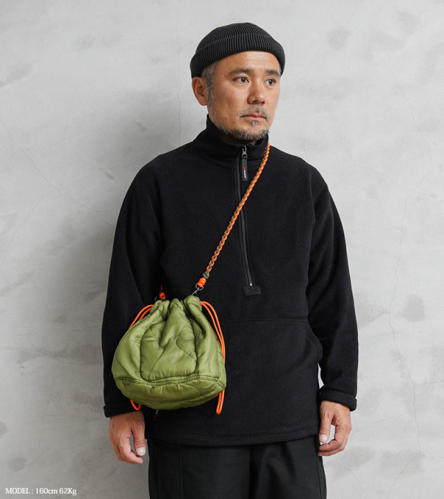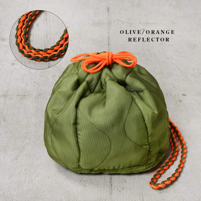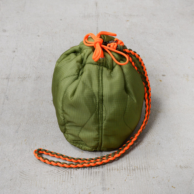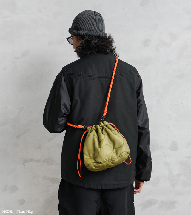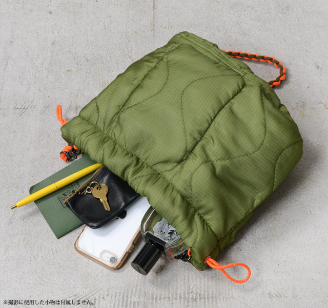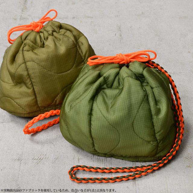 貴重なデッドストックのM-65ライナーをリメイクした大好評のWAIPER.incオリジナルのエフェクツバッグが、さらに使いやすくバック本体のサイズやコード部分をアレンジして登場。 斜め掛けも、ショルダーポーチとしても、利便性高く進化しました!米軍実物のエフェクツバッグをベースに、素材にオニオンキルティングが特徴的な実物 新品 米軍 M-65ライナーを解体して使用。 軽くて柔らかな質感のナイロンと、クッション性のある中綿がスマホなどの小物も優しく保護してくれます。ドローコードで開閉する、巾着タイプ。