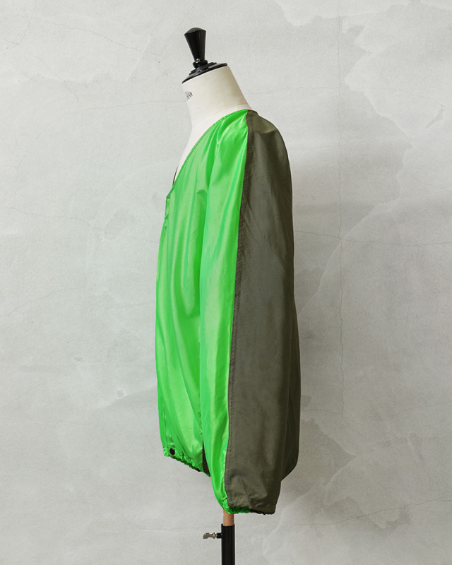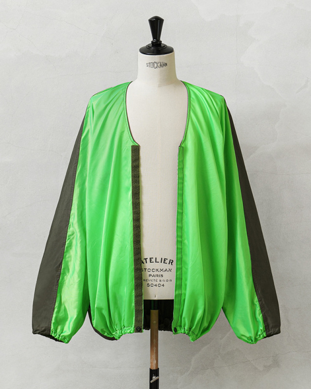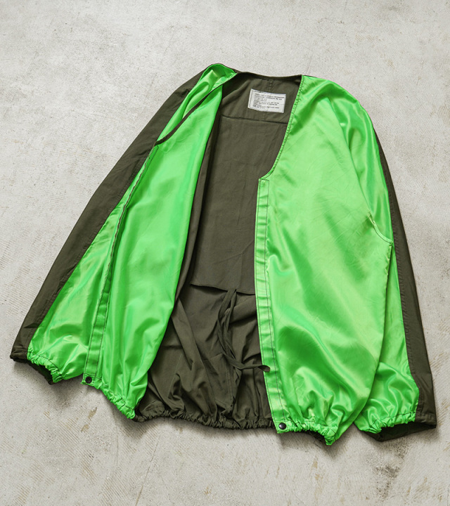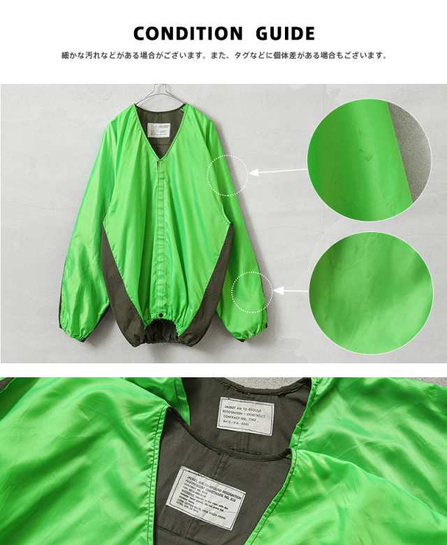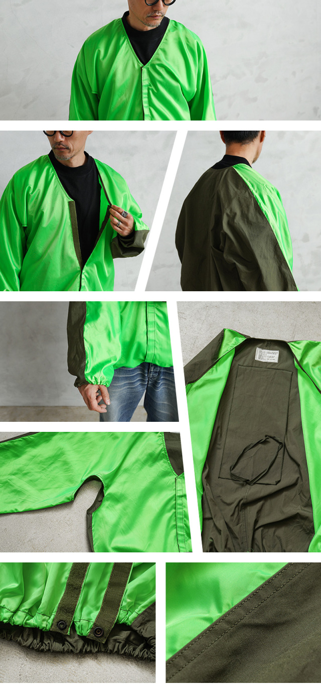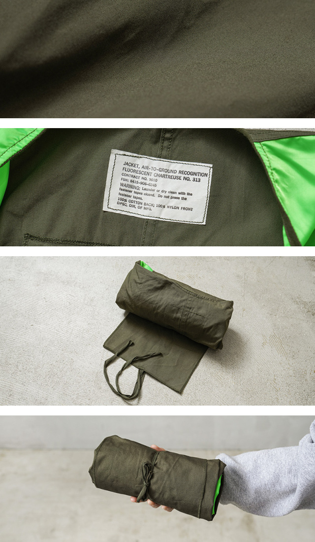 | 商品説明 | 実物 新品 米軍 USAF AIR-TO-GROUND RECOGNITION グラウンドクルー ジャケットのご紹介です。 制式名称:JACKET,AIR-TO-GROUND RECOGNITION FLUORESCENT CHARTREUSE NO. 313 米空軍のグラウンドクルーが視認性を高めるために使用していたジャケットが入荷しました。 ベトナム戦争が勃発していた1950年代から1974年頃に使用されていた「空対地認識蛍光ジャケット」で、航空機から地上部隊を視覚的に識別するために使用する蛍光カラーのジャケットです。 こちらはFLUORESCENT CHARTREUSE(フルオレセント シャルトリューズ)NO. 313というライトグリーンの蛍光カラーとODのバイカラーです。FLUORESCENT ORENGE(フルオレセント オレンジ)やFLUORESCENT YELLOW(フルオレセント イエロー)などの様々なカラーリングによりオペレーションを明確にし、特定の任務を識別します。 着用している衣類の上から羽織るジャケットで、フリーサイズの為にサイズ表記はなく、ゆったりとした着用感です。フロントはベルクロで開閉し、裾にのみスナップボタンが付属しています。袖や裾はゴムで伸縮し、脇が開いたデザインです。 ジャケットの内側背面に長方形の布が付属していますが、布を首元から出した状態で、袖を前で折りたたみ、さらに左右1回づつ折りたたんで下からクルクルと布に向かって丸めて、最後に付属の紐で結ぶとコンパクトに収納できて、素早く広げることもできる便利な仕様です。 NAM戦時のアイテムとは思えない前後で切り替えられたインパクト強めのデザインで、コレクターズアイテムとしてはもちろん、軽く羽織ってアクセントとしてもおすすめの希少価値の高いジャケットです! |