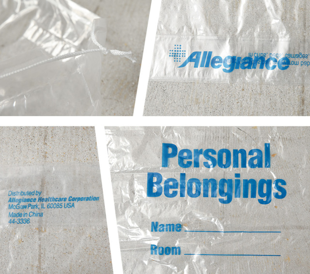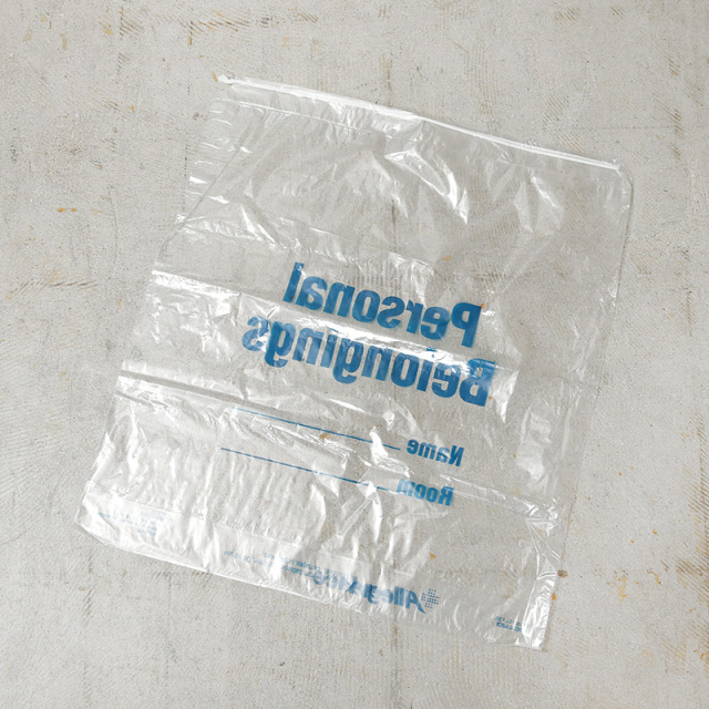 アメリカの病院や介護施設などの医療機関で使用される患者所持品バッグです。 シール強度・耐寒性・耐衝撃性・ホットタック性の諸物性に優れたLLDPEフィルムの透明フラットパック。 病室、部屋番号を書き込むためのプリントがあり、フチには引き紐がついていて巾着のように簡単に絞ることができます。 柔らかいフィルム製なので畳めて邪魔にならず、Tシャツなら10枚以上は入るたっぷり容量。 旅行やジム、公共の施設などでの持ち物の保管や、不特定多数が集まる非常時の避難所での生活を考慮した備えとして防災カバンに入れておくこともお薦めです。 ブルーのパキッとした太めのフォントやレイアウトがアメリカらしいパッケージデザインで雰囲気抜群。海やプールでの水着を入れるスイムバッグとしても気分があがるアイテムです。 ※こちらは10枚セットでの販売となります。 |