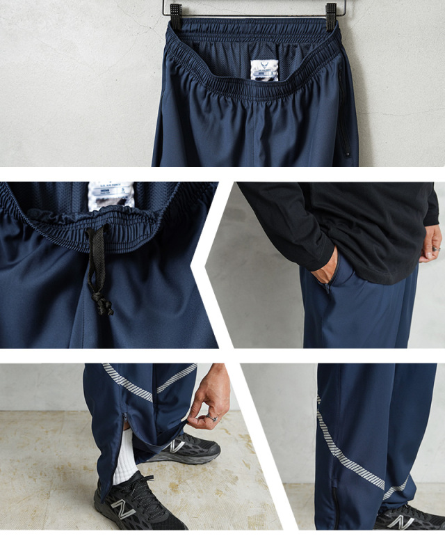 ファスナー開閉のハンドポケットと、その左側にはU.S.AIR FORCEのロゴマークをデザイン。さらに前後にかけてリフレクタープリントが施されています。ウエストはゴムで伸縮し、ドローコードでさらに絞ることもできます。裾のファスナーが快適な着脱を行えて体温調節にも役立ちます。