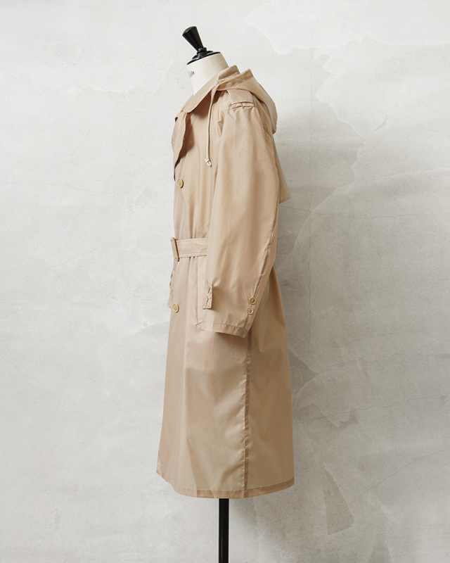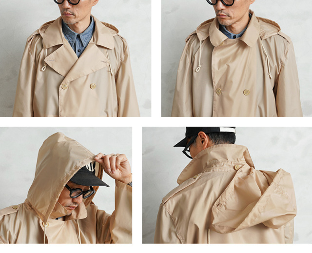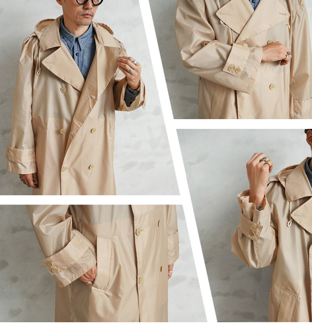 | 商品説明 | FRENCH MILITARY デッドストック フランス軍 ロングトレンチ レインコート カーキのご紹介です。 フランス軍へ納入実績のあるサプライヤーが製造したトレンチデザインのレインコートが入荷しました。 一見するとトレンチコートのような見た目のナイロン製レインコートで、カーキ(ベージュ系)カラーに、ダブルデザインのフロントや、取外し可能なウエストベルト付きで、ボタンを開けた状態でカジュアルな着こなしもおすすめです。ドローコード付きのフードは取り外し可能で、袖口もボタンで調節可能です。 アンブレラヨークが備わっていますので、雨が染み込みにくくなる役割を果たし、水が下に滴り落ちるようにデザインされています。サイドポケットは手の出し入れがしやすいように斜めに配置されたデザインで、同じ部分に貫通ポケットも備わった便利なデザイン。 背面裾にはセンターベントがデザインされています。永く愛用していただけるレイングッズで、ナイロンなので比較的コンパクトに収納できるのも嬉しいポイントです。 |
