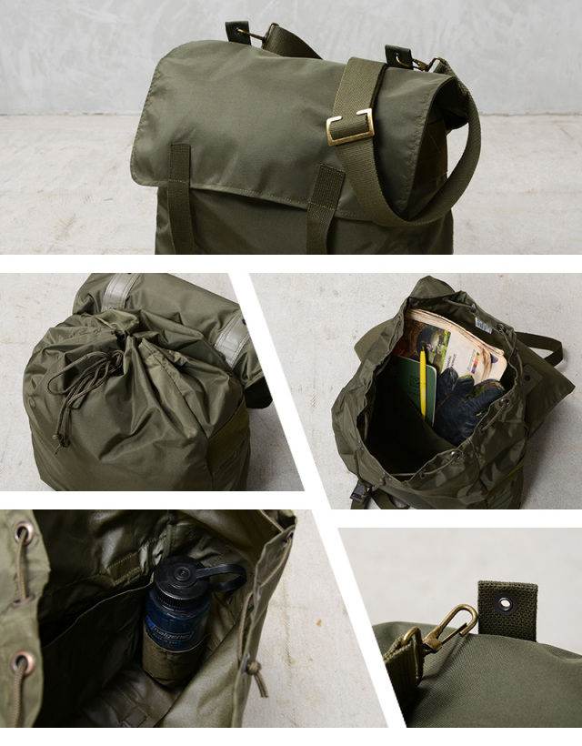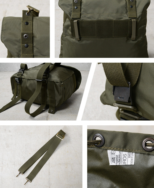 | 商品説明 | 実物 新品 デッドストック オーストリア軍 3WAY パイロットバッグ 2ストラップのご紹介です。 独特なカラーが印象的なオーストリア軍のパイロットバッグが入荷しました。 米軍のアイテムをデザインソースとして使用することの多いオーストリア軍ですが、こちらは生地裏面に撥水加工が施された耐久性のあるナイロン製で、米軍のALICE(All-Purpose Lightweight Individual Carrying Equipment)と同様のシステムを取り入れたデザインのバックパックとなっています。背面のALICEクリップはベルトなどに装着してウエストパックとしても使用することができます。 バッグの上部と下部にアイレットがついており、付属のユーティリティストラップを上部のアイレットに取り付ければショルダーバッグに、別のハーネスを下部のアイレットに取り付けることでバックパックとして使用することができます。(※バックパック用のハーネスは付属しておりませんので、ご了承ください。) 収納口には雨蓋のフラップと、ドローコードによる開口部のディテールで雨の侵入も防ぎます。機能性に優れ見た目以上に収納力があるのでアウトドアシーンはもちろん、幅広いシーンでマルチに使えるアイテムです。 |