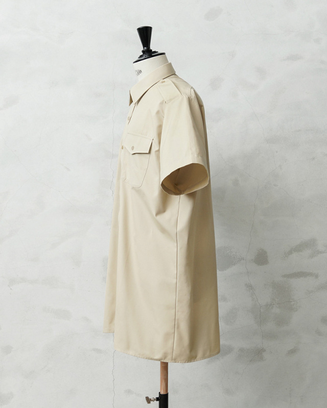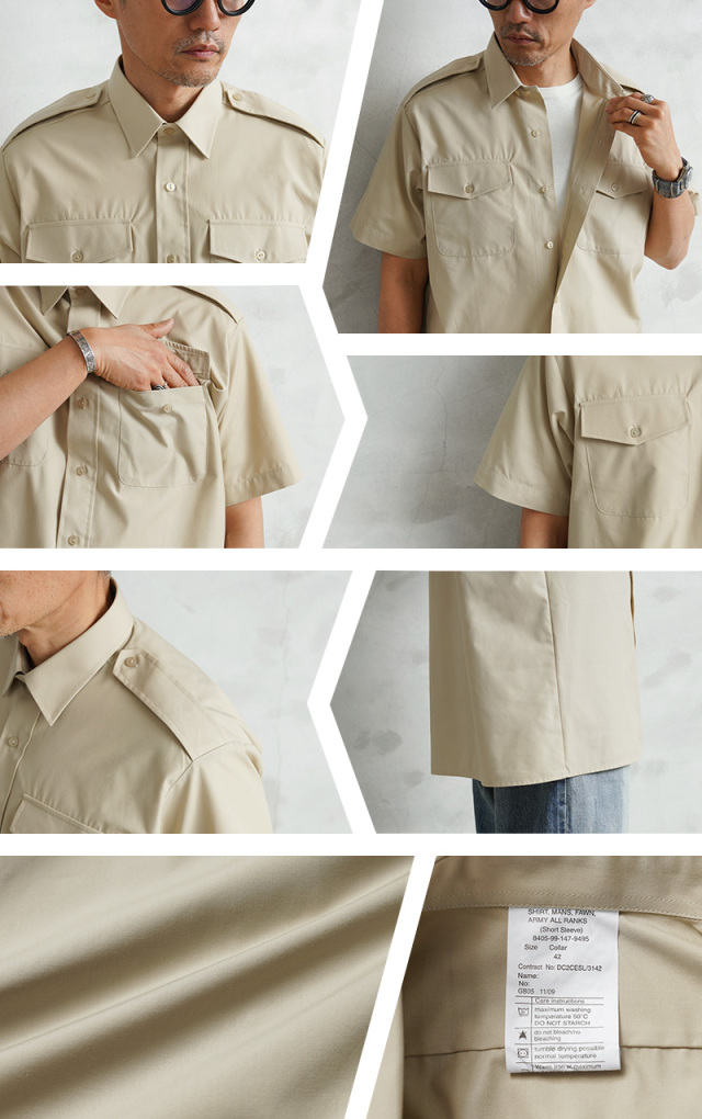 | 商品説明 | 実物 新品 デッドストック イギリス軍 FAWN ARMY ALL RANKS ショートスリーブ ドレスシャツのご紹介です。 制式名称:SHIRT,MANS,FAWN,ARMY All RANKS(Short Sleeve) イギリス軍から放出された「FAWN」と呼ばれるベージュに近いカーキカラーのシャツが入荷しました。 1990年代に採用されたドレスシャツで、様々な年代のアイテムが入荷しています。パレードや祭事等の準礼服としてイギリス陸軍の全階級で採用の制服になります。当店でも人気の「ALL RANKS No.2 DRESS ウール トラウザーズ」とも合わせて着用されるショートスリーブシャツです。 素材にはT/Cブロードという目の詰まった平織りの生地が使用されています。薄手の生地ながら、緻密に織られていることで耐久性が高く、ハリがあります。洗濯を繰り返しても生地がへたりにくく、滑らかで肌触りが良く、高級感のある上質な素材です。 コットンとポリエステルが使用された素材は綿の特性である吸水性と肌触りの良さと、ポリエステルの特性であるシワになりにくく速乾性に優れている特徴を持っています。 フロントにボタン留めのフラップポケットが備わったシンプルでベーシックなデザイン。ボックスカットのフラットな裾のディテールはタックインでもタックアウトで着ても良いデザインになっています。 クラシックな英国のシャツに多い表前立てのデザインは質実剛健を好むイギリスらしい仕様です。フォーマル、ビジネス、カジュアルシーンまで幅広くこなしてくれる一着です。 |