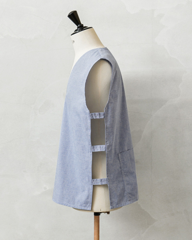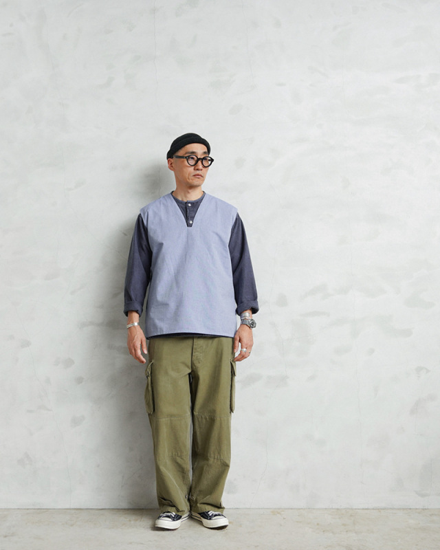 | 商品説明 | 実物 新品 デッドストック フランス軍 GAO プルオーバー ベスト サックスブルーのご紹介です。 フランス軍で使用されるGAOベストが入荷しました。Vネックでプルオーバータイプのベストで、サイドが3本のストラップで繋がれた通気性に優れたシンプルなデザインのベストです。 アフリカなどの熱帯気候での着用に適したデザインで、タンクトップのように1枚で使用されることもあれば、フィールドシャツの上からも着用されていたようです。基本は戦闘以外の場面で使用されていたベストです。 バックに2つに分割されたパッチポケットが付属した個性的な仕様で、サックスブルーの爽やかなカラーが特徴で、コットンポリですが、リネンのような風合いを感じさせる通気性の良い素材が使用されています。 シャツやTシャツの上からプラスワンするだけでおしゃれに活躍してくれるベストです。 |