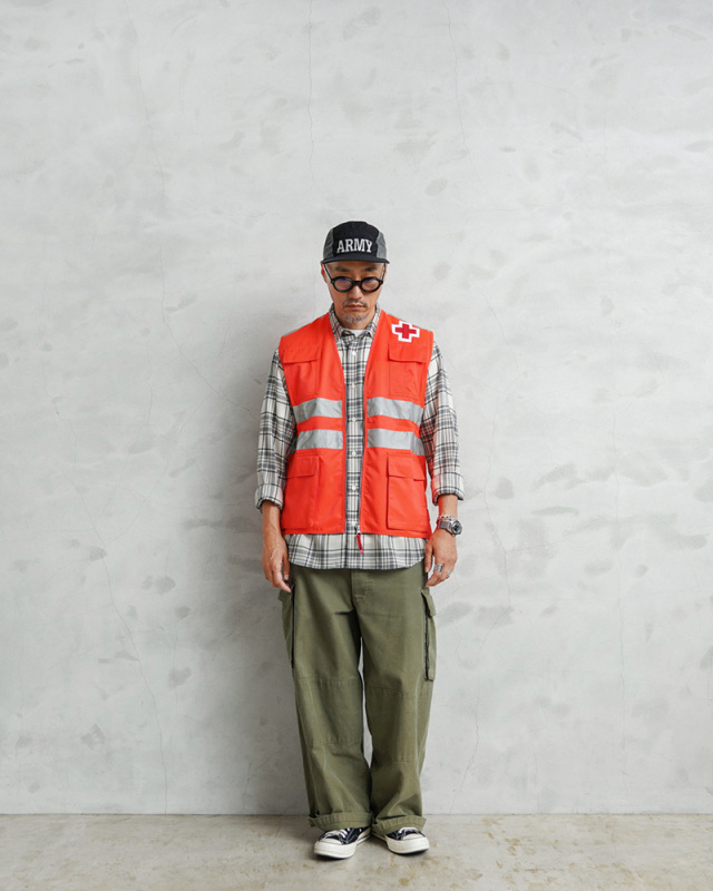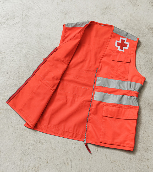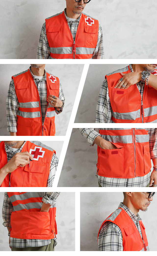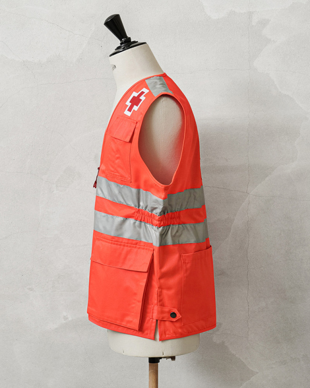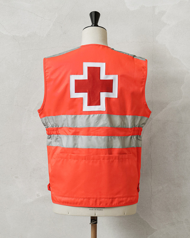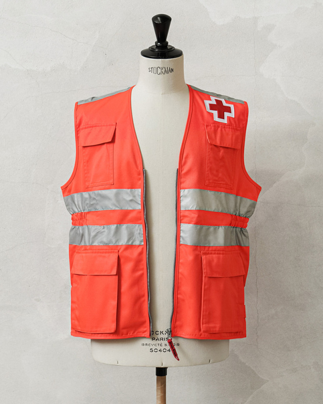 | 商品説明 | 実物 新品 デッドストック スペイン 赤十字 レッドクロス ベスト オレンジのご紹介です。 スペインやヨーロッパの救急・災害支援現場で実際に使用されていた、スペイン赤十字(Cruz Roja)の実物ベストです。レスキューオレンジのボディに、フロントからバックにかけてリフレクターを2本ずつ配置し、夜間や悪天候下での高い視認性を確保した、圧倒的なビジュアルインパクトの一枚です。 胸元と背面にはレッドクロスのパッチをしっかりと縫製。赤十字部分が若干立体的な作りで、特に背面の大きなレッドクロスが存在感を放ち、視認性とデザイン性の両立が図られています。 フロントには4つのフラップ付きポケットを装備し、ウエスト部分のポケットはサイドからも手の出し入れが可能なポケットになっていて、マチ付きの立体的なデザイン。背面にも大きなバックポケットが実用性にも優れます。サイドにはスリットと、それを留めるスナップボタンが付属します。 紛争地域等で「赤十字マーク」を掲げている病院や救護員などには、絶対に攻撃を加えてはならないと国際法や国内法で厳格に定められています。日本国内でも、「赤十字マーク」の使用については赤十字社と法律等に基づいて認められている組織に限られています。あくまでも、趣味嗜好品、コレクター品としてご検討ください。 |