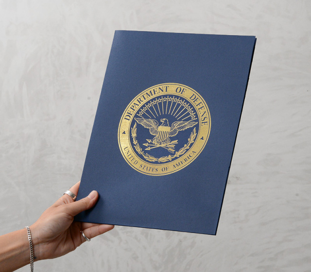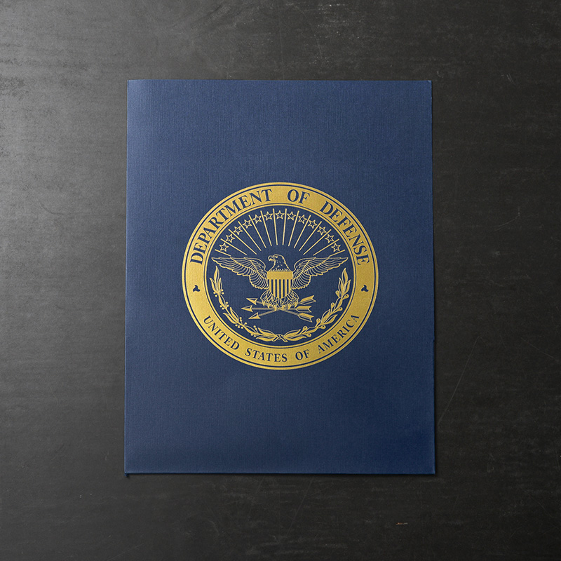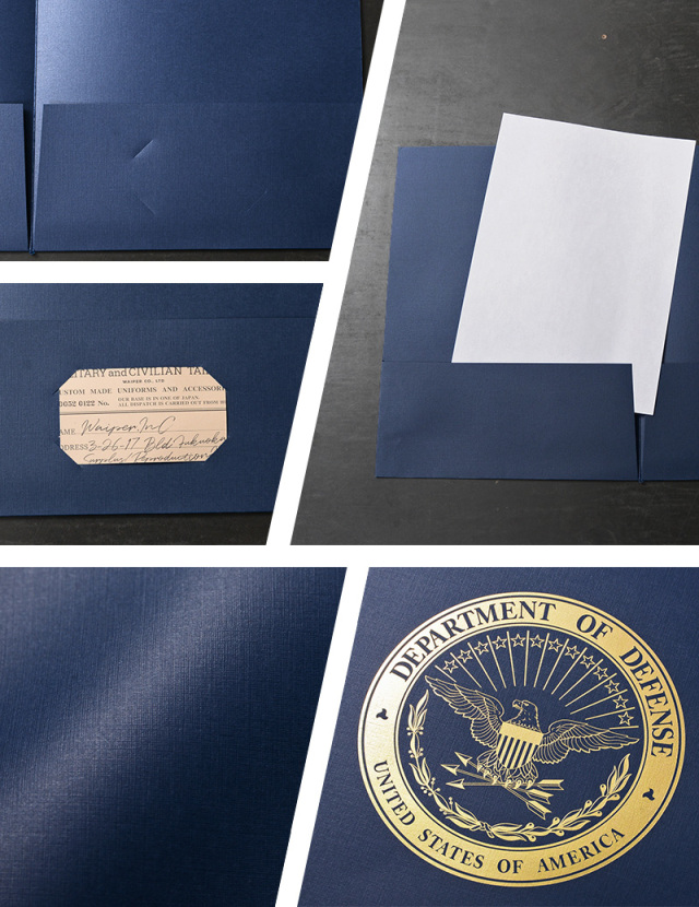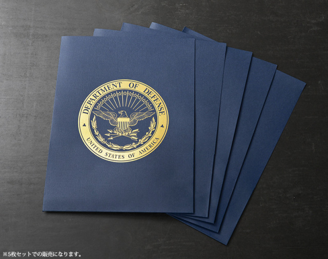 アメリカ合衆国の中央官庁の一つで、陸・海・空軍、海兵隊、宇宙軍を管轄する最高軍事行政機関、アメリカ合衆国国防総省(United States Department of Defense)の公式ロゴが入ったファイルフォルダーです。丈夫で重厚な紙製で、A4サイズ。深いネイビーカラーに前面にはスタイリッシュな金色のエンボス加工のロゴ。開くと両面にポケットがあり、カード等を差し込めるスリットが施されています。整然とした独特の雰囲気が魅力的で、額装してお部屋やガレージ、また店舗装飾など、インテリアとして飾っても存在感抜群の一枚。