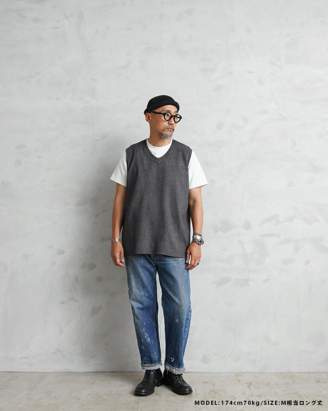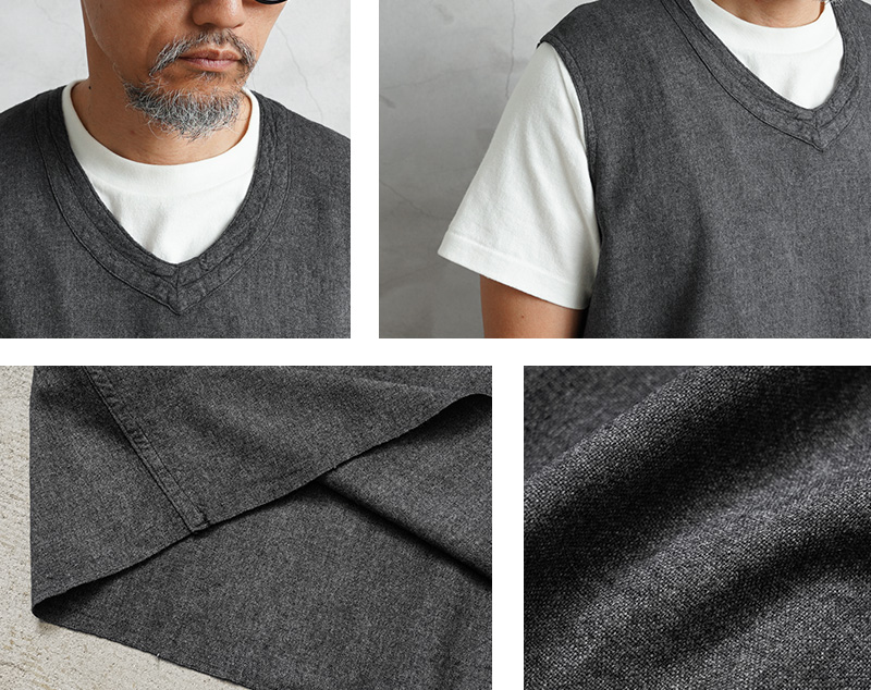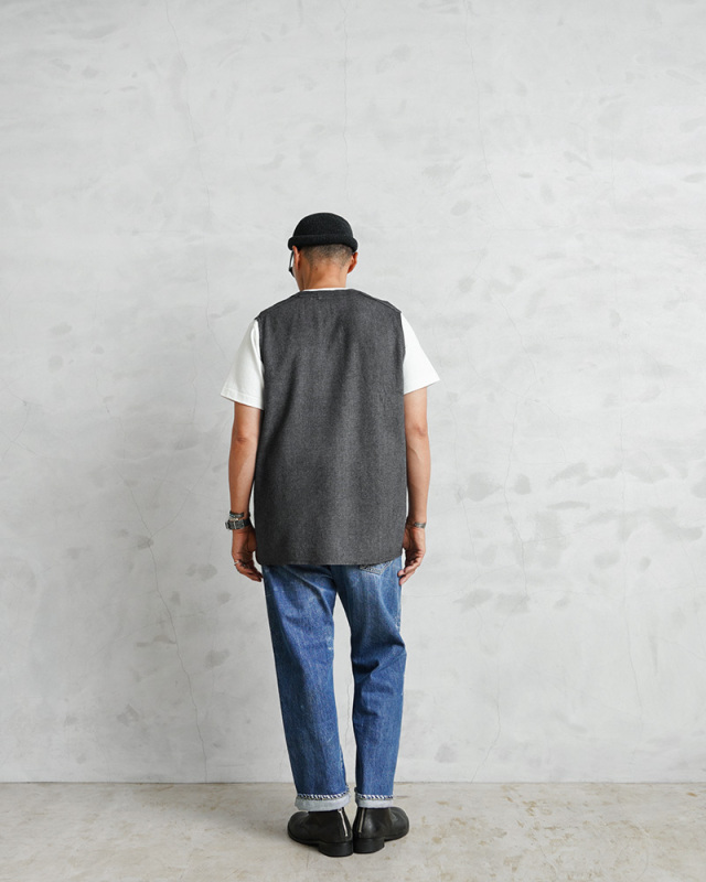 フランス軍実物放出のリネン生地を使用したベストのGRAY染め。 リネン生地独特のシャリ感があり、やわらかい着心地のベスト。元々ナチュラルだったカラーを、丁寧に染職人の手によってGRAY染めしています。 フランス軍らしいスタイリッシュで洗練された雰囲気の漂う一枚。リネンの染色ならではの風合いと、絶妙なグレーカラーが汎用性が高く男女問わず幅広く着用可能です。 ざっくりとしたシルエットとシンプルなデザインで、そのままでもレイヤリングの一部としても、年間通して楽しむことのできるアイテムです。 |