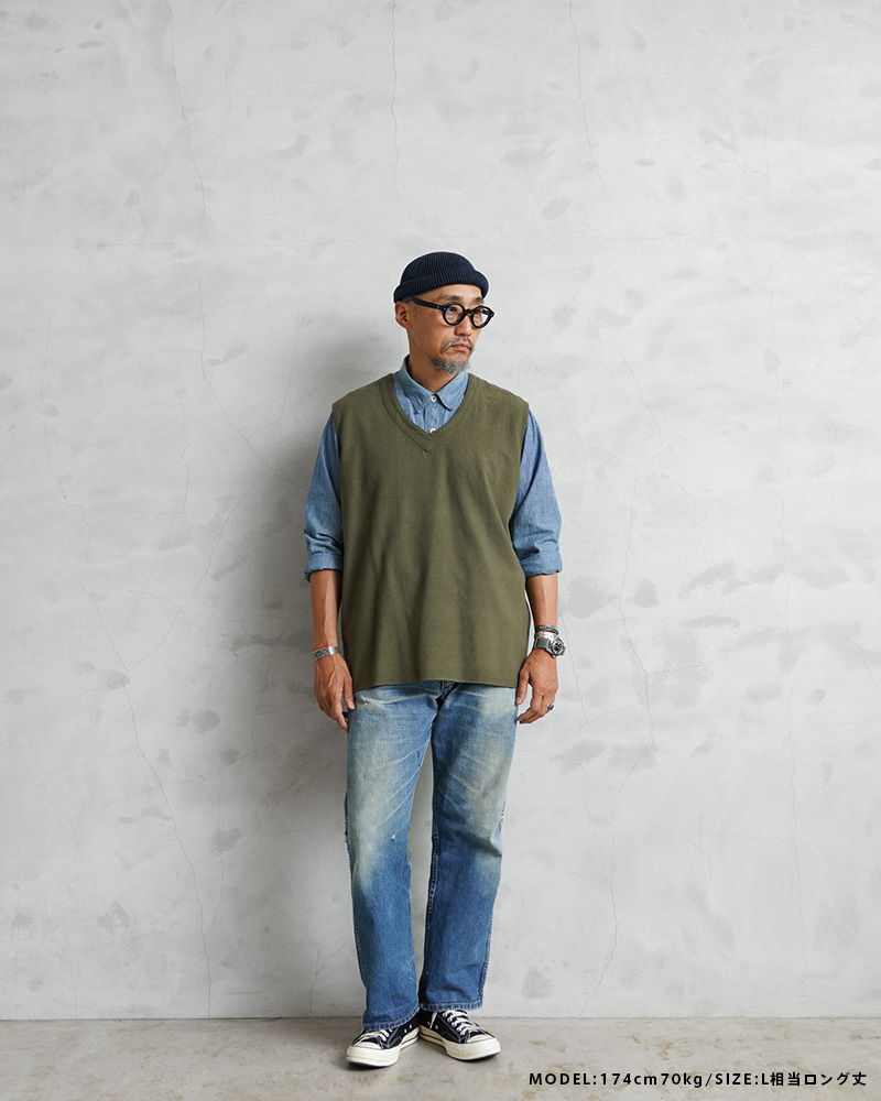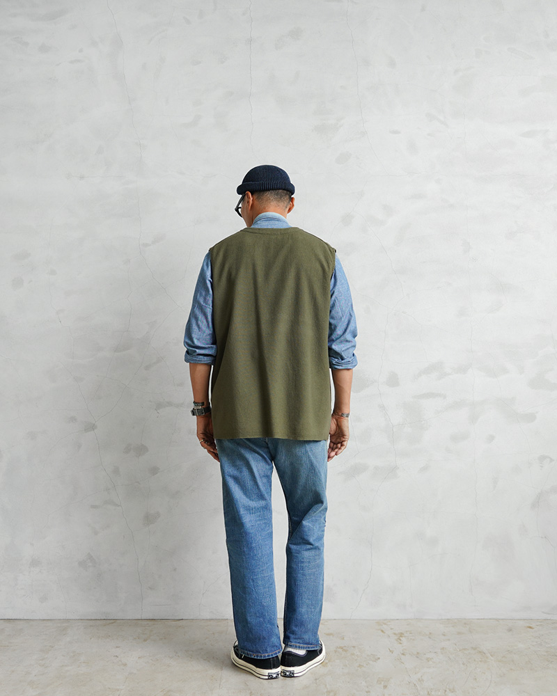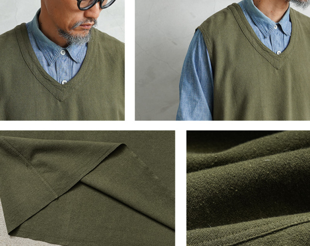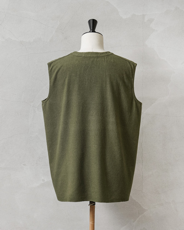 フランス軍実物放出のリネン生地を使用したベストのOLIVE染め。 リネン生地独特のシャリ感があり、やわらかい着心地のベスト。元々ナチュラルだったカラーを、丁寧に染職人の手によってOLIVE染めしています。 フランス軍らしいスタイリッシュで洗練された雰囲気の漂う一枚。リネンの染色ならではの風合いと、落ち着きのあるオリーブカラーが汎用性が高く男女問わず幅広く着用可能です。 ざっくりとしたシルエットとシンプルなデザインで、そのままでもレイヤリングの一部としても、年間通して楽しむことのできるアイテムです。 |