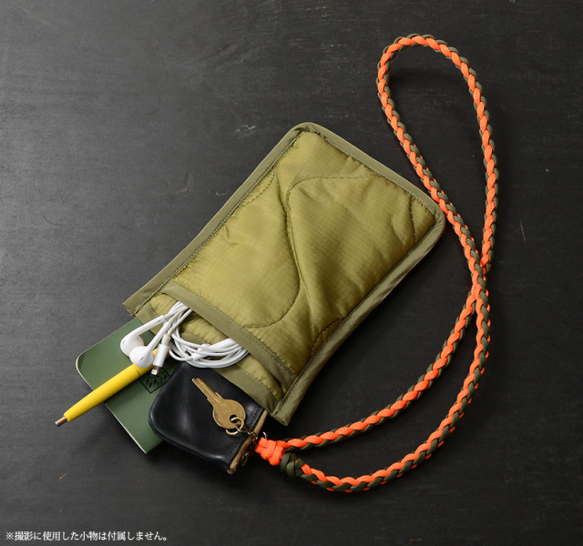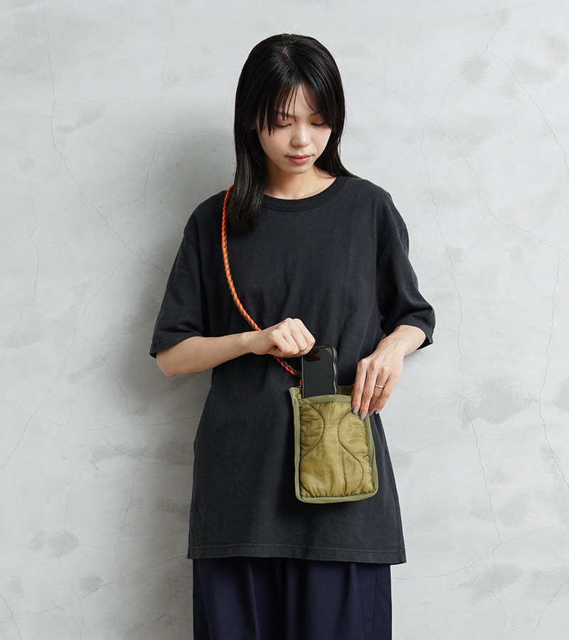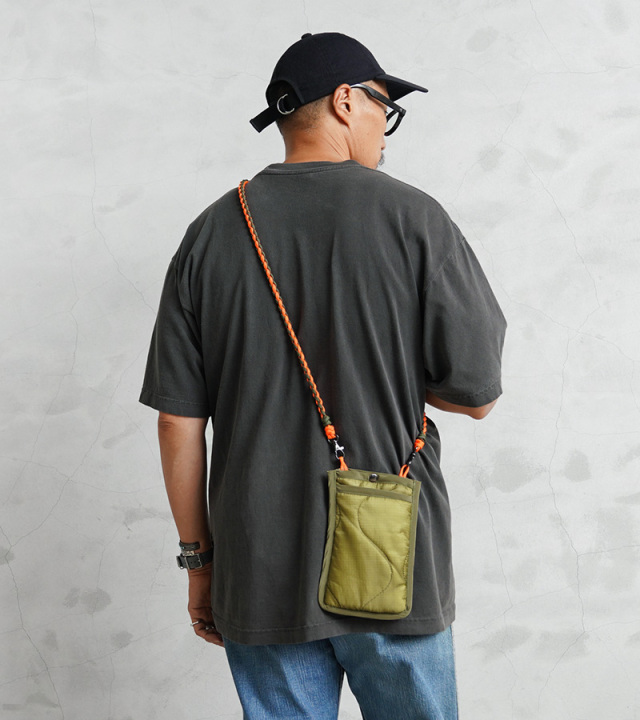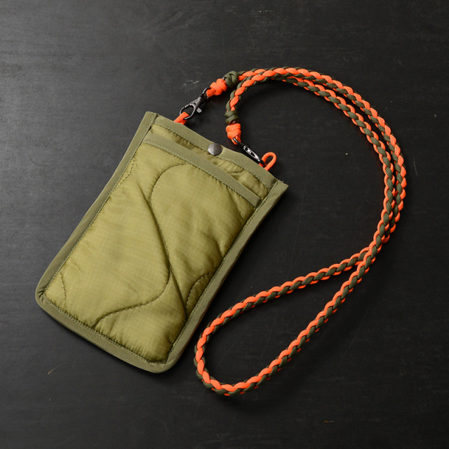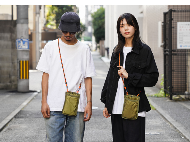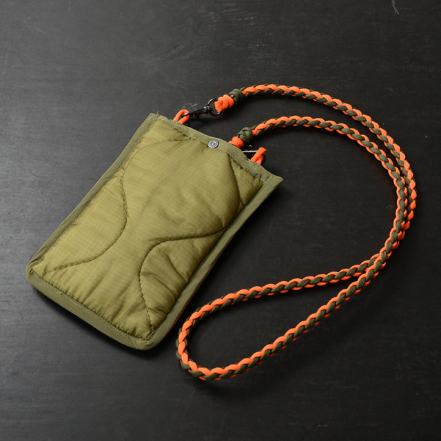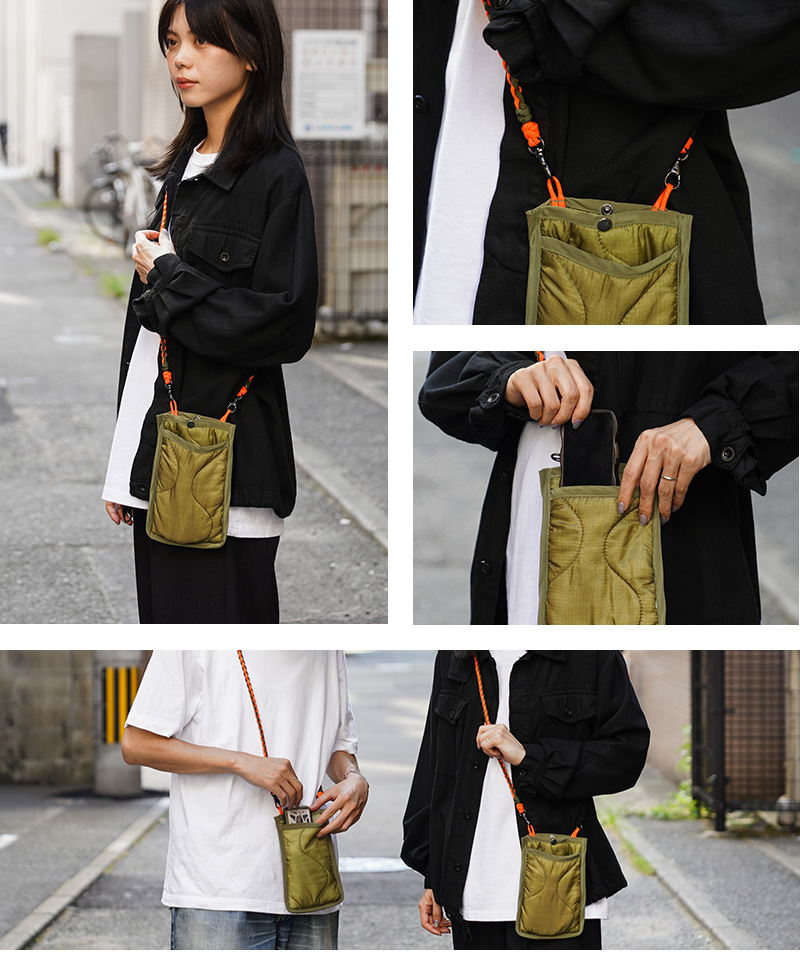 貴重なデッドストックのM-65ライナーをリメイクしたWAIPER.incオリジナルのサコッシュタイプのユーティリティーポーチが登場。素材にオニオンキルティングが特徴的な実物 新品 米軍 M-65ライナーを解体して使用。軽くて柔らかな質感のナイロンと、クッション性のある中綿がスマホなどの小物も優しく保護してくれます。フロントにポケット一つ、メインスペースはスナップボタンで簡単に開閉可能。フラットでシンプルな造りに、キルティングライナー素材ならではのボリューミーなルックスが加わった新鮮なデザイン。ショルダーストラップのリフレクター(反射素材)が織り込まれたパラシュートコードの鮮やかなカラーも魅力です。