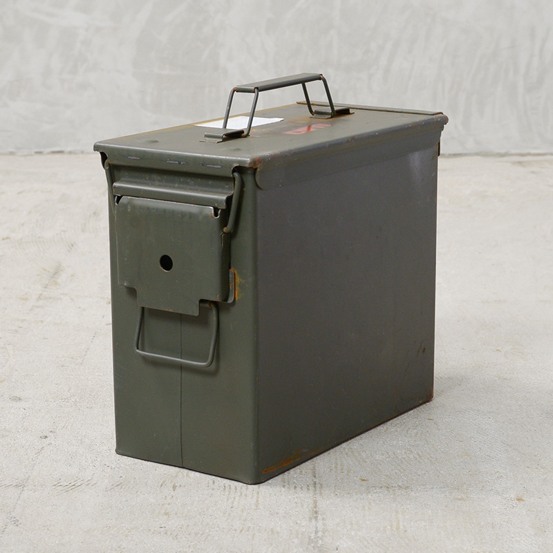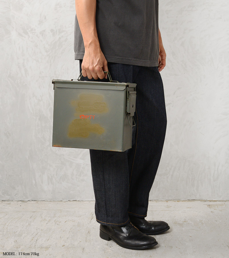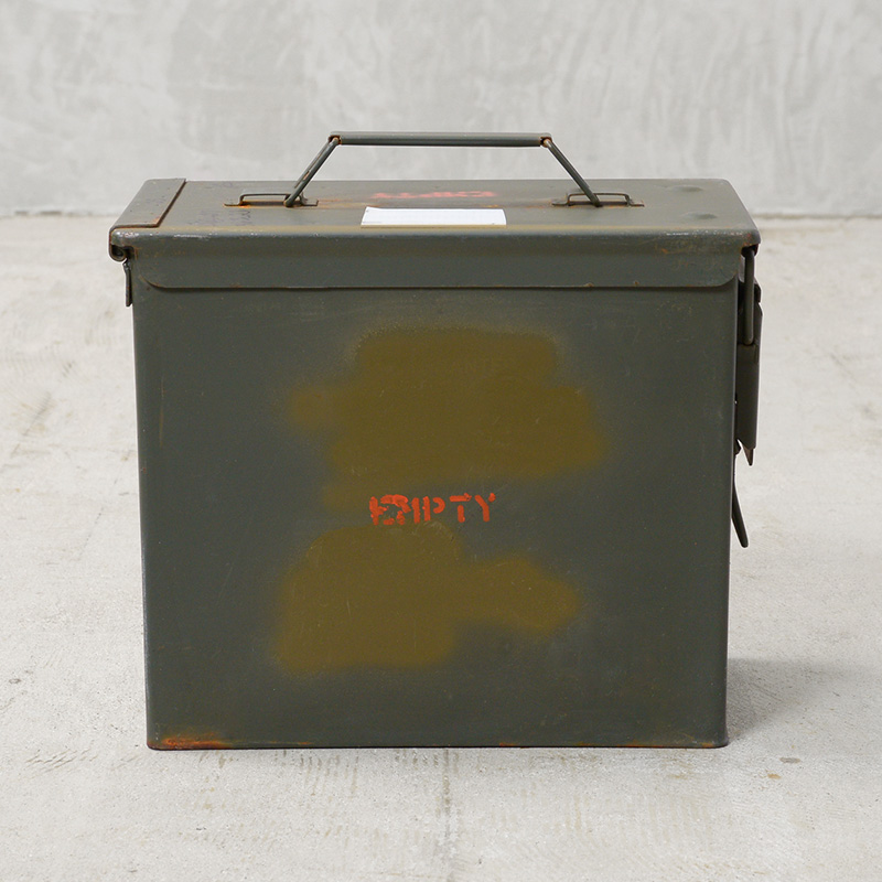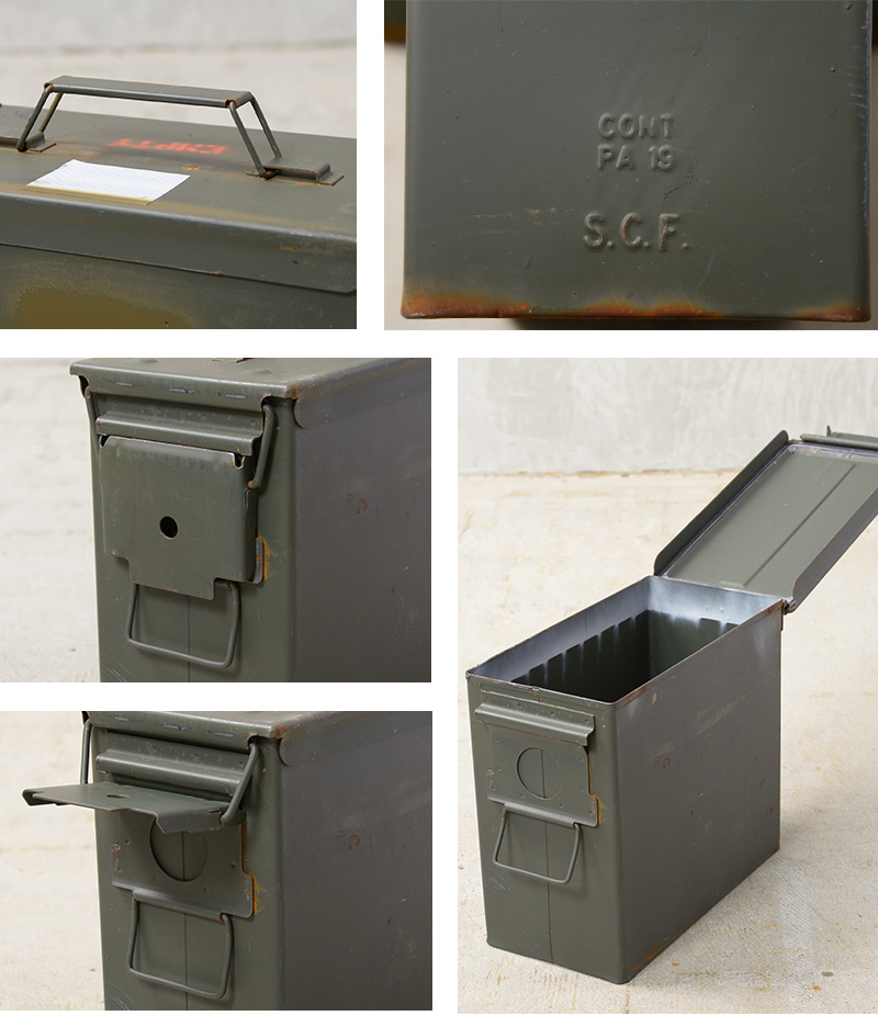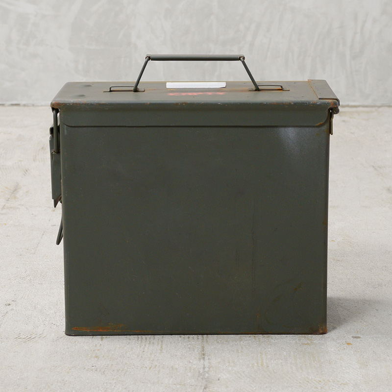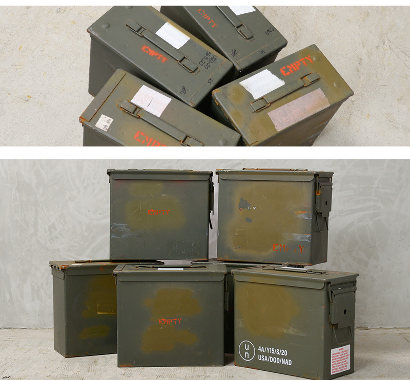 アメリカ軍で使用されていたスチール製の弾薬箱が入荷しました。M795 155mm榴弾用のFuze(信管)や 敵ミサイルへの対抗手段としてのDecoy Flare(デコイフレア)などを収納・運搬する為に設計された、非常に堅牢な造り。上部には手提げ用のハンドル、底部は積み重ねた時にガタつかない様に凹状になっています。シンプルですが機能的で、サープラスアイテムならではの無駄のない無骨なデザイン。道具入れや、ちょっとした小物の収納箱として、インダストリアル・ミリタリーティストのお部屋にインテリアの一部として取り入れるだけでより本格的な雰囲気を味わうことが出来るアイテムです。