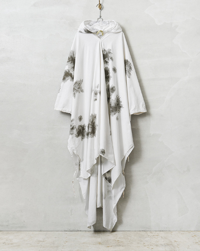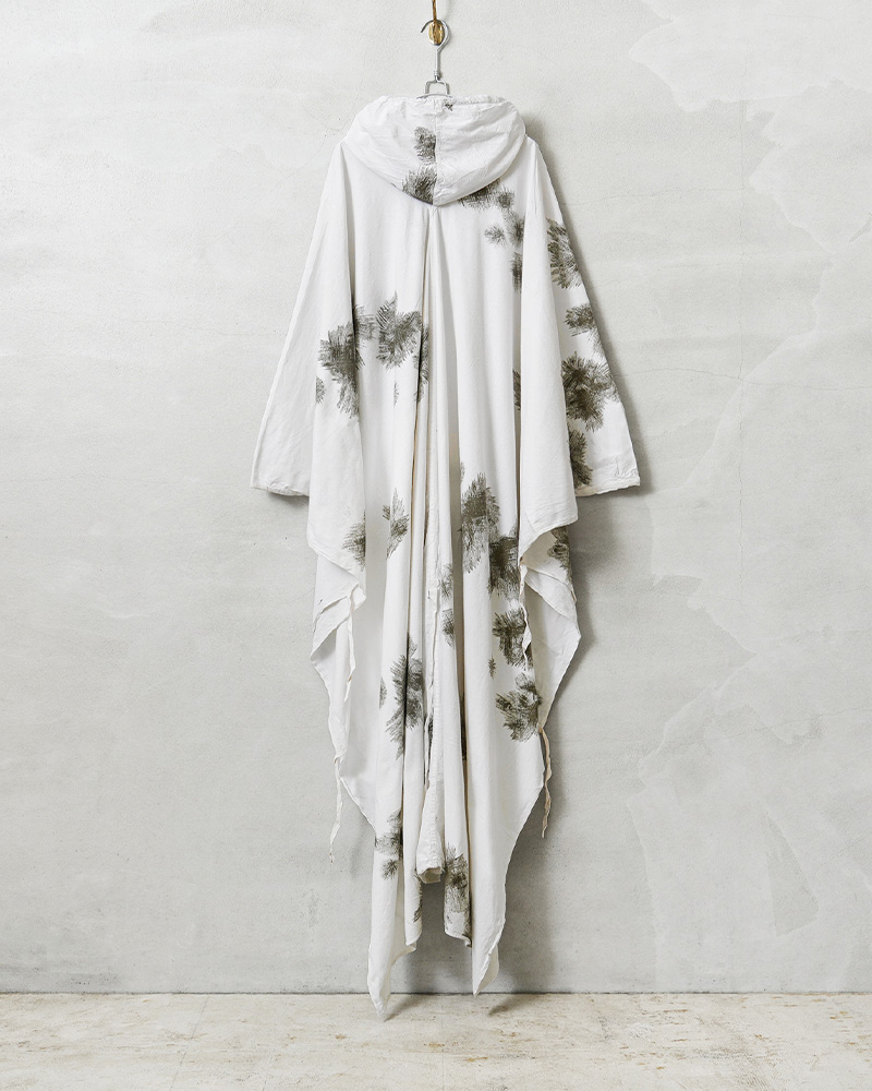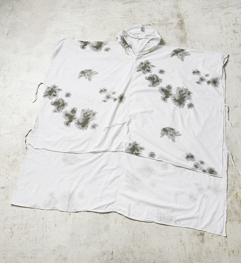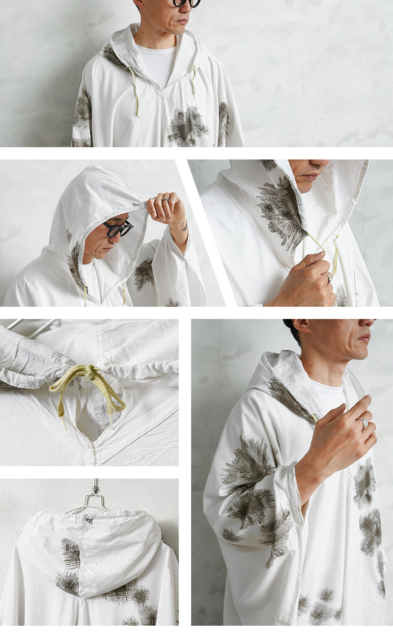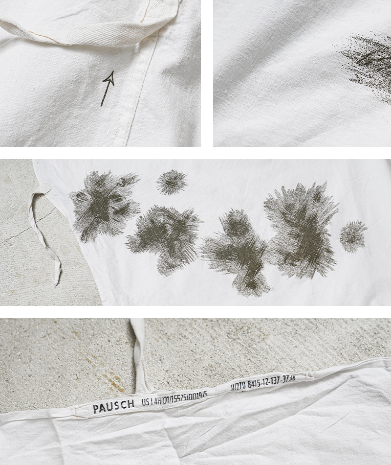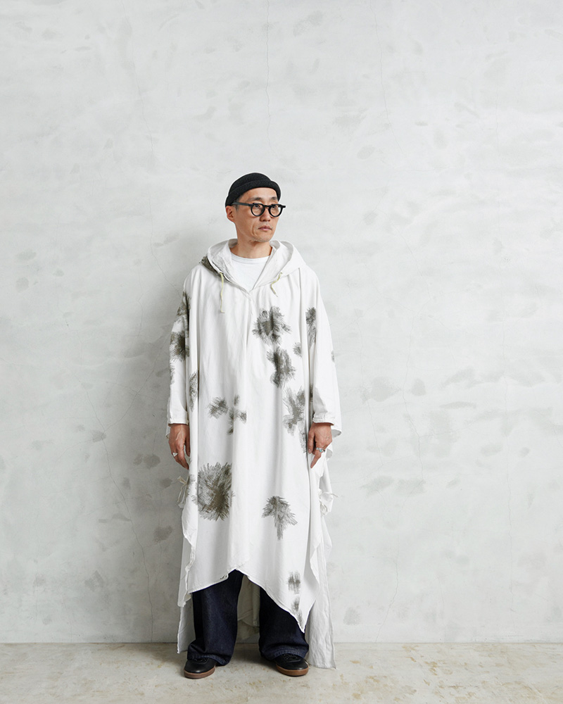 1960年代に採用されたドイツ軍の雪上迷彩ポンチョが登場しました。雪上でカモフラージュする為に開発されており、白地に、欧米で一般に「パインリーフカモ」と呼称される棘のある葉のような柄が印象的。松葉のような模様は、雪に覆われた木々や冬の植生に効果的なカモパターンです。本来、着用している衣服の上から被るポンチョで、身動きしやすく、その他様々な事に使用出来る様に大きめに作られています。サイドに2箇所、フロント、バック裾上にそれぞれ1箇所ずつ紐が付いているので自由自在に形を変形可能。フード部分はドローコードで絞ることができ、袖口にもしっかりと補強が入っています。人気の高いユーロミリタリーアイテムの中でも希少で、コレクションとしても見逃せないアイテムです。