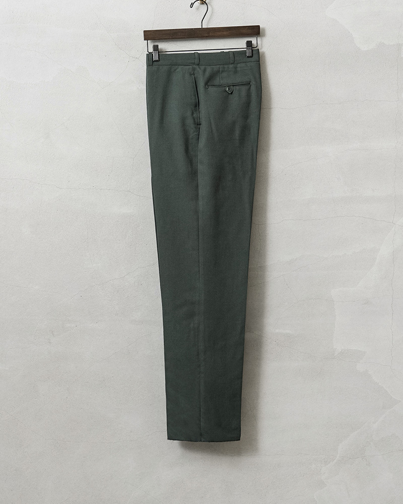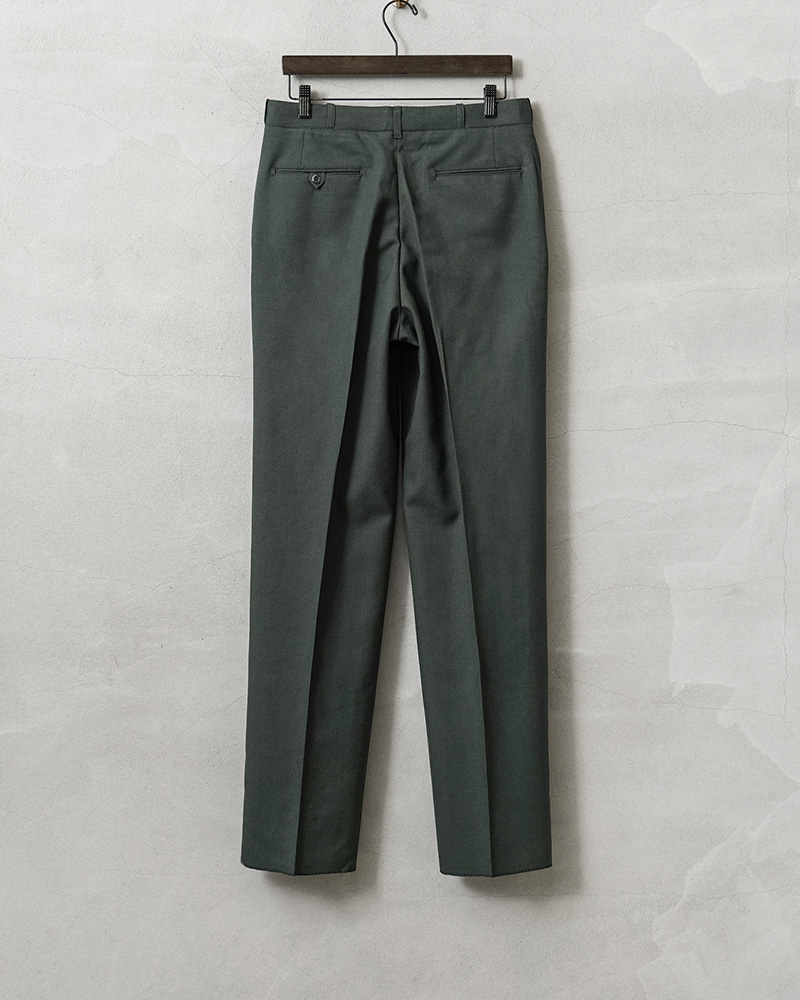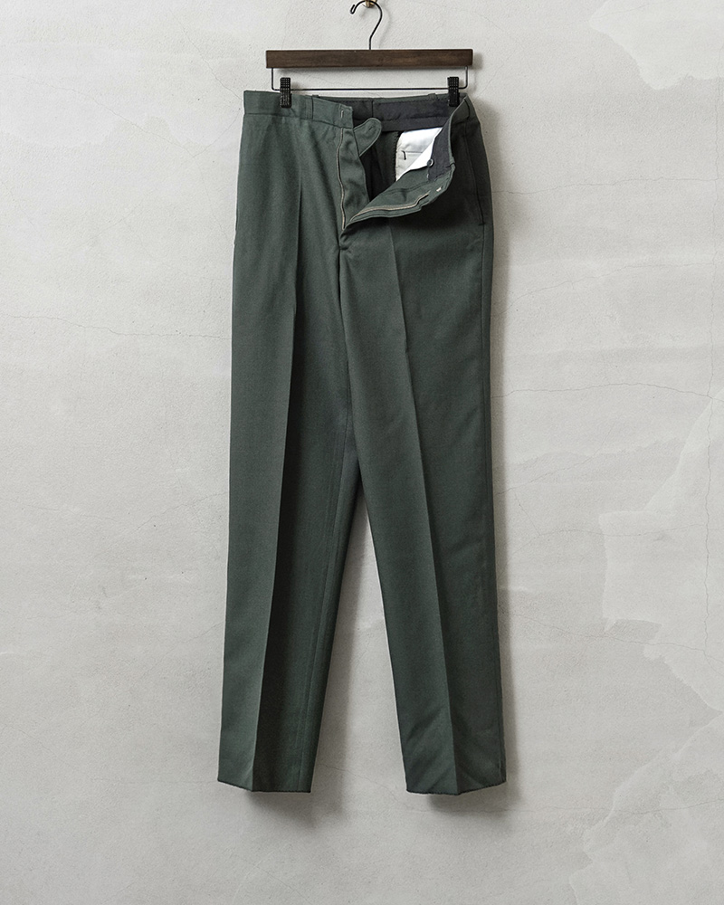 米軍(U.S.ARMY)で1950年代頃から使用されていたクラシックな雰囲気漂うアイテムで、正装時や常装として着用するサービストラウザーズです。高品質なウールサージ素材を使用したドレスパンツで、ウールサージは耐久性に優れ、綾織りの上質な素材感で風合い良く仕上がっています。ウールは冬は暖かく夏は涼しく、1年中適切な温度に保つように機能し、抗菌・防臭効果にも優れている素材です。上質なウール素材のトラウザーズをお探しの方にはぜひ手にしていただきたいお手頃なアイテムです!