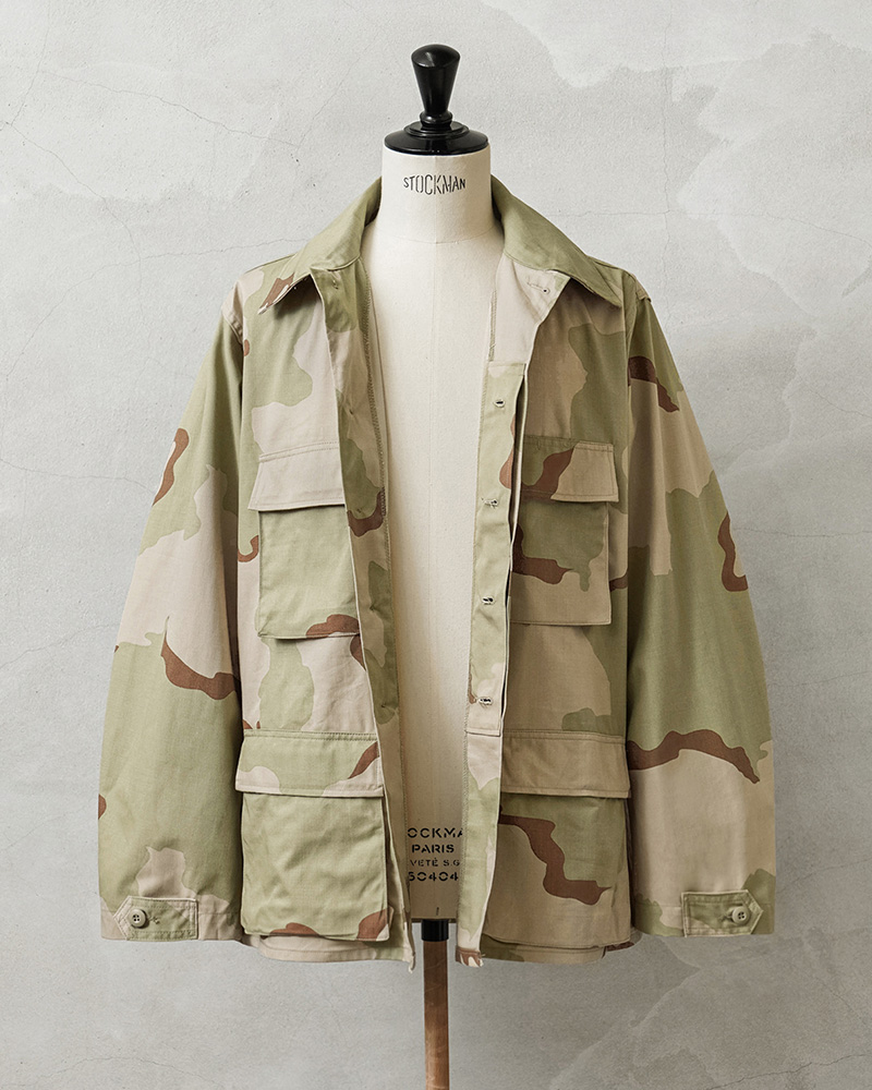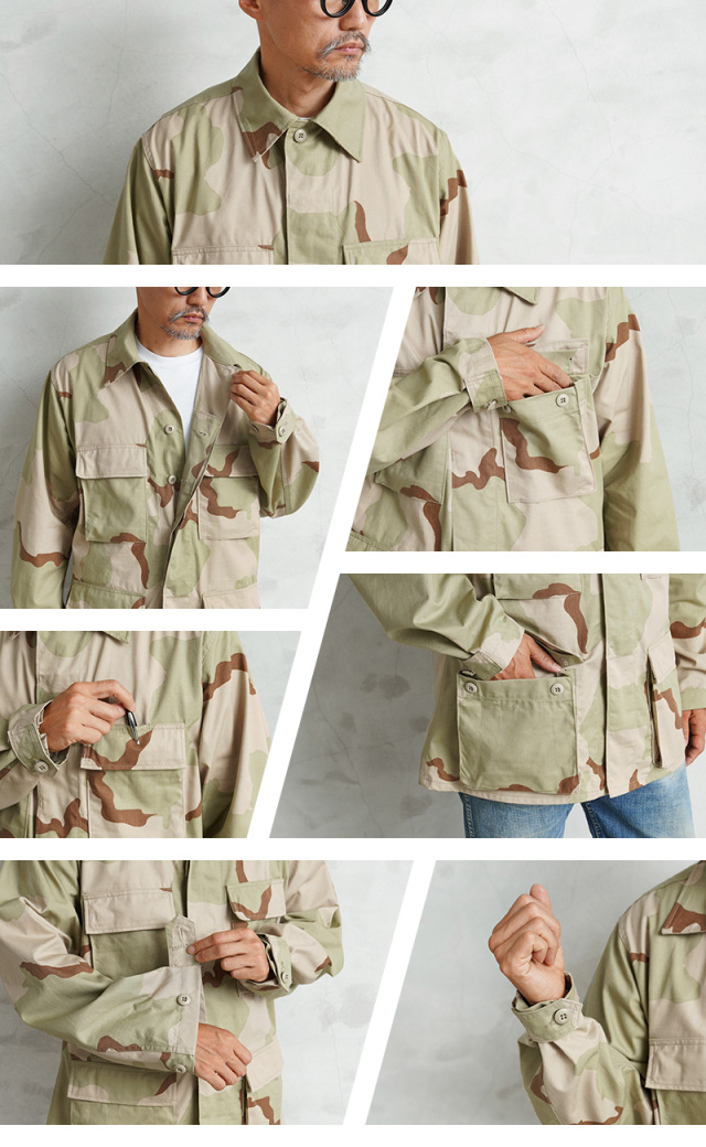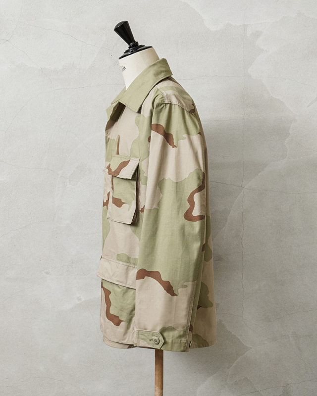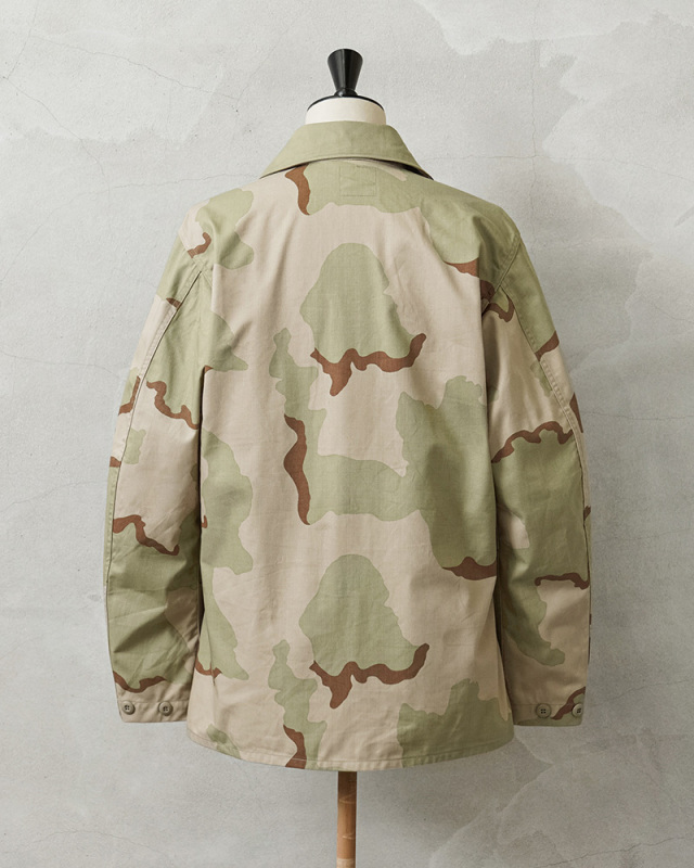 米軍において、1990年代初頭より全軍に採用されたDCUジャケットが入荷しました。フロント4ポケットのBDUジャケットと同様のデザインで、DCU(DESERT CAMOUFLAGE UNIFORM)という3カラーで構成された迷彩柄です。岩場の多い砂漠地帯を対象としていた6Cデザート(チョコチップ)カモの後継として誕生した3Cデザートカモは、岩の少ない砂漠地帯を対象として作成され、より有効性の高い迷彩パターンとして採用されました。アメリカ各軍で2005年~2012年頃まで使用され、その後もアメリカ陸軍特殊部隊のデルタフォースでは限定的に使用されていました。