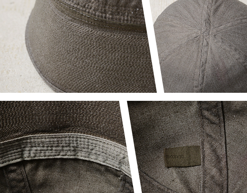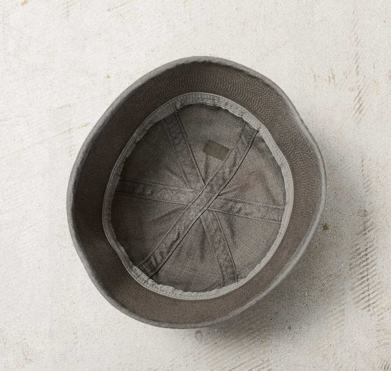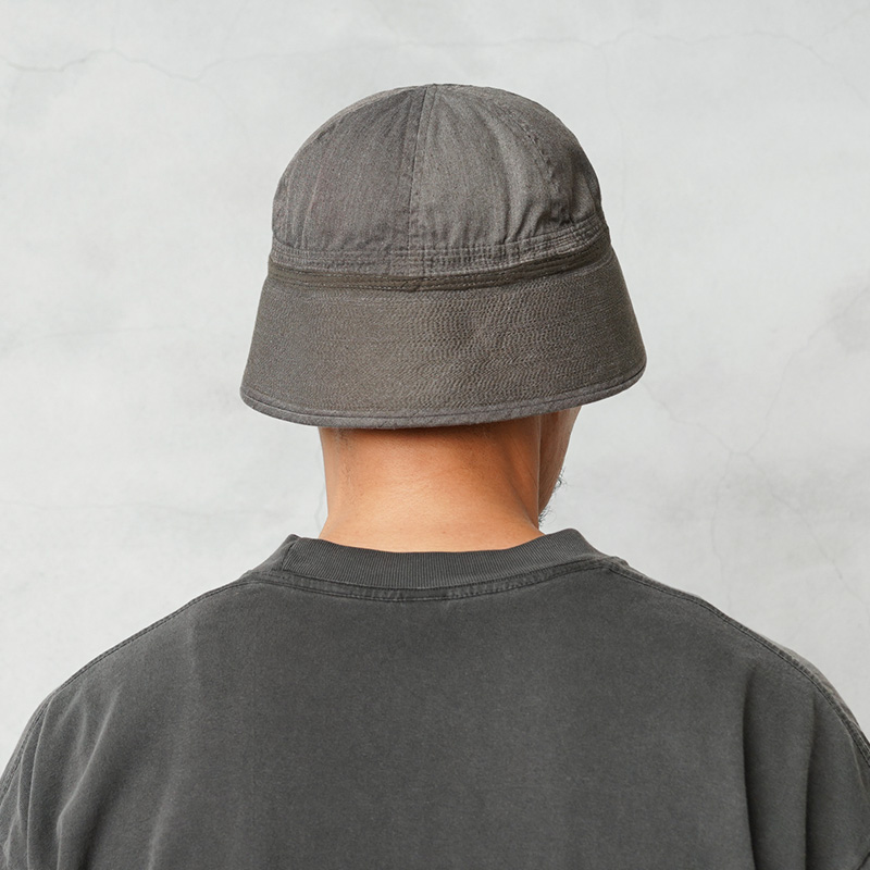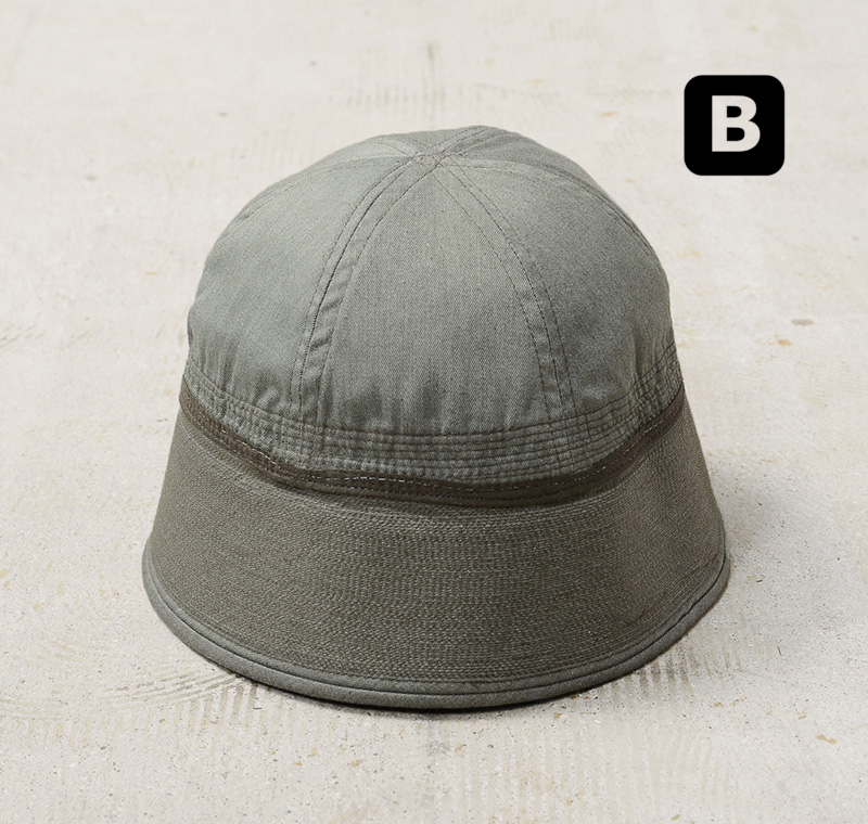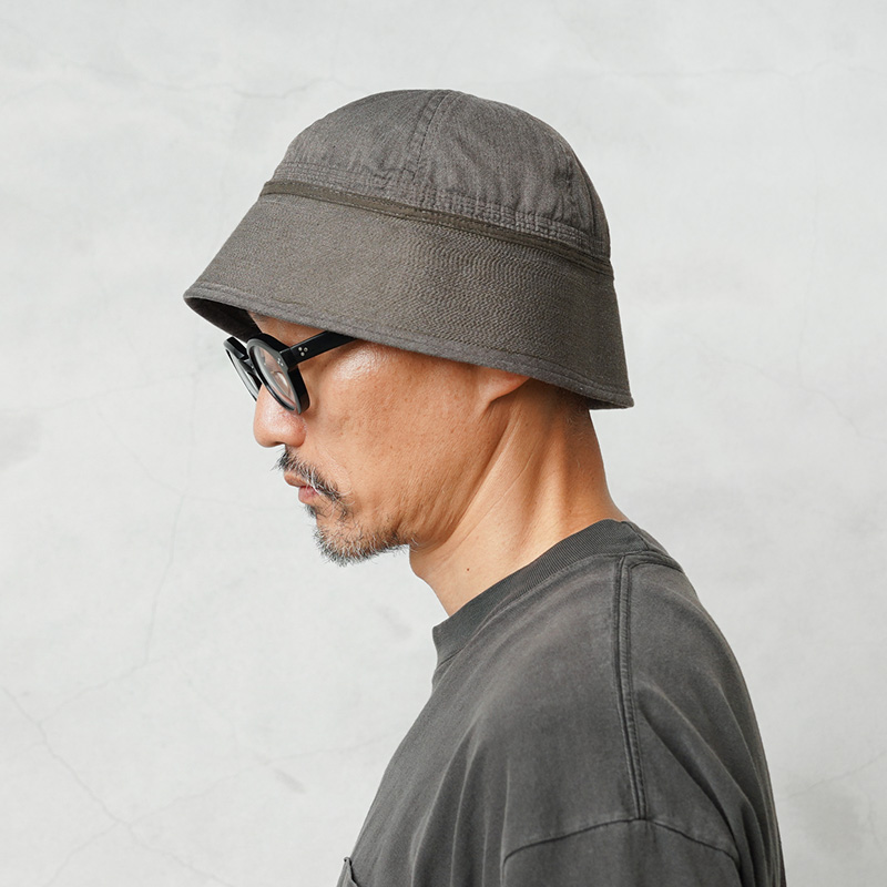 通称ゴブハットと呼ばれる水兵帽として広く認知され、アメリカ海軍で伝統的に着用されるセーラーハットのOLIVE染めが登場。“ゴブ”とはセーラーの俗語で本来のツバを折り替えしたルックスをいいますが、ツバをおろして目深にかぶったスタイルは現代のファッションコーデにもマッチします。6パネルクラウンに、強度を高めるためにツバの部分には非常に細かいステッチがはいった堅牢な造り。型崩れの心配もなく、スタイルを維持することが可能です。元々水兵帽らしい特徴的なホワイトカラーだったものを、丁寧に染職人の手によってOLIVE染め。よりファッションの一部として取り入れやすくなっています。