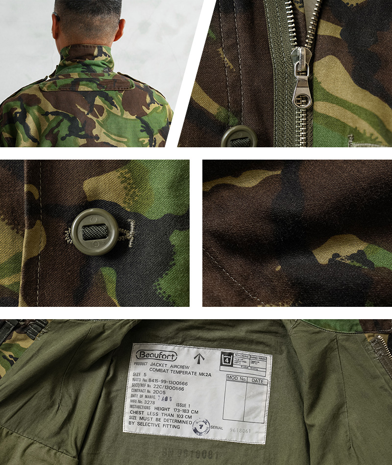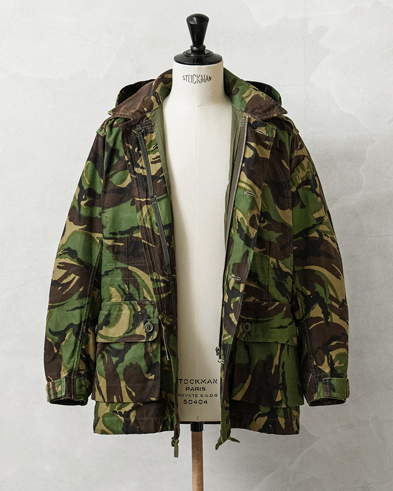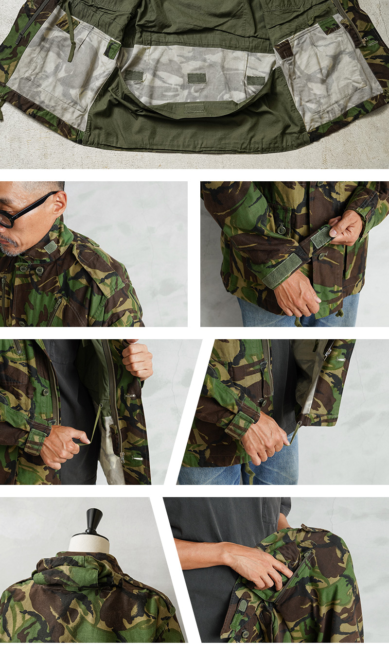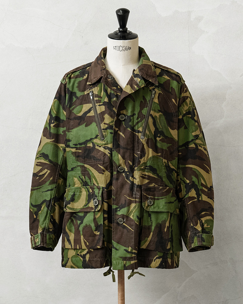 1970年代初頭~2000年代にイギリス空軍(RAF=Royal Air Force)で使用されたDPMカモを使用したMK2Aコンバットジャケットが入荷しました。RAFのアイテムでありながらDPMカモというのが珍しく、球数の少なさも相まって放出されることがほとんど無いレアアイテムです!胸元のDポケットのようなジッパー開閉のポケットが特徴で、ウエストにはマチ付きのフラップポケット、左袖には3連のペンホルダー、内側にはベルクロ開閉のフラップポケットと、背面下部にはゲームポットのように使える大型のポケットが備わったデザインです。