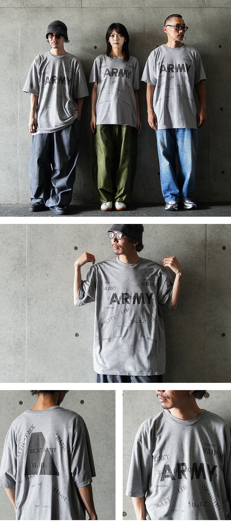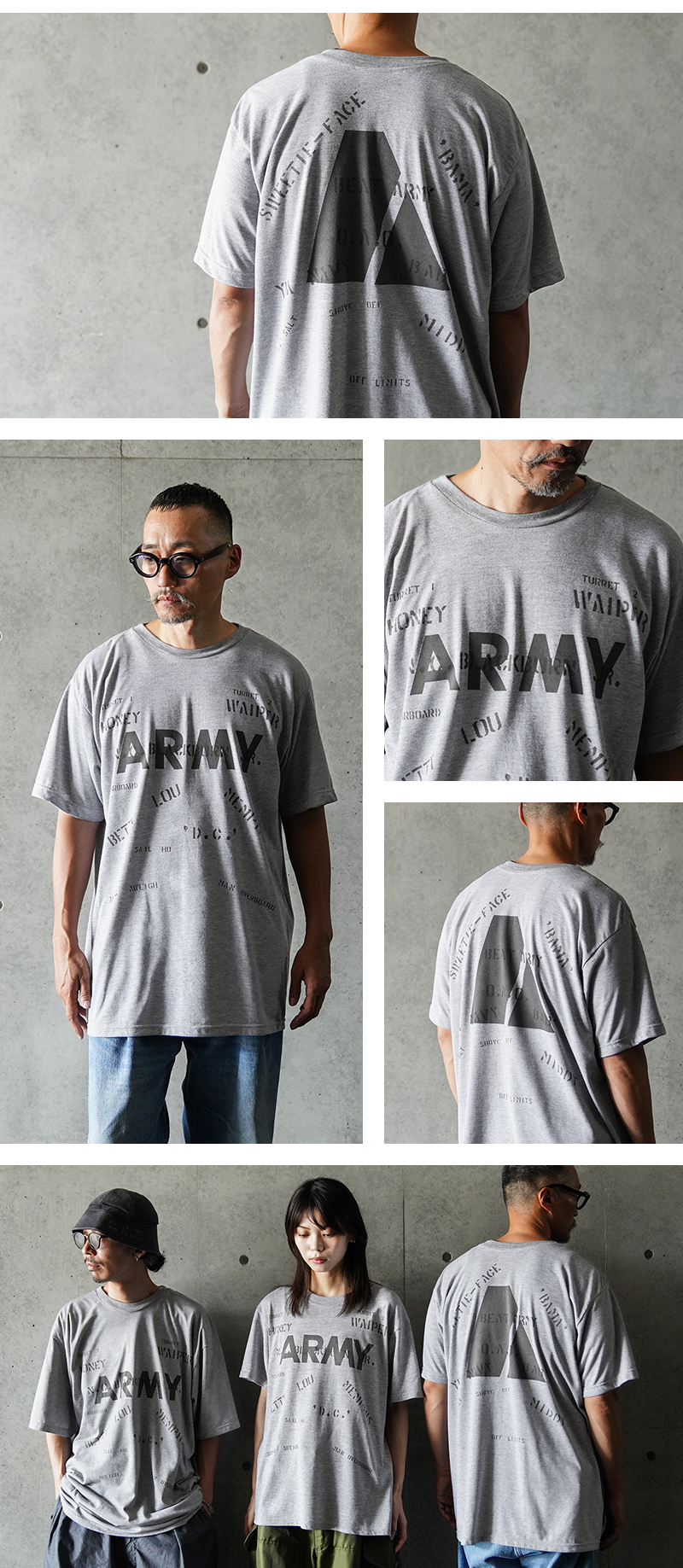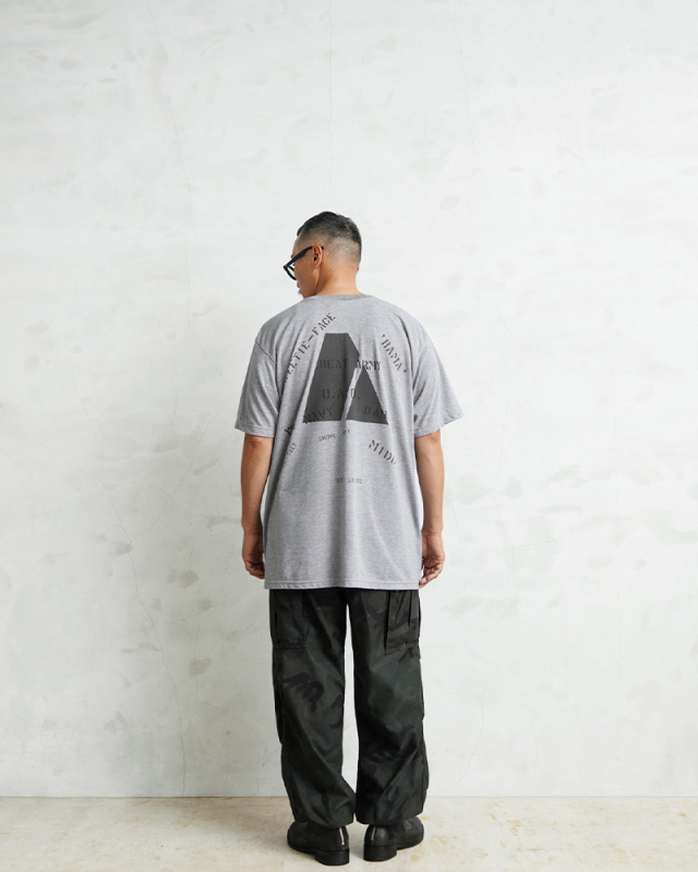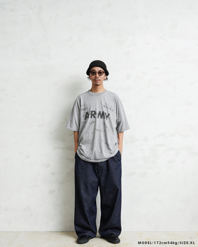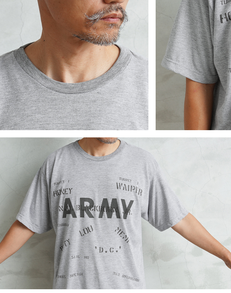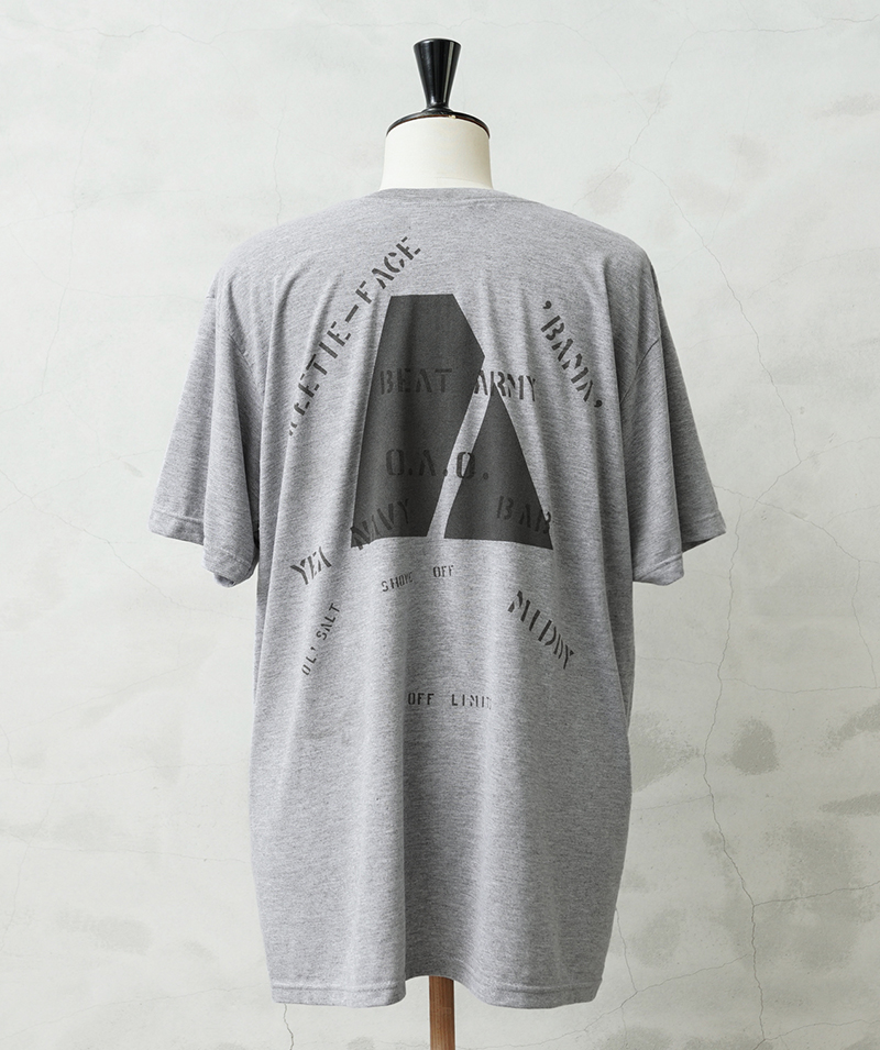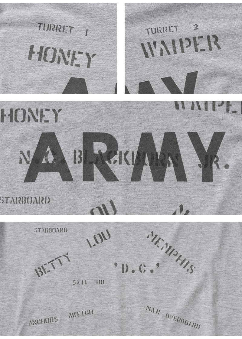 昨年ご好評いただいたベートーヴェンのオリジナルイラストに続き、今回は22種類ものステンシルを大胆にプリントしたリメイクTシャツが完成しました。 デザインソースは、アメリカ買い付けの際に出会った1940年代米軍のパジャマシャツ。 当時の兵士がカスタマイズしたであろう「総ステンシル」の雰囲気を再現し、メンズだけでなくレディースにもおすすめのユニセックスな一枚です。