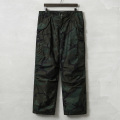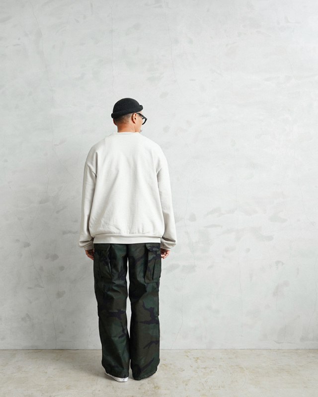 | 商品説明 | 実物 新品 デッドストック 米軍 M-65フィールドカーゴパンツ DARK WOODLAND CAMOのご紹介です。 制式名称:TROUSERS,COLD WEATHER,FIELD 米軍で1965年に採用されたフィールドカーゴパンツは現在ではデッドストックはもとより、USEDでさえも放出されることが無くなっているカーゴパンツのルーツを辿るには外せない希少な名作トラウザーズです。こちらは1981年から2005年頃まで米軍で採用されていたウッドランドカモにガーメントダイを施しました! 特殊な染色を行い、深くしっかりとブラックに染まったDEEP BLACKとは違い、もとの迷彩柄を残すように製品染めを施し、オリジナルのウッドランドデザインやカラーを活かしつつ、ダークトーンに仕上げています。 寒冷地で使用する際に中綿入りのキルティングライナーパンツをセットで装着するために多少ゆったりとしたシルエットでデザインされていますが、ライナーを使用しないのであればリラックスフィットで着用できるシルエットのカーゴパンツです。素材にはコットンナイロン混紡のバックサテンが使用されており、ドライタッチな素材感。耐風性にも優れた丈夫な質感のカーゴパンツです。 ウエストにはアジャスター付きでベルトなしでも着用できる仕様で、フラップ付きのサイドポケットとバックポケットは左右に2箇所づつ設けられており、ウエストの内側にも小型のウォッチポケットが備わっています。 マチ付きで大型のカーゴポケット内にはタイコードと呼ばれるカーゴポケットのサイドから引き出して使用するストラップが付属しています。怪我をした際の止血や、クロッチ部分のループに通してカーゴポケットを縛ることで収納物の音を立てないようにするための目的で付けられている特徴的なディテールです。 膝部分には膝を曲げた際に突っ張らないように2箇所のタックが入れられています。裾にはドローコード付きで絞って着用することでシルエットに変化を持たせて着用できます。細部にまで様々な画期的な機能が追加され、多くのブランドがリプロダクトしている点を見ても、服飾史に於いて重要なカーゴパンツと言えます。 近年では出回ることが非常に少なくなった未使用のデッドストック品を贅沢に使用しています。あるうちに手に入れておきたいミリタリーアイテムの1つです! |
