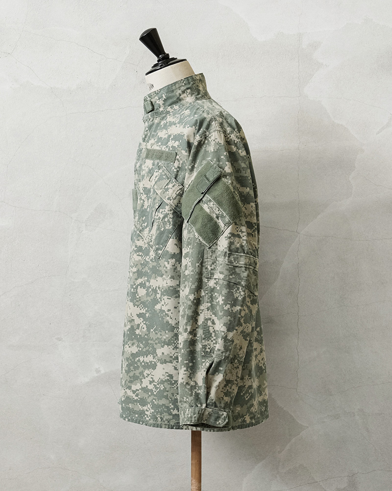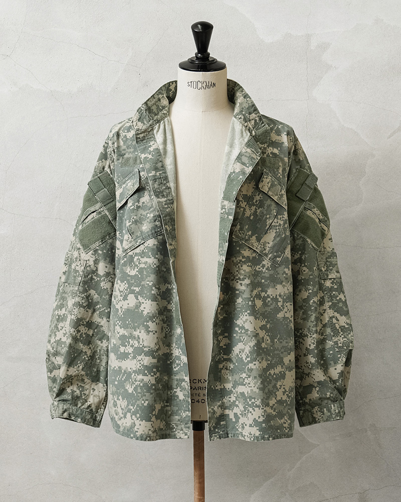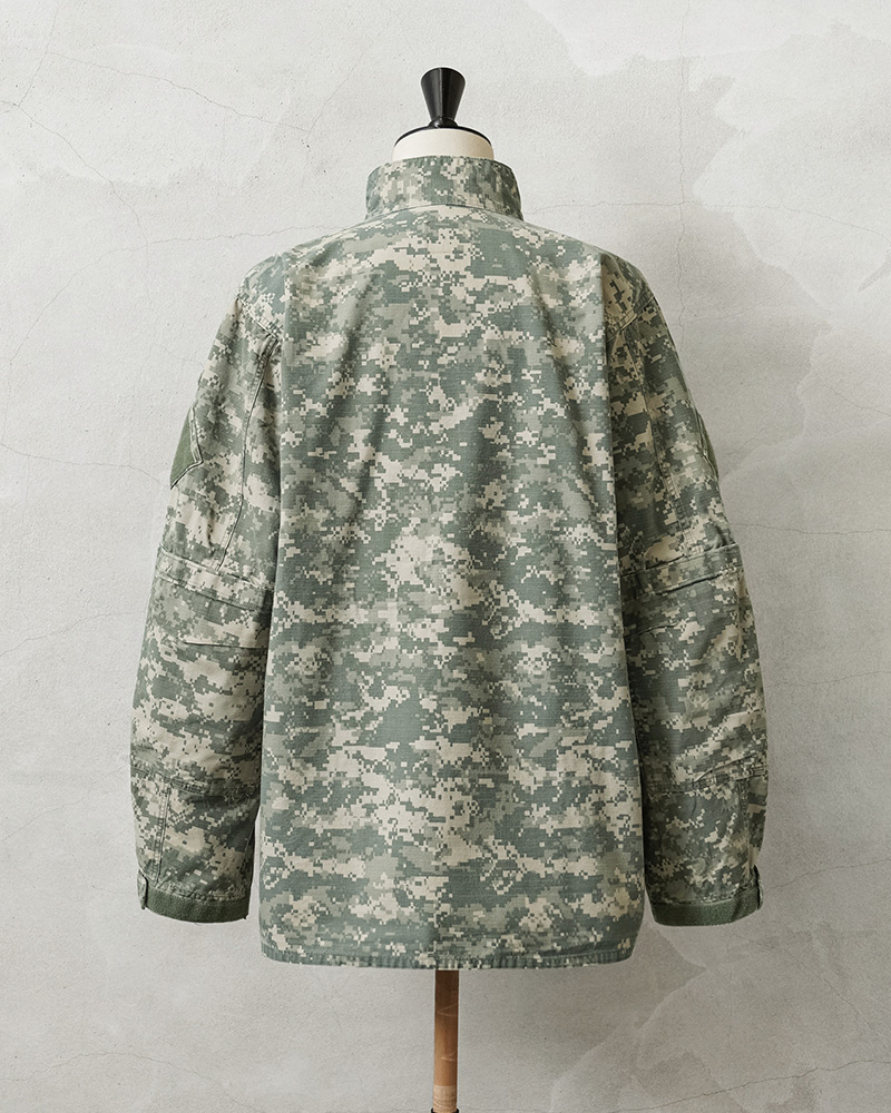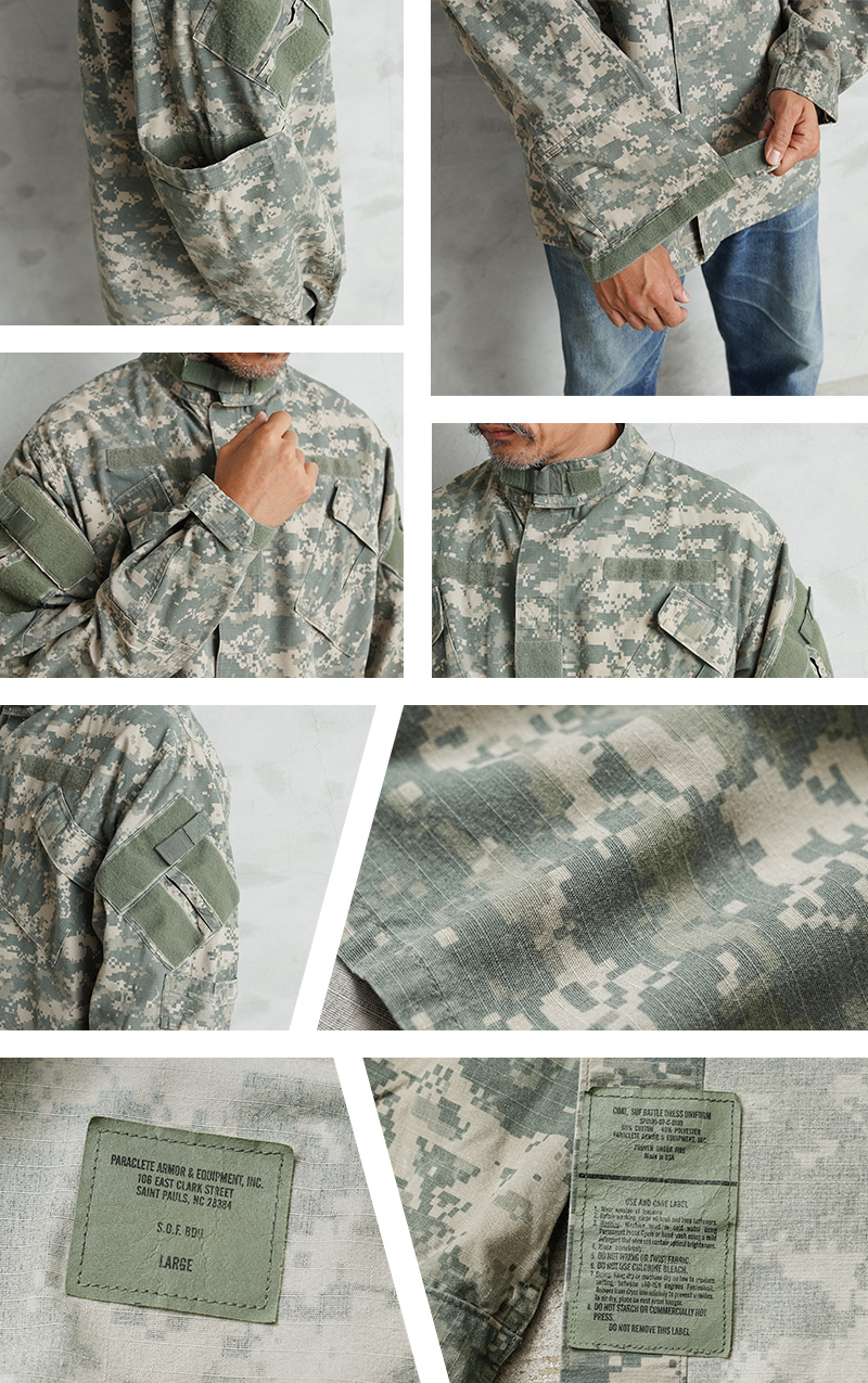 米軍特殊部隊や連邦法執行機関の特殊部隊にプロフェッショナルウェア&ギアを供給していたPARACLETE(パラクレイト)が手掛けた、UCP迷彩の特殊作戦部隊(Special Operations Forces)SOF BDUジャケットです。特殊部隊向けに開発された戦闘服で、一般的なアメリカ軍のBDU(Battle Dress Uniform)をベースにしつつ、より実戦的な改良が加えられています。生地はコットンポリのリップストップを採用し、軍規格に準じた耐久性を実現しています。UCP(Universal Camouflage Pattern)のデジタルカモフラージュは、著名人にも愛用される人気の迷彩パターンです。