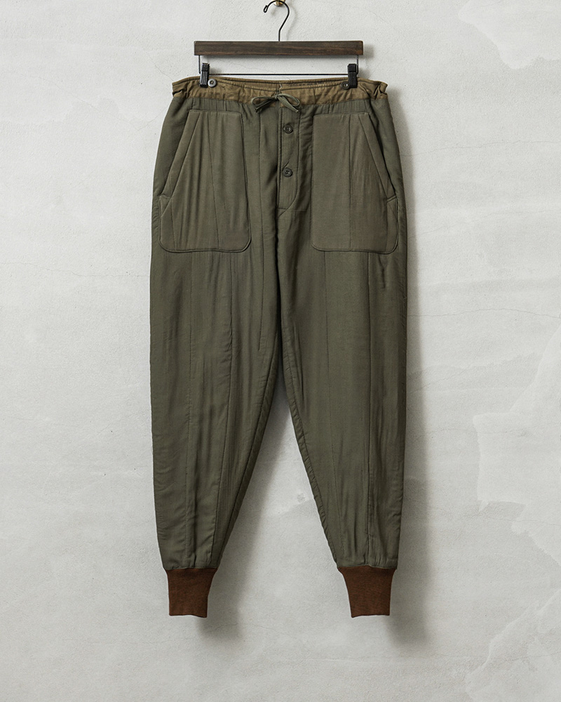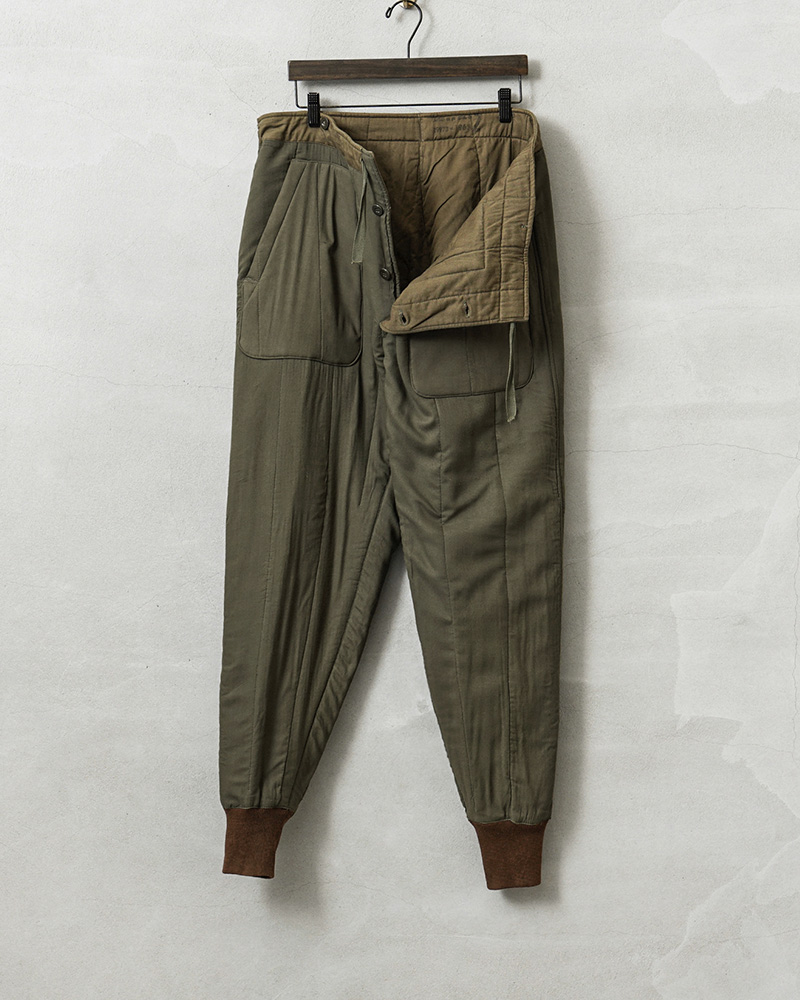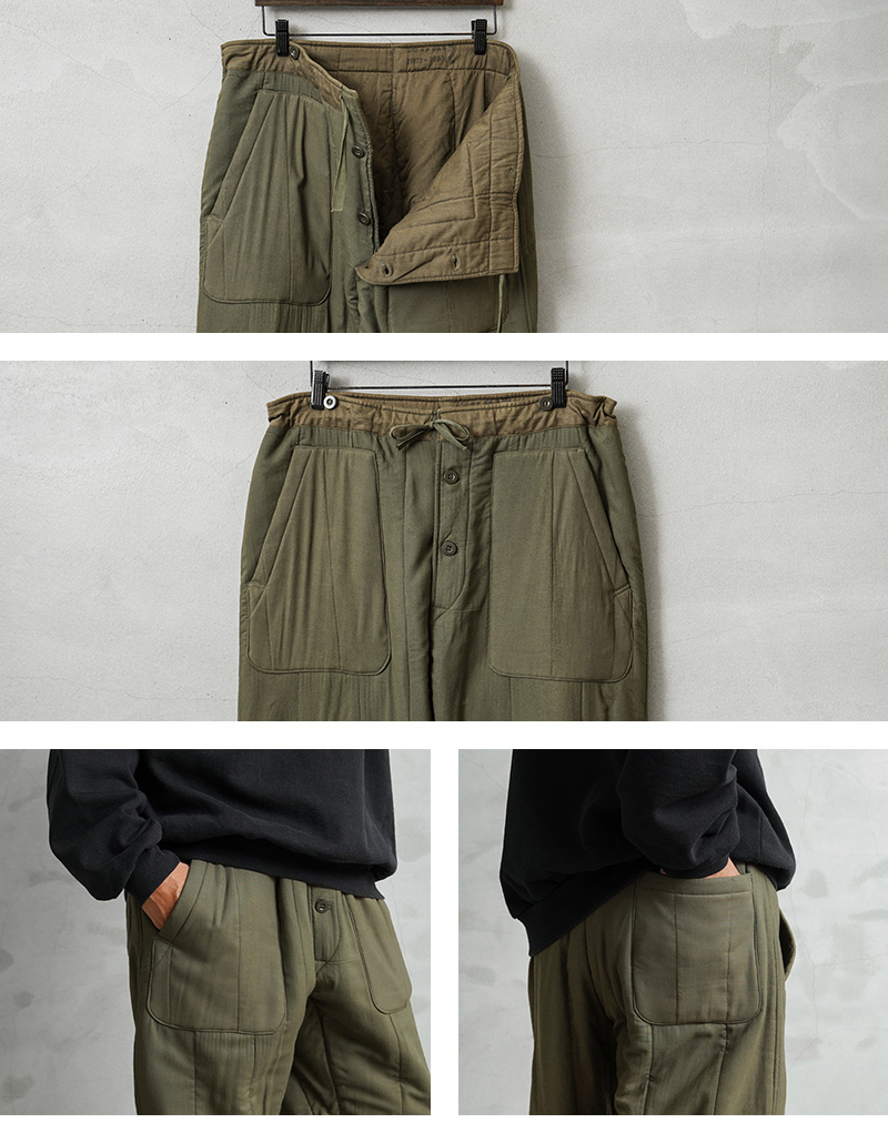 チェコ軍より放出されたパンツライナーをさらに使いやすいように雰囲気の良いパッチポケットとバックポケットをデザインしてリメイクを施しました。パッチポケットにも実物のパンツライナーを使用しています。ポケットの配色も様々で1点物の存在感を放つ仕上がりのパンツになりました!生地は厚手ながら柔らかいコットンで、中綿入りのため保温性に優れています。