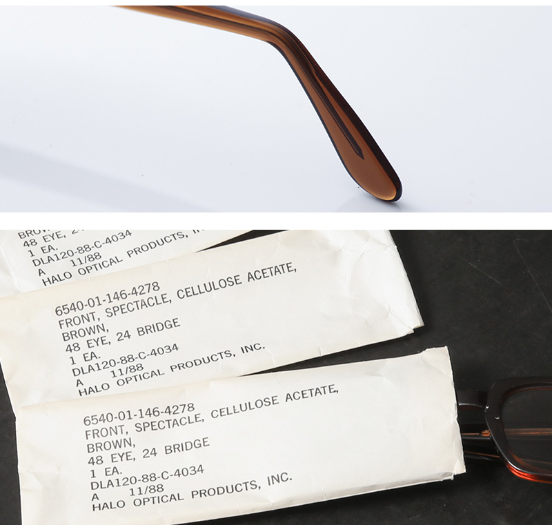 実物 新品 1980's 米軍 Halo Optical Military Official G.I. Glasses 【S9】アイウェア 鯖江レンズ BREEZE NAVY のご紹介です。米軍にて視力の悪い軍関係者に支給されていた眼鏡です。【G.I.】 は“Government Issue”の略語となり軍官給品につけられる名称となるため【G.I. Glasses】と呼ばれています。G.Iグラスは1950年代より支給が開始され何度かのモデルチェンジを経ていますがこの眼鏡は70年代後半より採用された最終型【S9】モデルとなります。スクエア型のシェイプにセルロースアセテート素材だからこその鮮やかな透け感のあるブラウンが特徴。7バレルヒンジ&マイナスネジがレトロな雰囲気を放ちつつも太めのフレームとテンプルにつく2ドットのヒンジが無骨さを醸し出す絶妙なバランスがとれた眼鏡です。